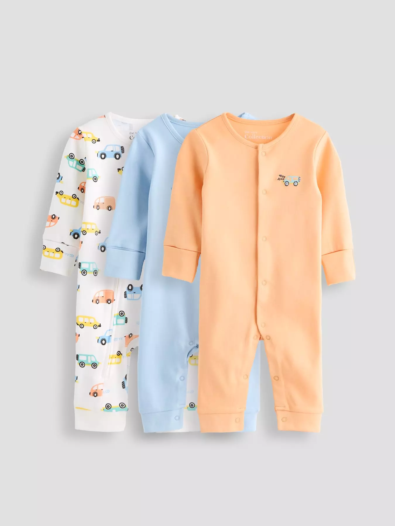 - A practical everyday essential, this three-pack of sleepsuits is designed for comfort and easy wear. Featuring playful transport designs, they’re ideal for little ones.