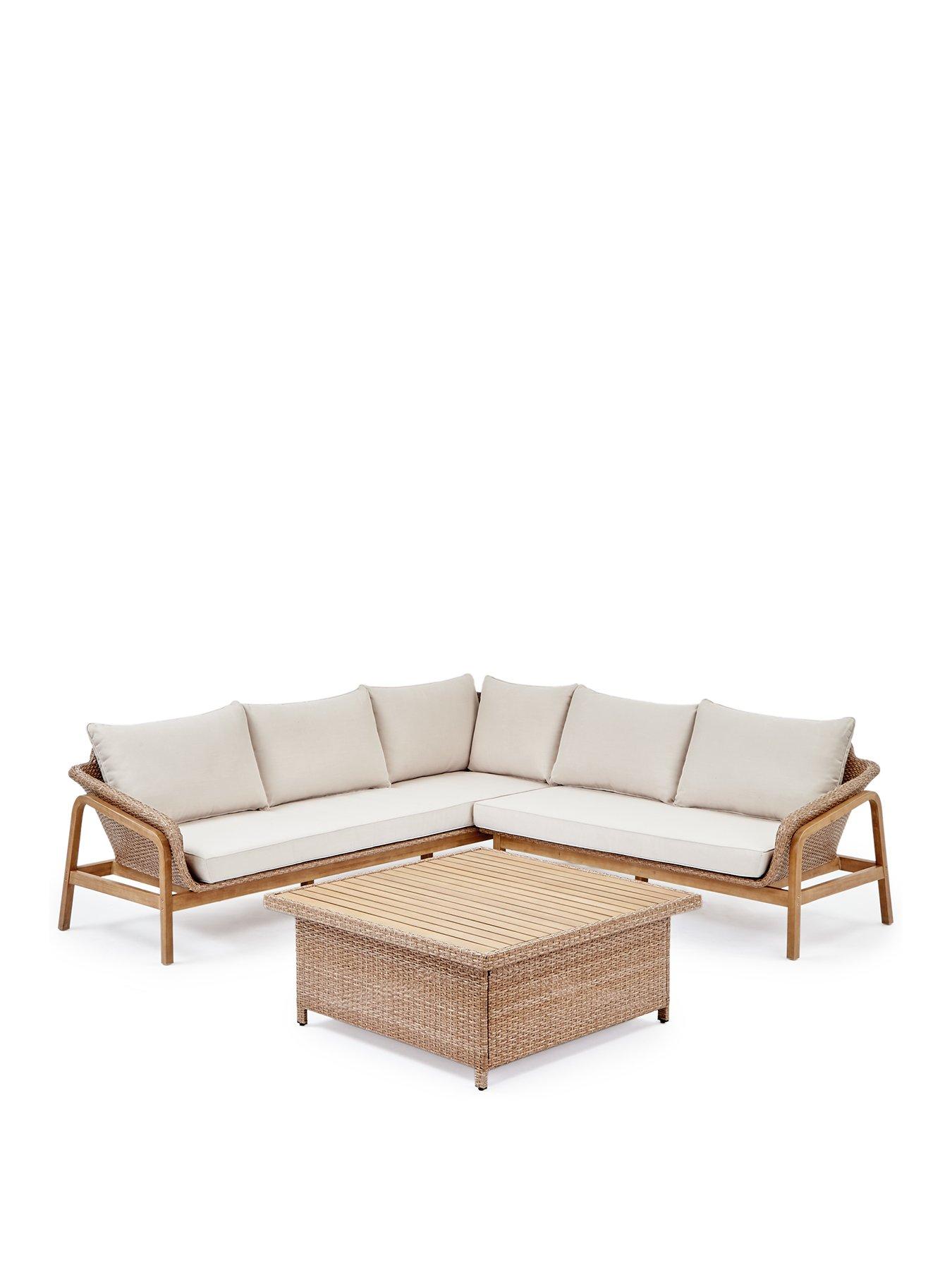 Sit back and make memories with your loved ones around the Cameo Corner Dining Set with Lift Up Table.When assembling, we recommend that the screws are not fully tightened until all the parts have been put together.RAISE THE BAR ON GARDEN DESIGN Take leisure to the next level. This set is the perfect way to kick back and spend time with your loved ones - from brunch through to those magical sunsets. With a table top that lifts to give extra height, it is ready to serve as the perfect centrepiece for your garden or patio entertaining. BUILT TO LAST The durable steel powder-coated frame and flat wicker design, ensure that this wonderful statement piece will stand the test of time. ACACIA WOOD Acacia wood is the gold standard when it comes to outdoor furniture. It has a beautiful, premium and traditional wood finish that brings elegance opulence to any outdoor space. It is naturally resistant to water, rot and insects, making it the ideal for both wet and dry climates – which as we all know, can happen in the same day in the UK! It is easy to maintain, requiring treatment only once a year. Please note: We recommend you store all cushions in a shed, garage or other dry sheltered place when not in use. We offer handy storage bags to help, please see QUVMC and VVFF3. Alternatively, browse our outdoor furniture cover range which can be used to protect the full set.