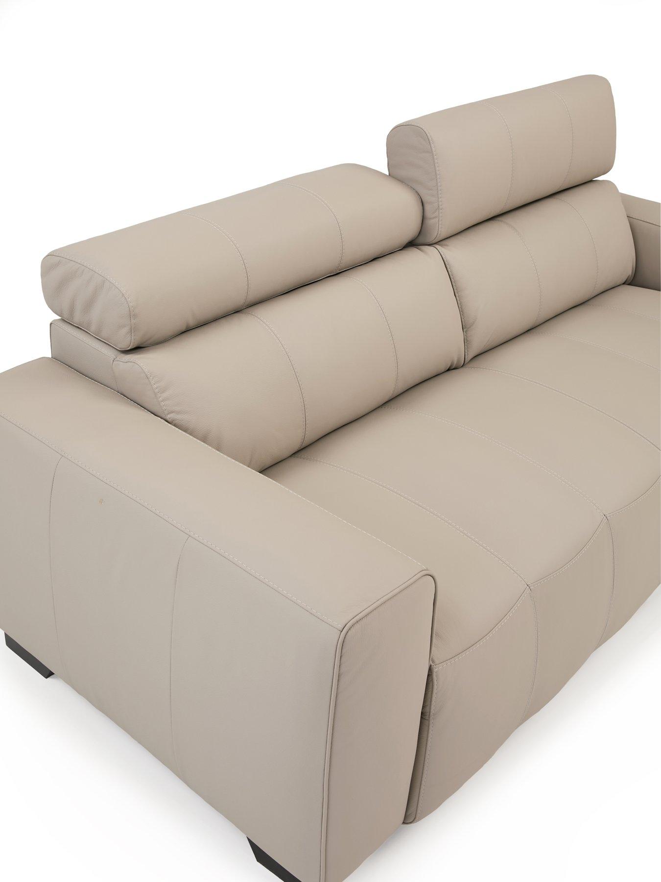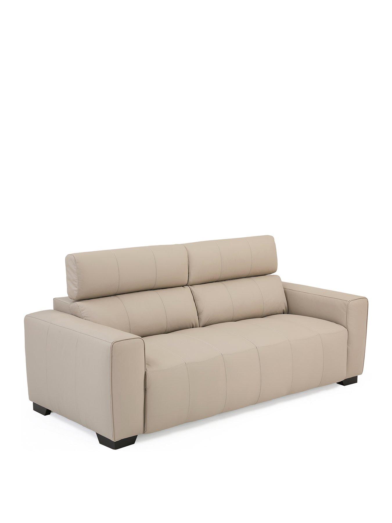 Very Home Cannes 3 Seater Italian Leather Sofa in Light GreyH 94 x W 208 x D 99 cmPremium leather This modern sofa from the Cannes collection by Very Home is all about the pure premium leather that covers its minimal lines and comes in a light grey hue. The ratchet headrests can be adjusted to suit your seating position, while the fibre-filled back cushions and pocket sprung seats with a foam core and fibre wrap are fixed to prevent them sliding out of place. Finished with dark block feet for an eye-catching colour contrast. Free Swatch Service Get a feel for this fabric before you buy with our FREE swatch service. Simply email SwatchOrder@ClickSpares.co.uk with your name and address, along with the sofa range name, item number, colour choice and the name of the retailer’s website you’re ordering from. Your swatches will be delivered within 5 working days (subject to availability). Please remember to measure your available space before ordering. Dimensions: Height 94, Width 208, Depth 99 cm