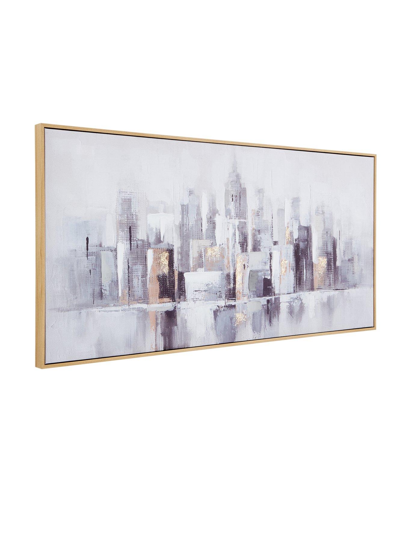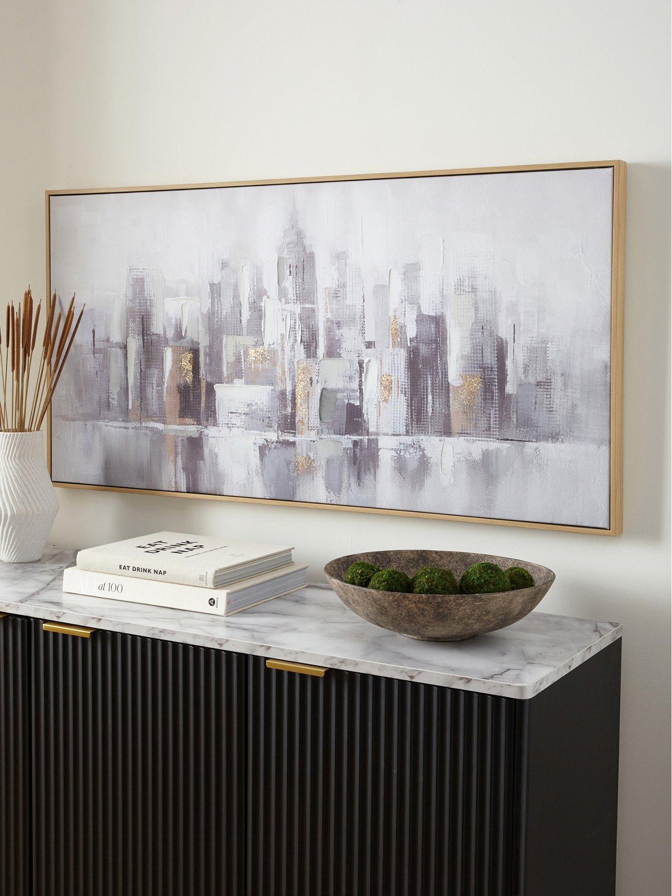 Very Home Capped City Landscape Foiled Canvas with Hand-Painted Embellishments – 60 x 120 cmAdd a sense of elegance to your interiors with this stunning canvas art piece from Very Home.Showcasing the skyline of a bustling, busy city, skyscrapers and tower blocks can be seen reflected in the waters below the buildings. Hand-painted elements in a greyscale palette are lifted by glittering golden highlights, which create the impression of twinkling lights emanating from the windows of each structure. Measuring 60 x 120 cm, this piece is presented in a capped frame for a contemporary finishing touch.