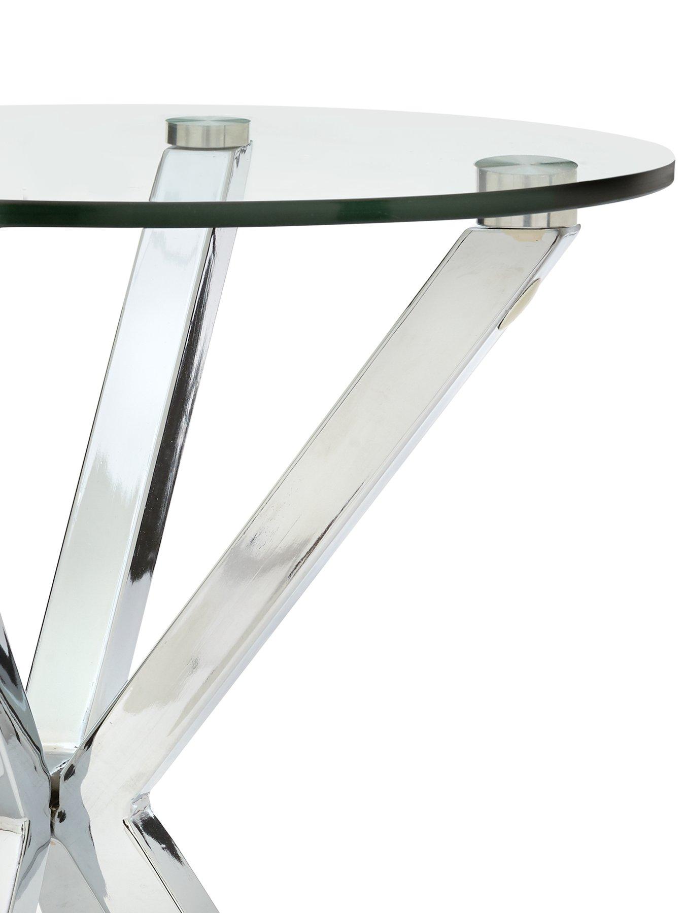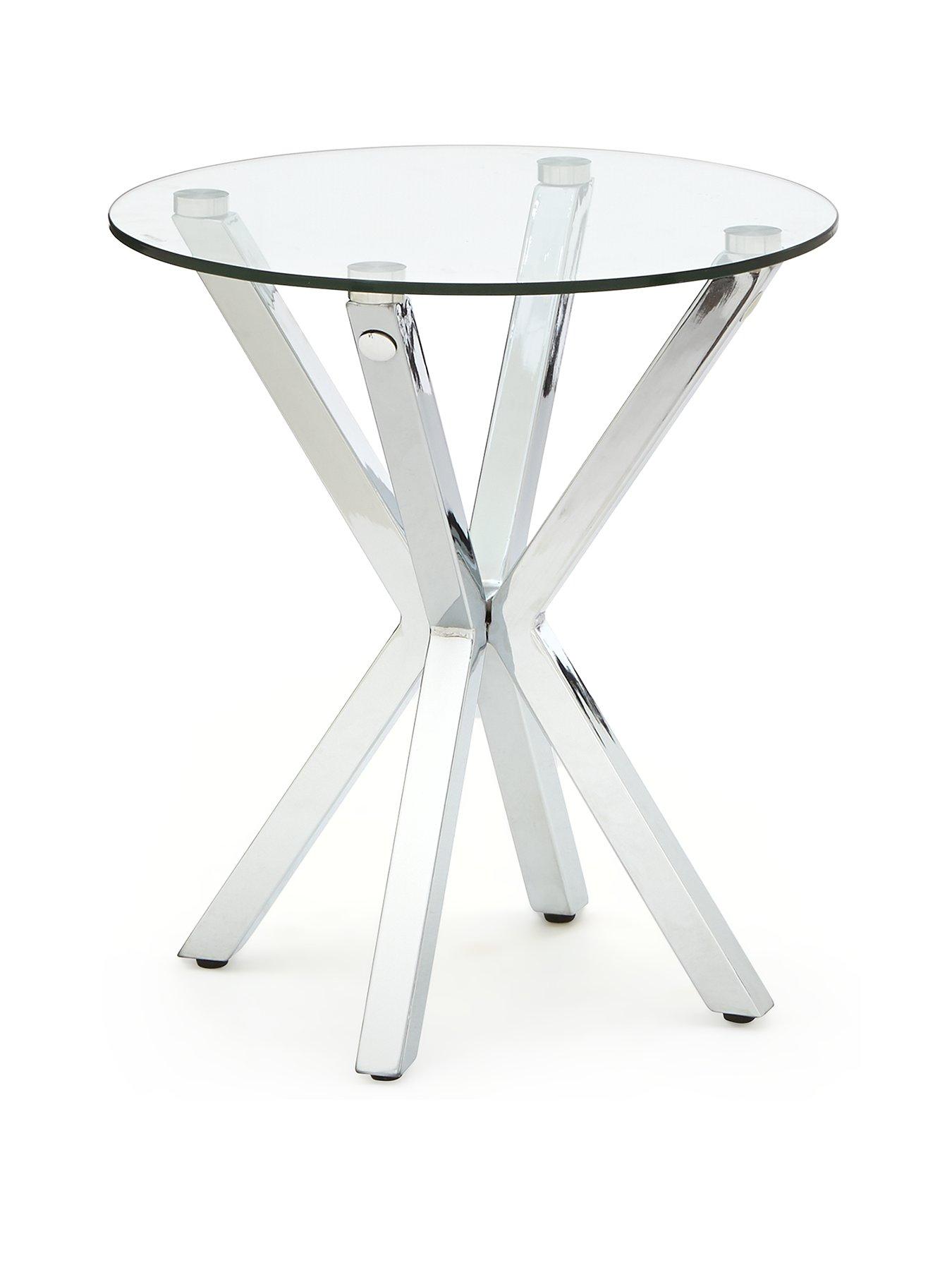 Chopstick Lamp Table in Glass and ChromeA contemporary mix of practical function and dazzling design, this lamp table will transform your living space.Four cool coloured 'chopstick' legs come together at their centre points, creating a striking base, and their sleek shine matched by is a smooth circular glass table top. Please remember to measure your available space before ordering. Dimensions: Height 50, Diameter 45 cm