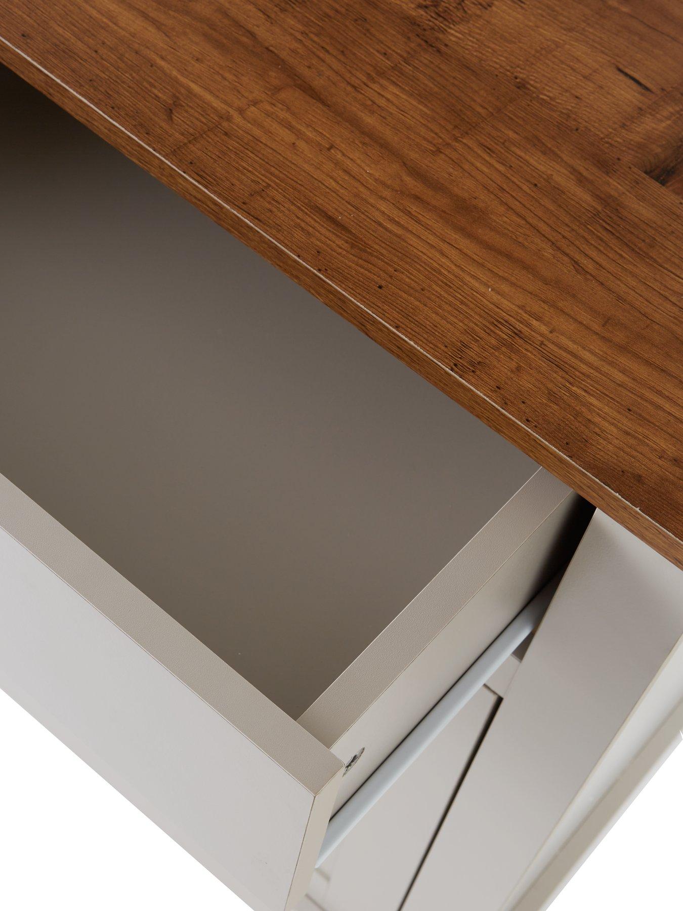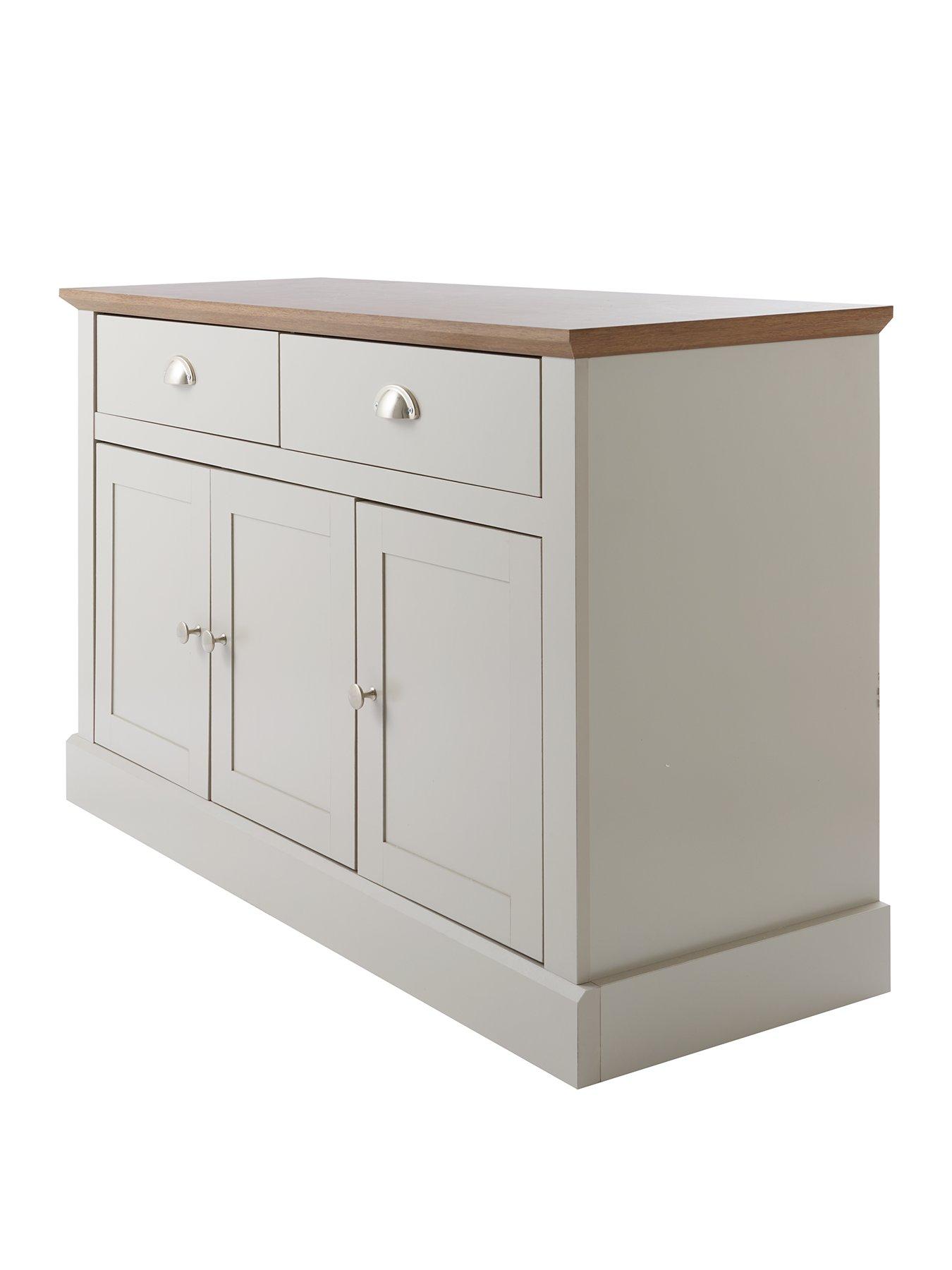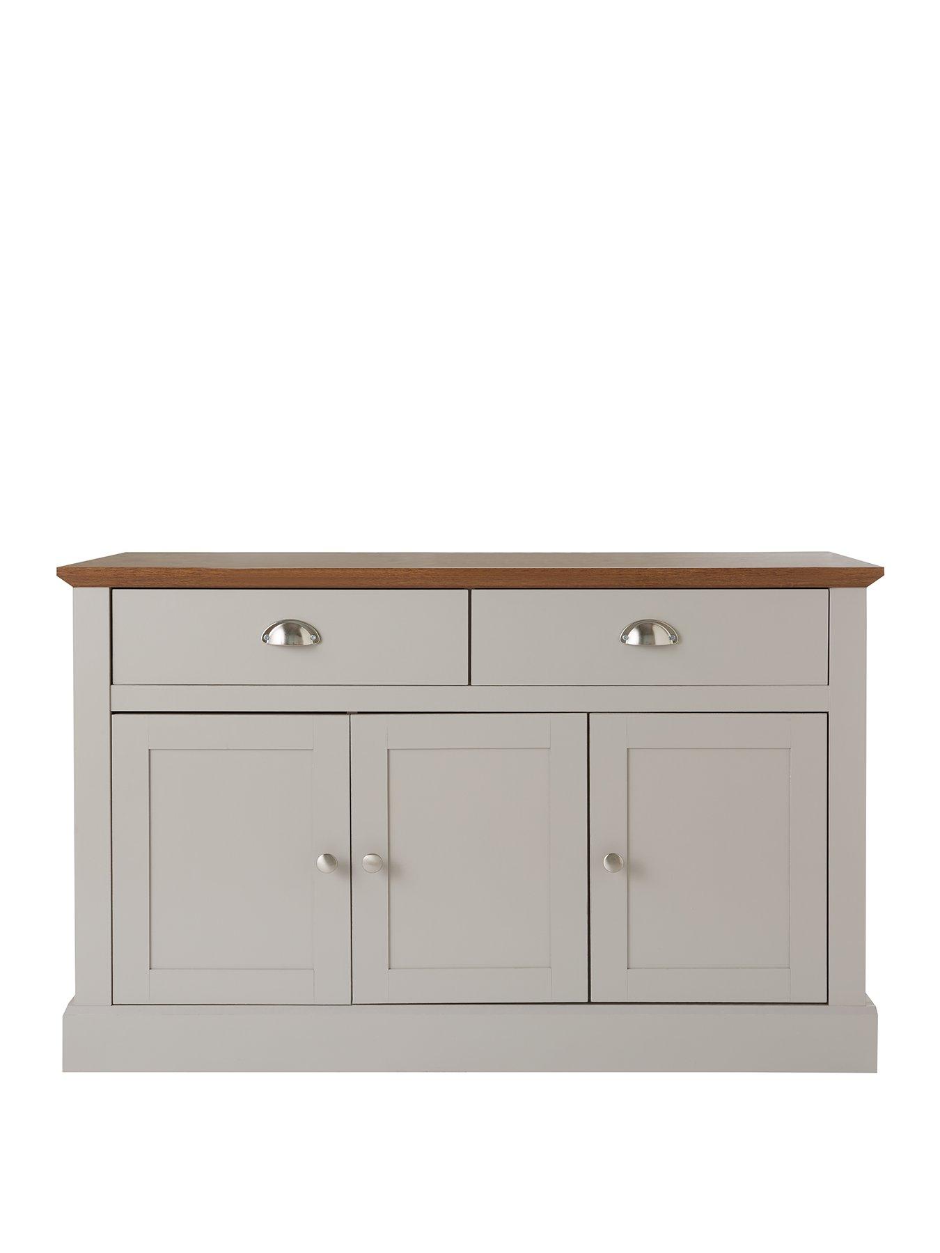 Very Home Crawford Large 3 Door, 2 Drawer Sideboard in Grey/Dark Oak EffectStyle and organisation for your living space costs less with the new Crawford collection by Very Home.This large sideboard is just the thing for a dining room or lounge, measuring 113 cm in width to offer plenty of storage for everything from dinner sets and wine glasses to books and board games. A smooth grey coloured frame holds three panelled doors and a pair of drawers, while the contrasting oak-effect top instils the furniture with country cottage overtones and creates a smart platform for a lamp, ornaments, a vase of flowers and more. Dainty metal knob handles to the doors and metal cup handles to the drawers add a sleek accent, and inside you'll find an adjustable shelf that maximises the space available. Two drawers glide effortlessly open on metal runners for a minimum of noise and friction, even when they're full. Get the full Crawford look by adding matching furniture from this range, which is available separately. Please remember to measure your available space before ordering. Dimensions: Height 74, Width 113, Depth 40 cm