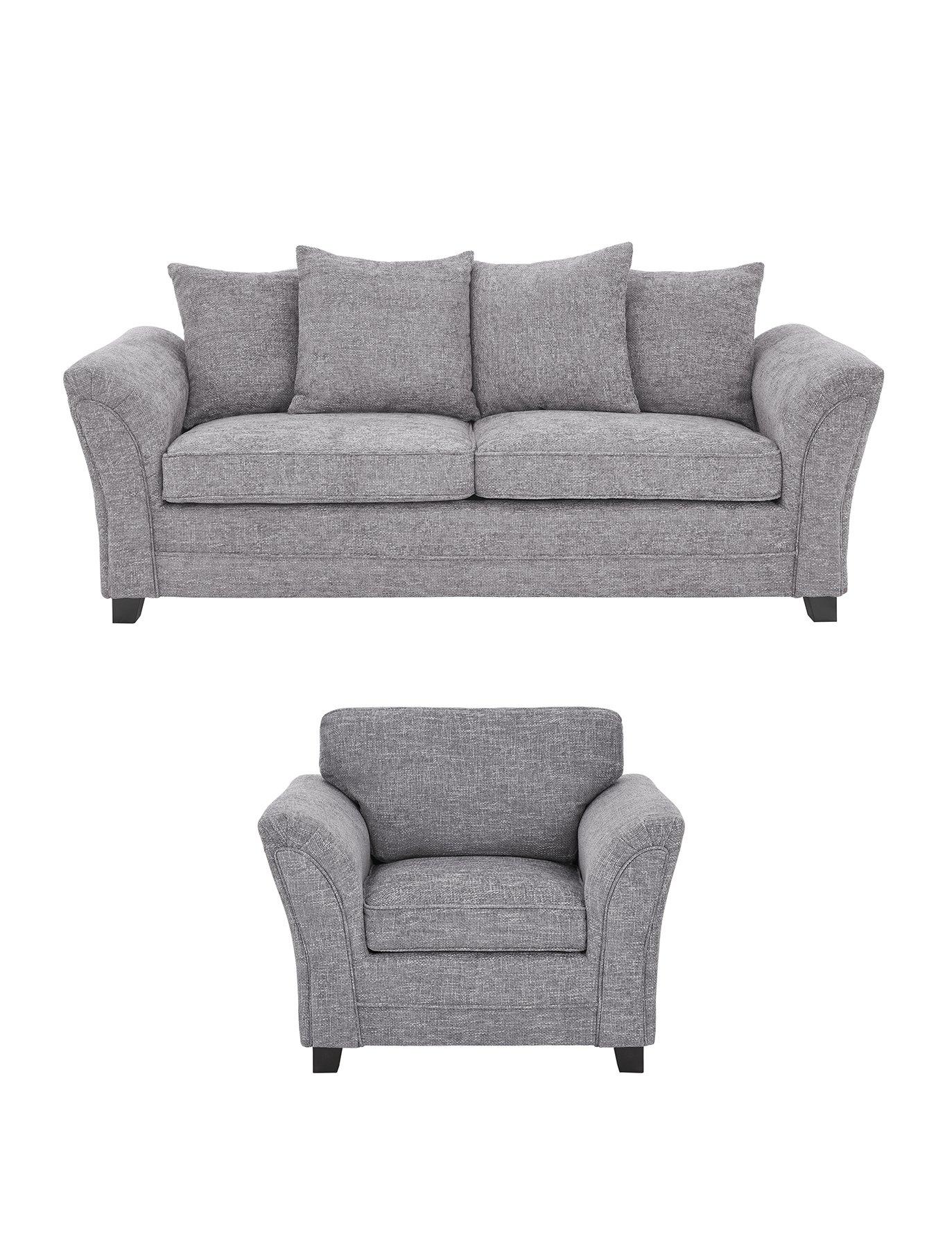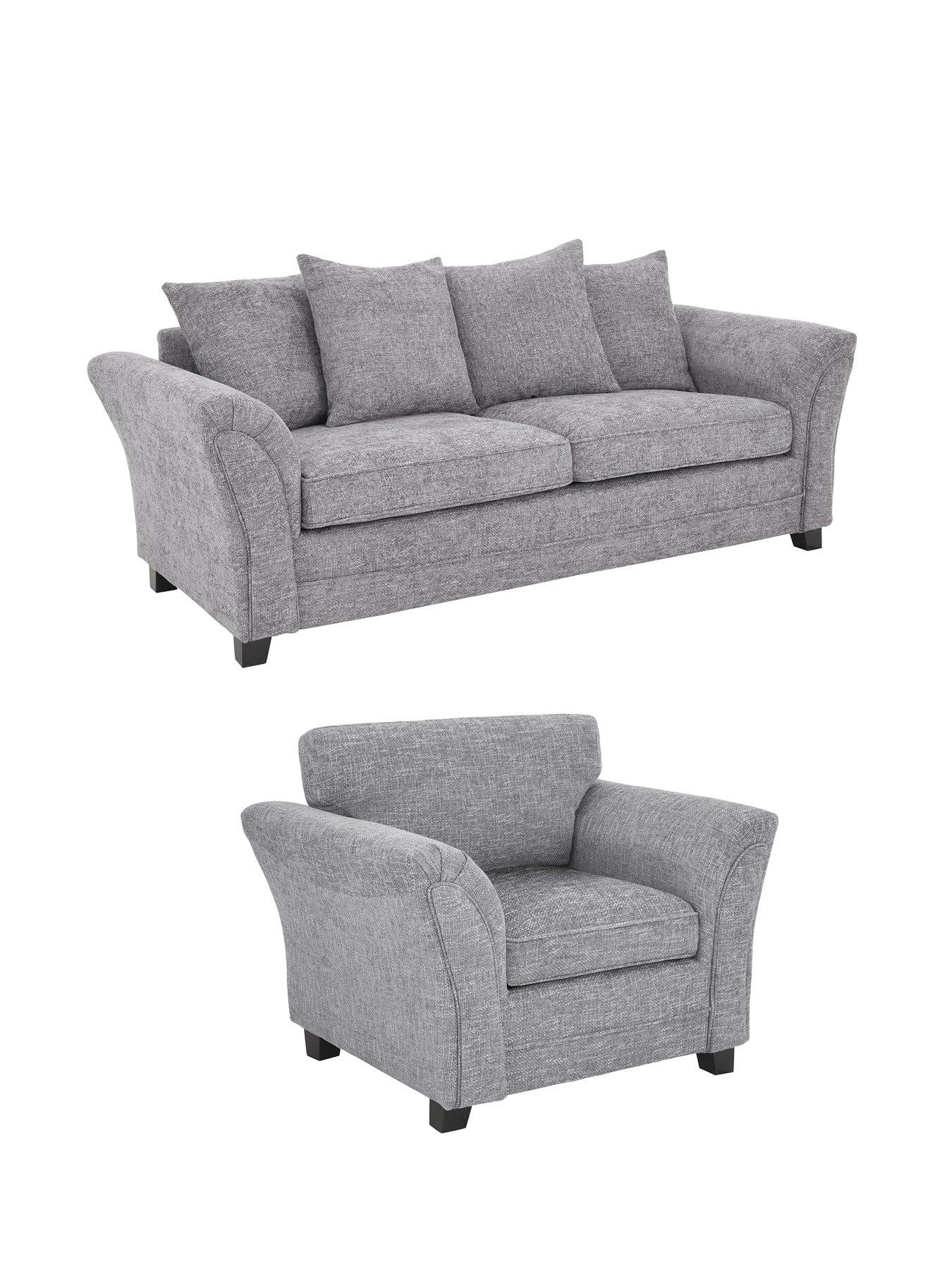 The Very Collection Dury Chunky Weave Scatter 3 + Chair - GreyHomely comfortDury is upholstered in a richly textured woven fabric that's perfect for kicking off your shoes and curling up on. The classy grey hue has a neutral quality that will slide seamlessly into all kinds of colour schemes. Style embellishments Fashionable flared arms with pinched detail to the front rise up to an eye-catching point, creating a narrow profile that's beautifully offset by the plump fibre-filled scatter cushions. Echoing the angle of the sides are the contemporary chrome feet that add a little shine to the sofas. Free Swatch Service Get a feel for this fabric before you buy with our FREE swatch service. Simply email SwatchOrder@ClickSpares.co.uk with your name and address, along with the sofa range name, item number, colour choice and the name of the retailer’s website you’re ordering from. Your swatches will be delivered within 5 working days (subject to availability). Please remember to measure your available space before ordering.