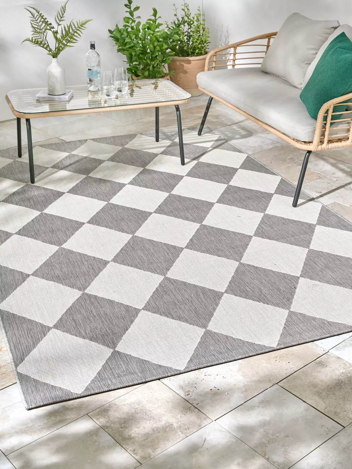 From busy areas of family homes to a cosy garden patio, our Element Diamonds Indoor/Outdoor Rug brings sophisticated style to your spaces.It takes its influence from classic tile patterns, with a repeating diamonds motif in a calming palette of grey and neutral tones. It’s crafted from a durable flatweave pile that’s hard-wearing and designed around easy-care, so all you need to do is give it a quick surface clean from time to time to keep it looking its best.