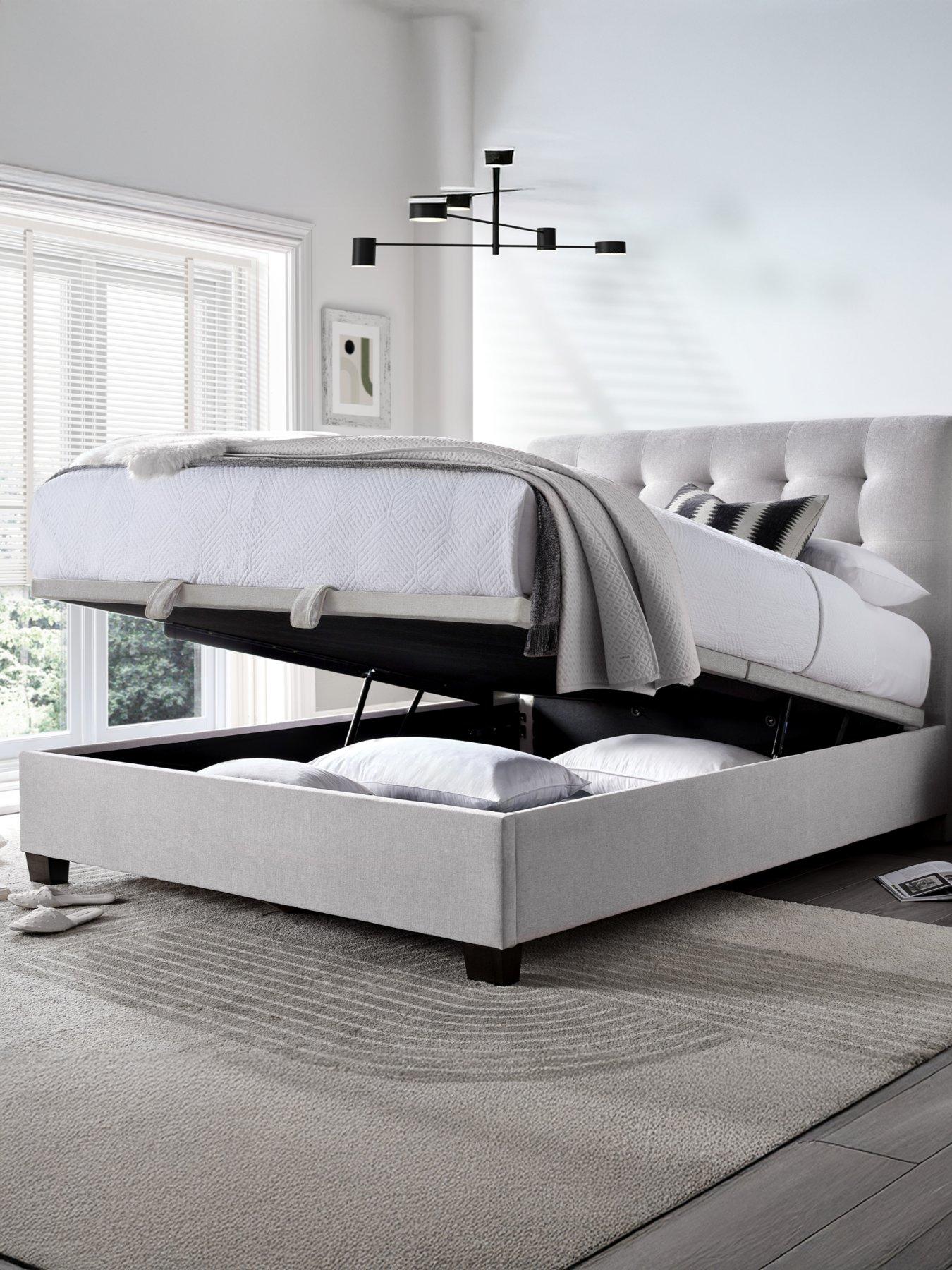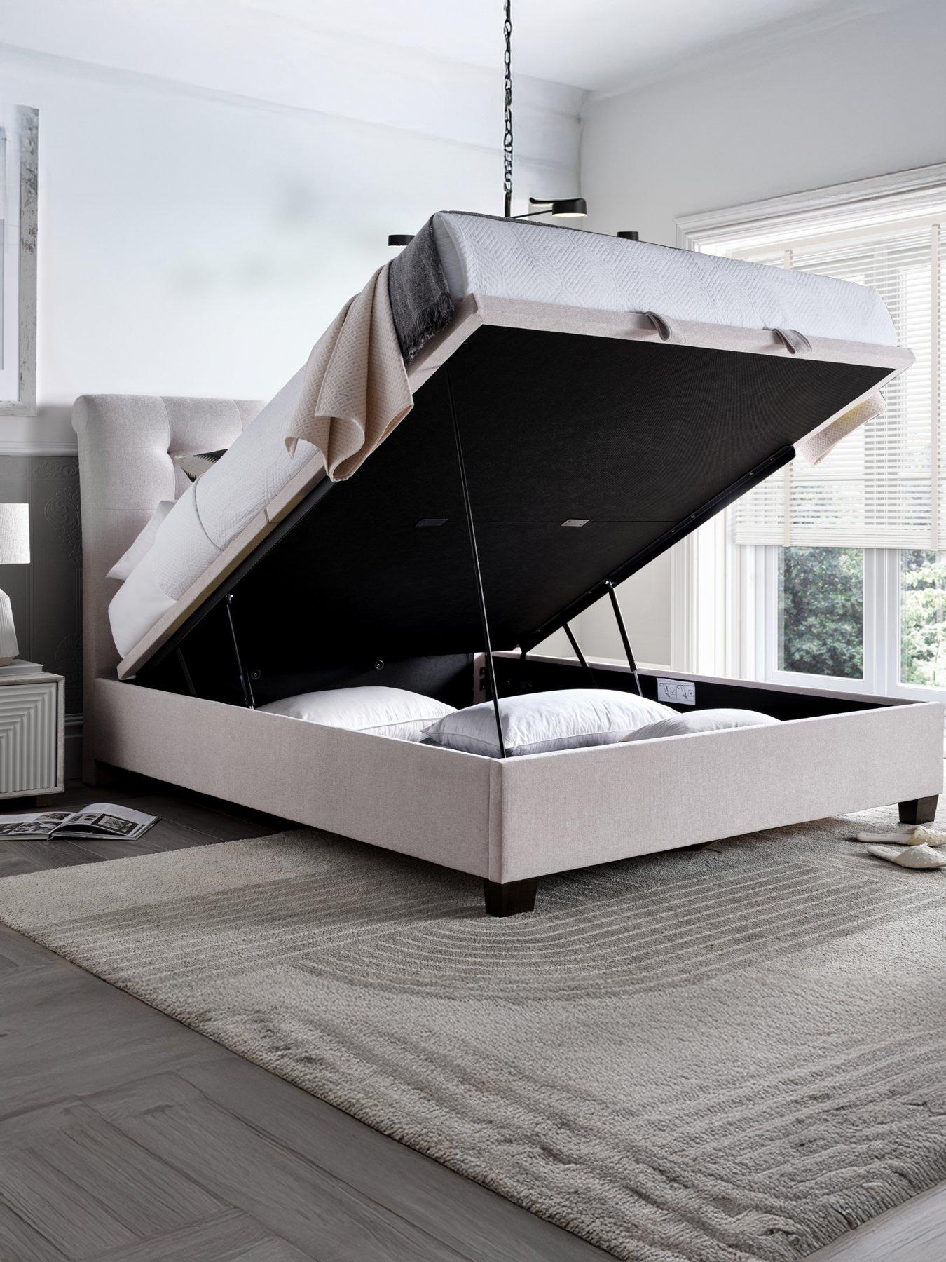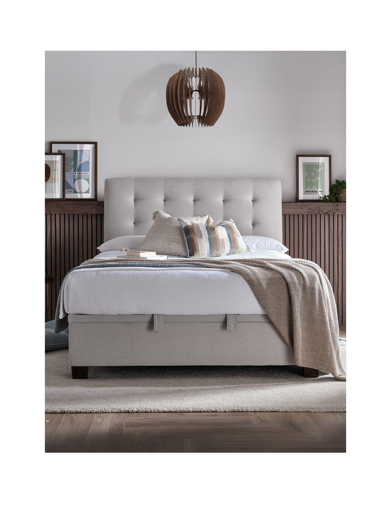 The Very Collection FAROE DOUBLE END LIFT UP OTTOMAN STORAGE DOUBLE BEDDesigned to impress with a small roll back headend and square quilted panels creating a button effect and giving a classic and luxurious feel to this bedframe. A generous and unrestricted hydraulic assisted ottoman storage area is located in the base of the bed for storage of everyday items. Upholstered in quality fabric and made using wood from sustainable sources. Double: L218cm X W138.5cm x H129cm King: L227.5cm x W154.5cm x H129cm