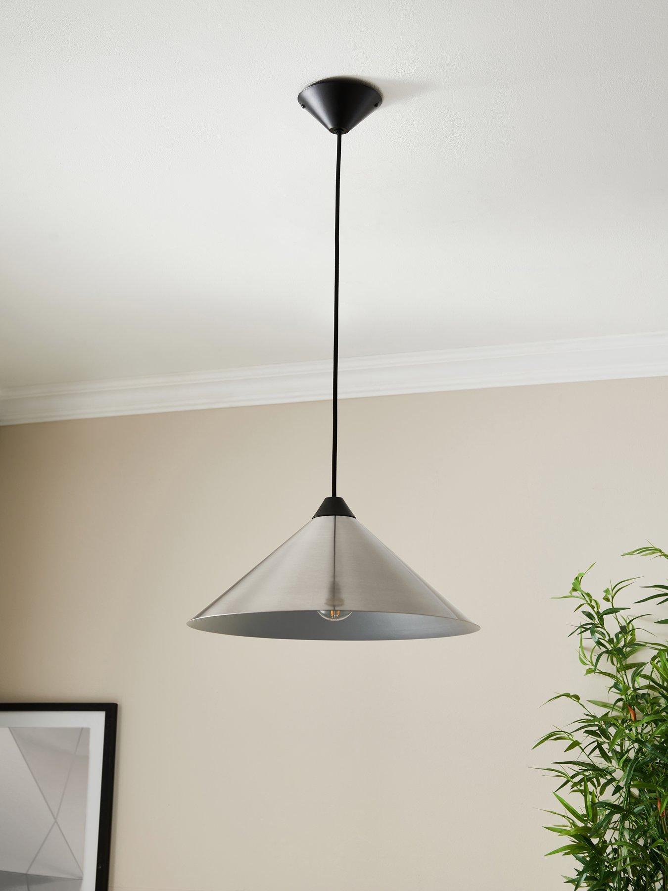 Very Home Fontana Pendant Ceiling LightThe Fontana ceiling pendant light from Very Home is a fab example of modern simplicity.Crafted from metal with a gorgeous nickel finish, it showcases a wide, open take on traditional empire shades, which helps light to cascade across a wider area of your room. The black base plate coordinates beautifully, and the matching cable is height adjustable to fit both high and low ceilings. Compatible with dimmable switches, Fontana’s effortless blend of style and functionality means you’ll have no trouble crating a cosy ambience in contemporary spaces.
