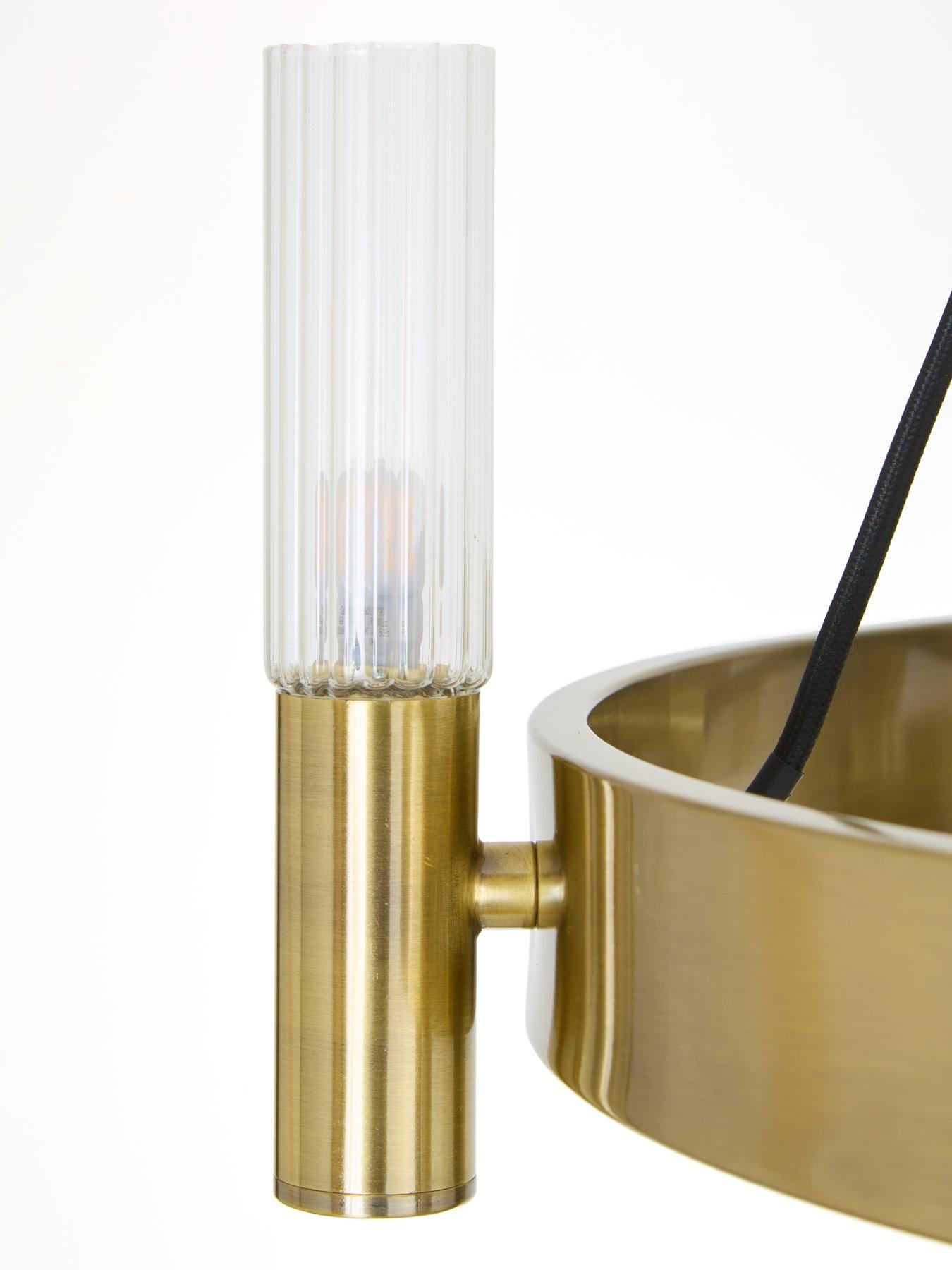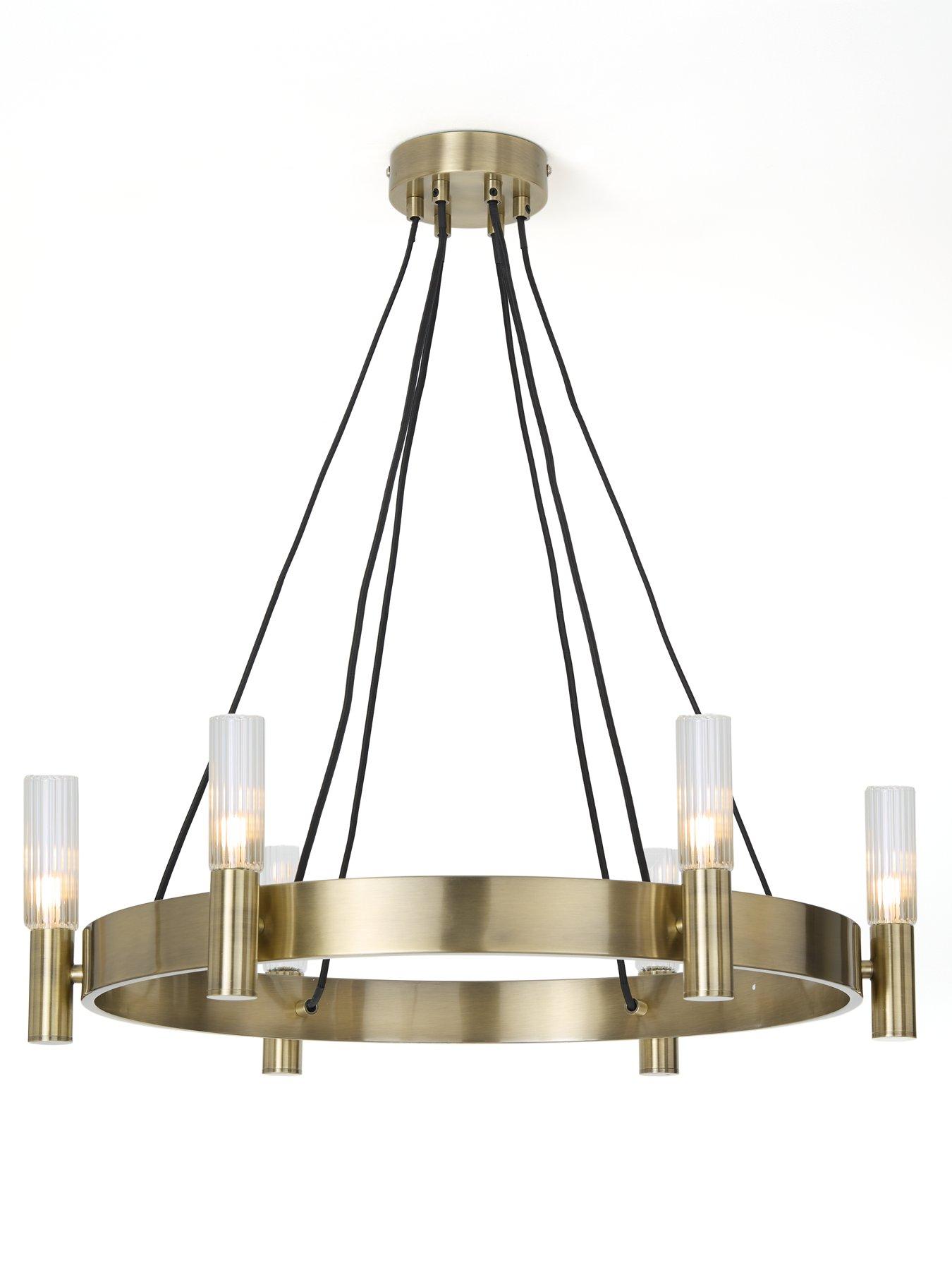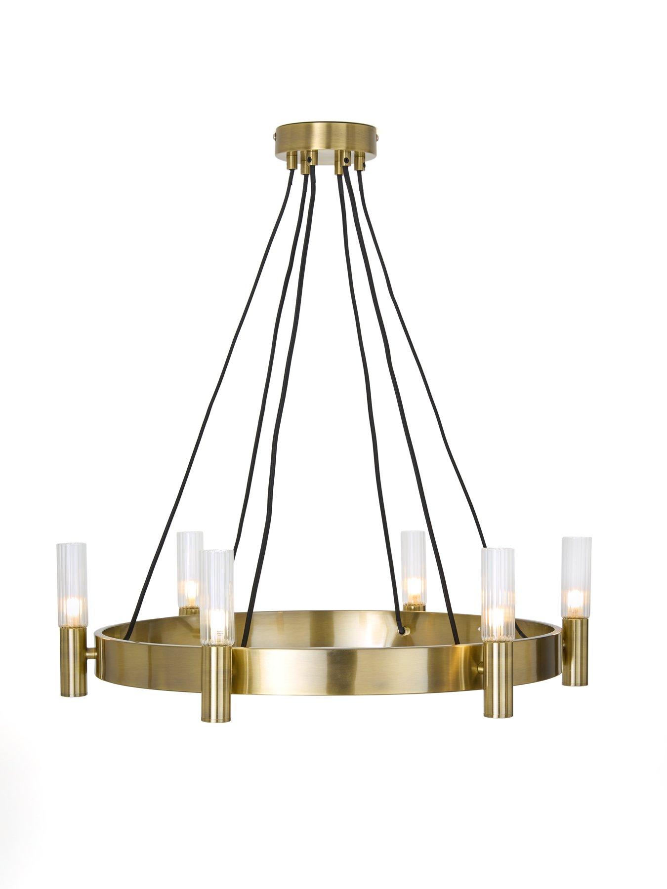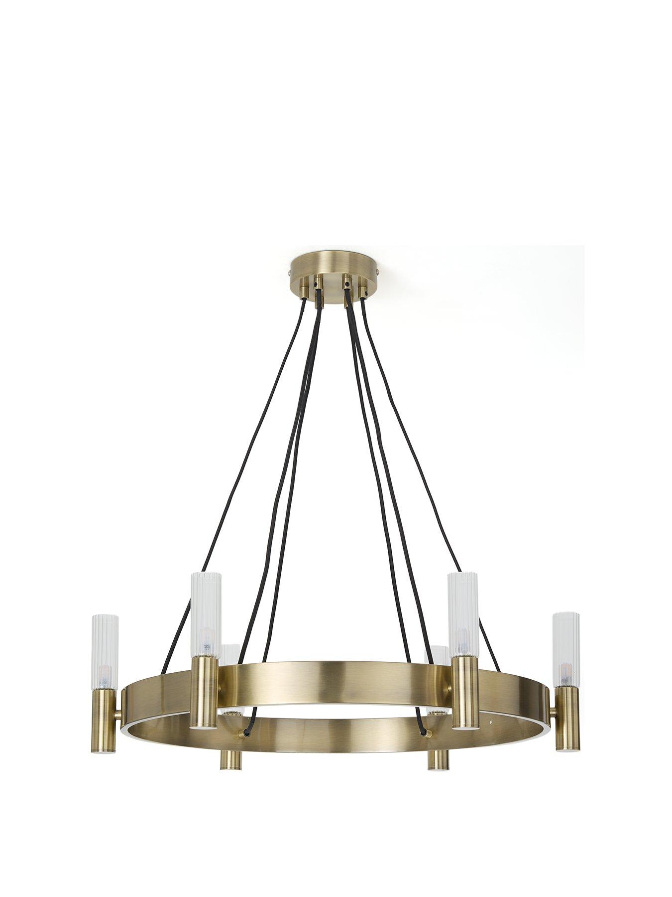 Very Home Francis 6 Light Wheel Pendant in Antique Brass - 63.5 cm diameterThe classic wagon wheel pendant gets a modern makeover with the Francis by Very Home. Measuring 63.4 cm in diameter, the circular design is made from metal that's finished in a shiny antique brass that catches the glow of the 6 lights. These each sit within ribbed glass shades, the texture of which will become even more noticeable as the light passes through.Requires 6x G9 bulbs (not included). Also available in a black metal option (see item number VQROS).