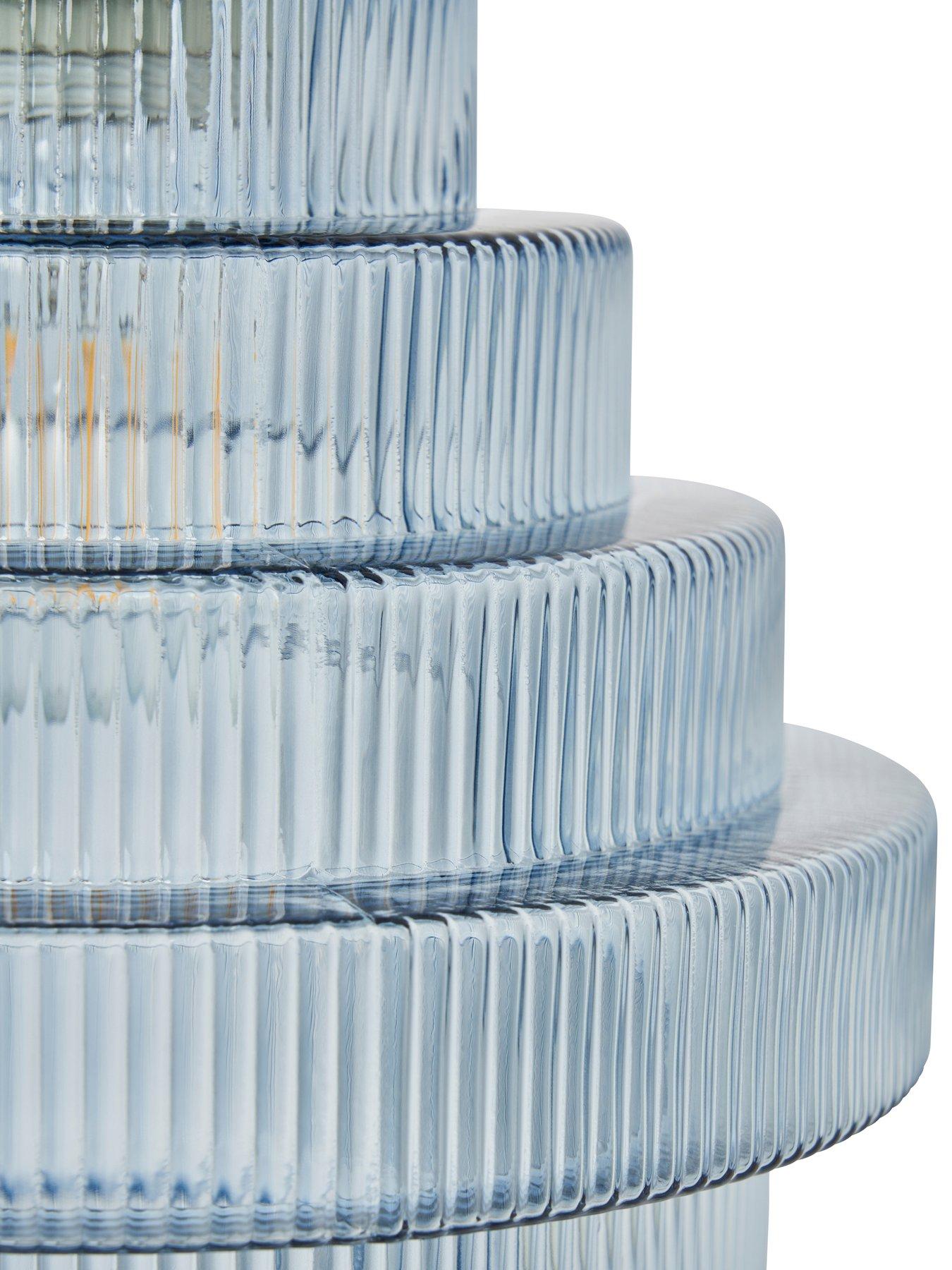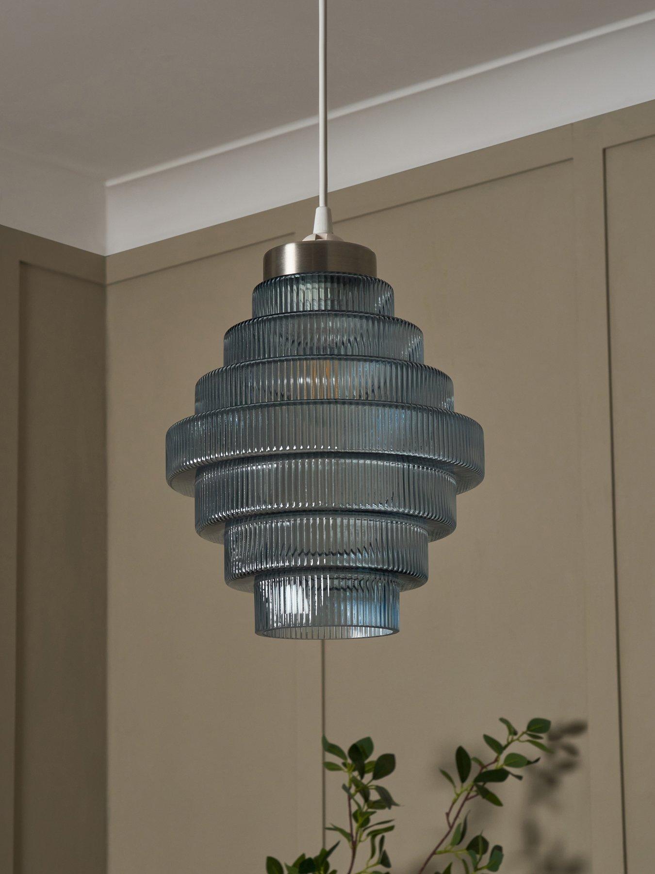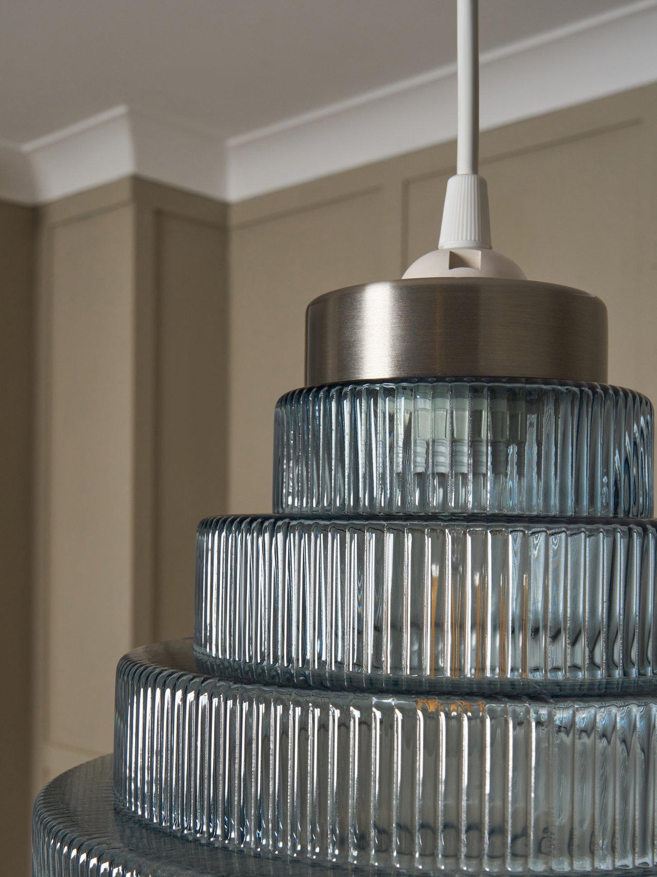 Very Home Genoise Pendant Light FixtureTaking its inspiration from 20s fixtures, the breathtaking Genoise pendant by Very Home is non-electric and easy to fit. The stunning satin nickel top plate supports a tiered shade made from blue glass. A ribbed texture that enhances its appearance when the light shines through it while also bringing subtle depth to the effect it creates.Requires 1 x GLS bulb (max 10 watt), not included.