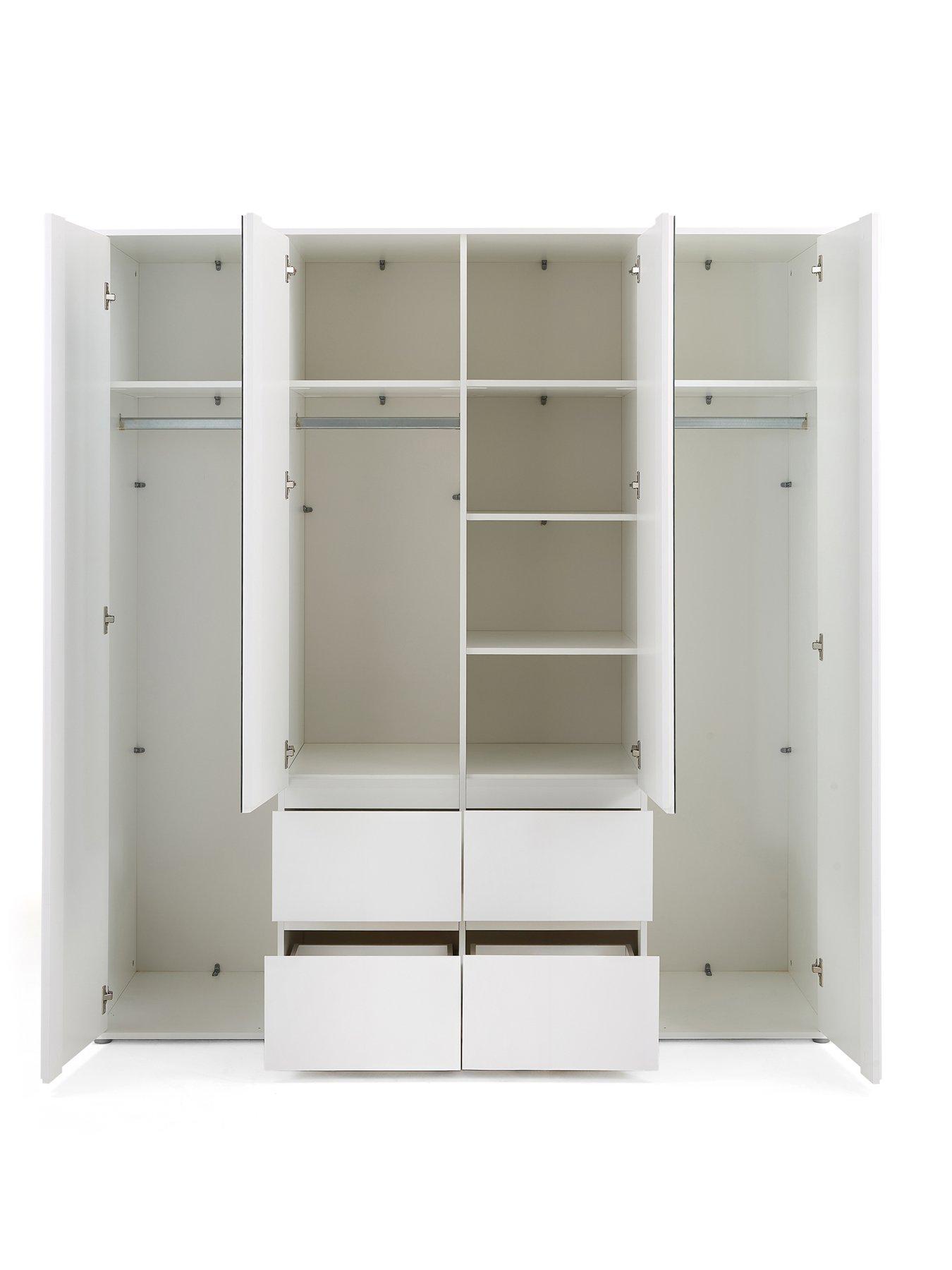 Very Home Layton Gloss 4 Door Combi Wardrobe in WhiteFrom the Layton collection of bedroom furniture, this wardrobe comes in a glassy white finish that will brighten your sleep space. With two central mirrored doors, it contains three hanging rails and lots of shelving.Four drawers provide extra storage for folded fashion, and the easy-glide metal runners ensure they open and close smoothly. Please remember to measure your available space before ordering. Dimensions: Height 193.7, Width 177.6, Depth 60 cm