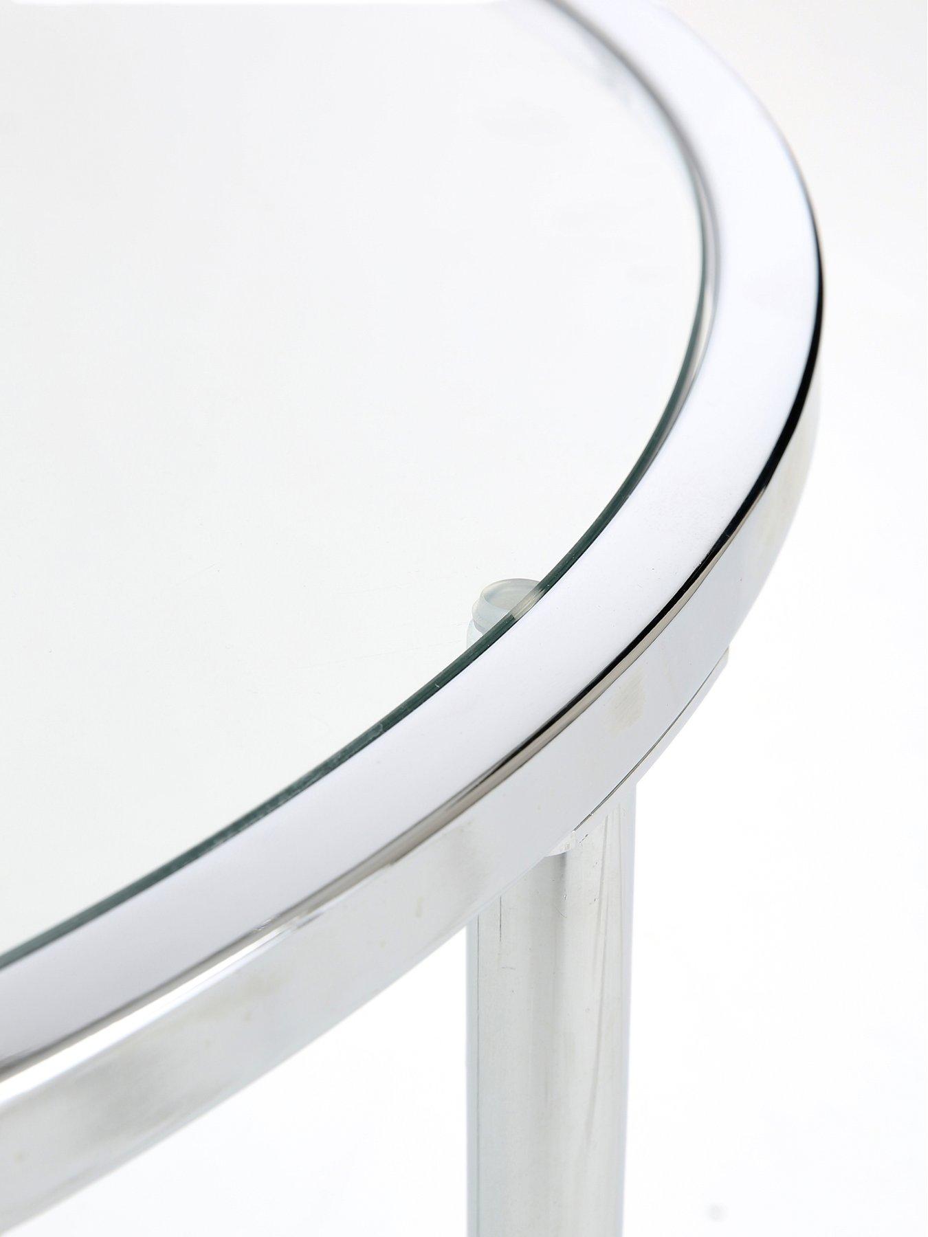 Very Home Link Glass Top Side Table in ChromePart of the Link range, this modern side table has a circular clear glass top that gives it an airy, uncluttered look. The frame is made from metal in a shiny chrome finish for added light-catching style. Get the full Link look by adding matching furniture in this collection (also available in an alternative black or brass frame).Please remember to measure your available space before ordering. Dimensions: Height 50, Diameter 42 cm