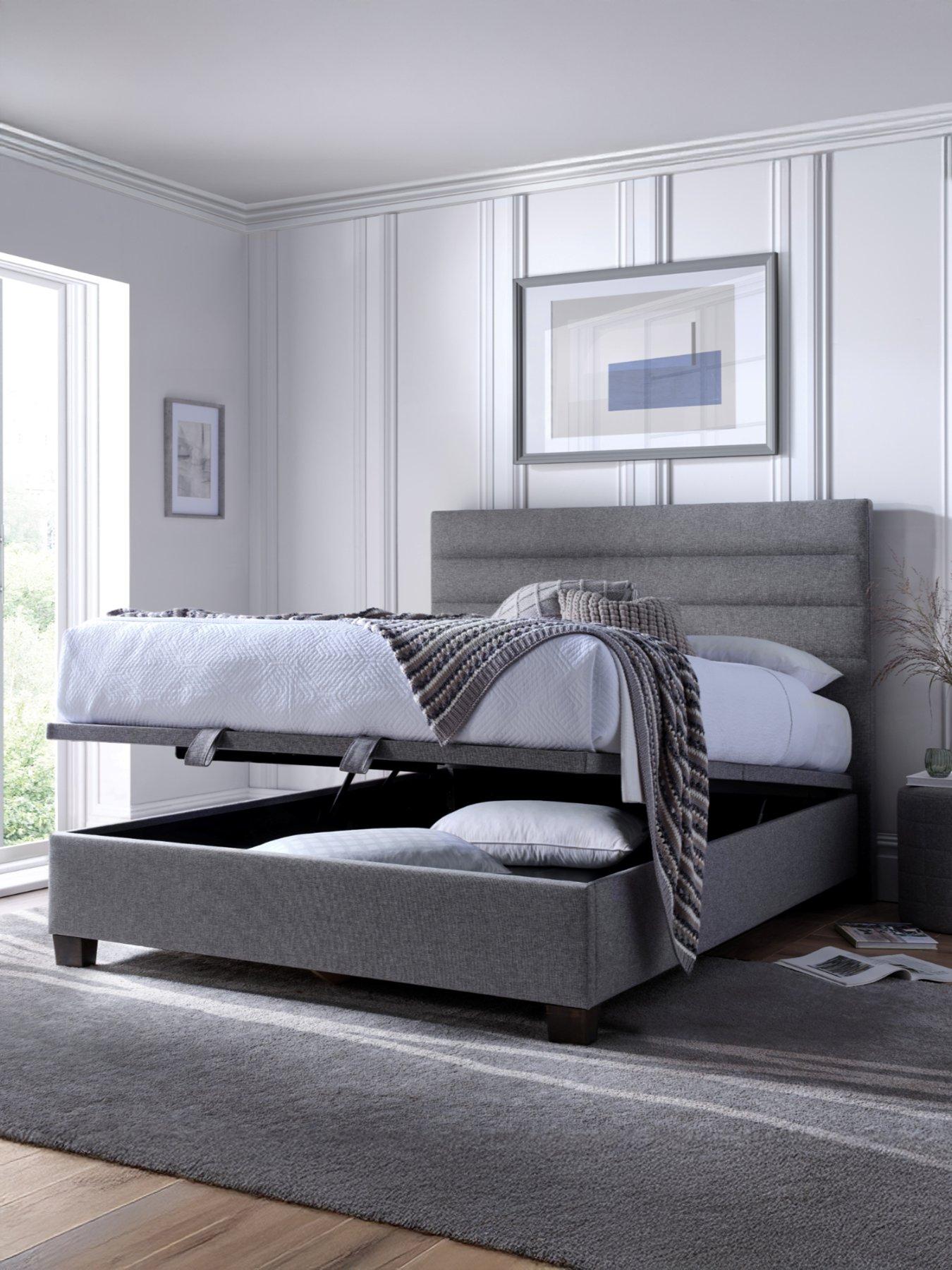 The Very Collection Liza Double With Ottoman StorageDesigned with a horizontally panelled padded headend to floor and base with hardwood footend feet, this bed would make a stylish addition to any bedroom. Offering a practical, unrestricted space saving storage solution for todays modern living requirements and fitted with an ottoman safety bar for security when accessing goods. Upholstered in quality fabrics and using wood from sustainable sources.