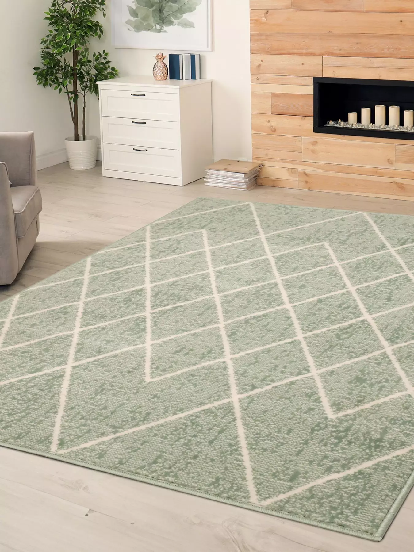 Its calming design sees a soothing sage green backdrop enhanced by geometric linework in white. Natural stain resistance and plenty of durability ensures this rug is perfect for family homes - place in your lounge or dining room to create a classy look that's easy to love.