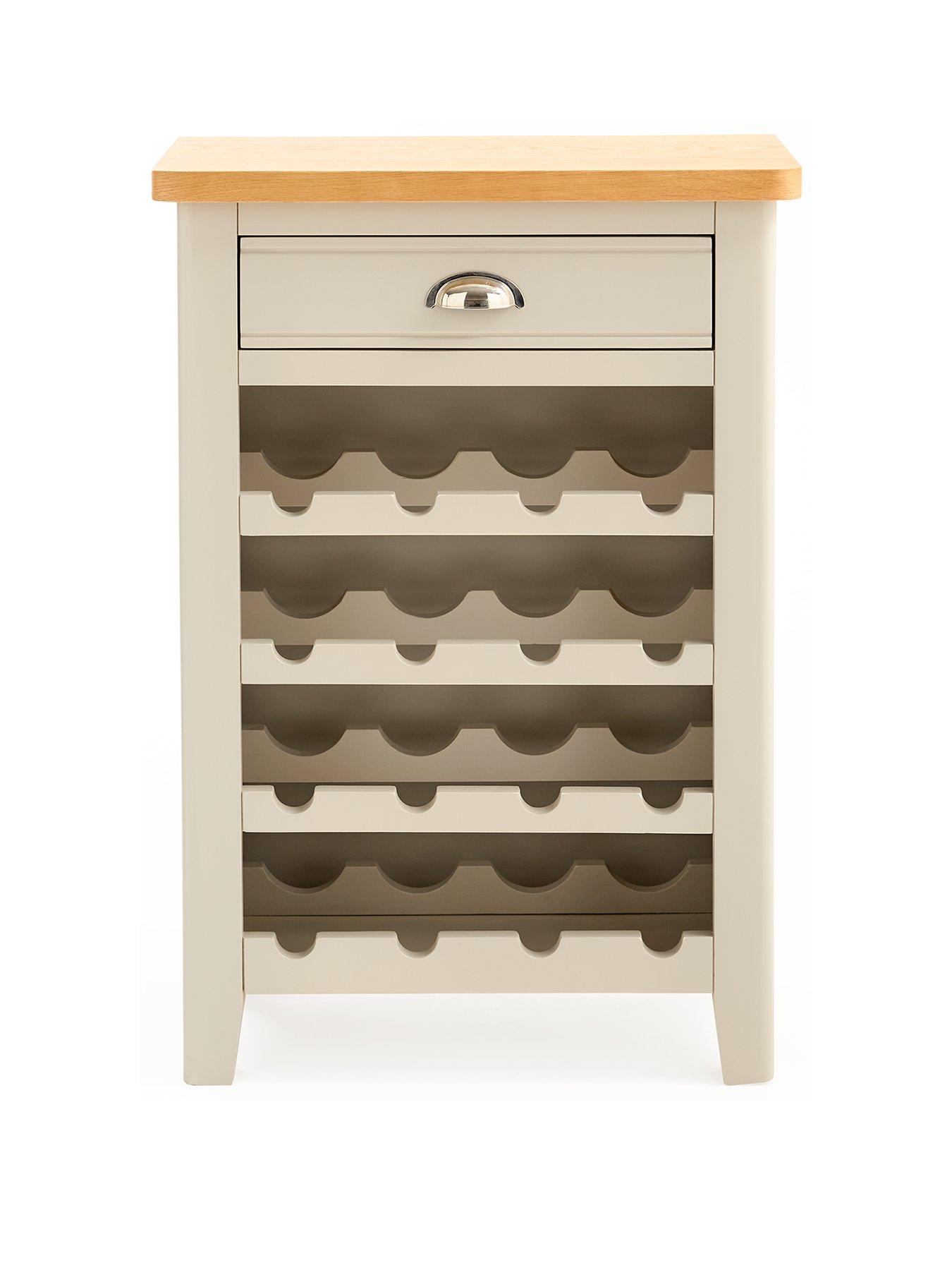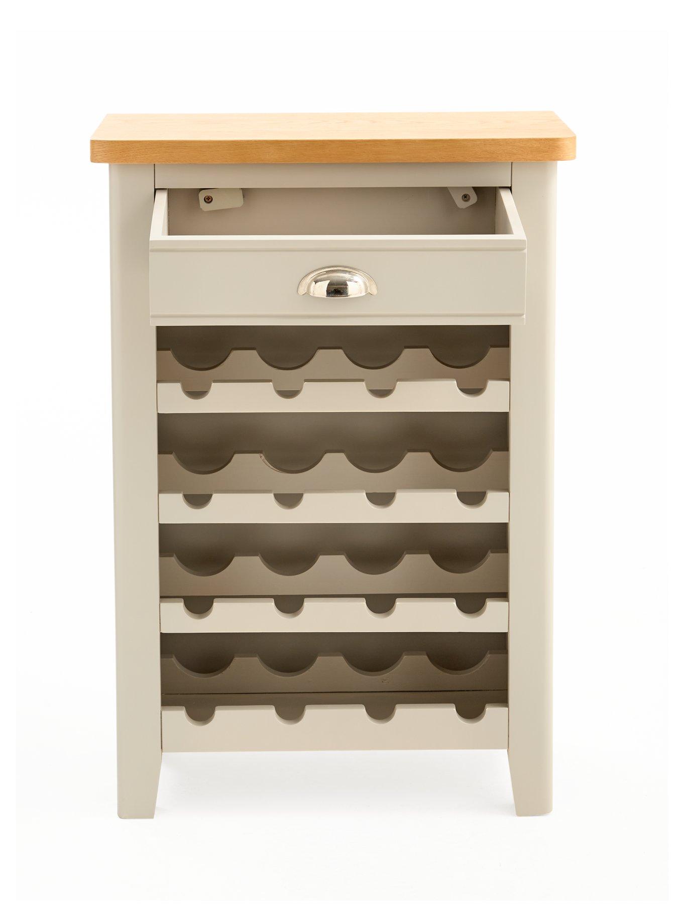 Very Home Malone Ready Assembled Wine Cabinet in Grey/Oak - contains Solid WoodCrafted from a combination of solid pine, solid acacia wood and sturdy MDF, this wine cabinet comes from Very Home's Malone collection of living room furniture. Providing space for up to 16 bottles of wine or your your other favourite tipples, it will be delivered ready assembled for the ultimate convenience, allowing you to see how good it looks right away.Flaunting a fab country cottage aesthetic, its base is designed with chunky proportions and a painted grey shade that will sit smoothly with all sorts of decors. The contrasting top has a wood-effect finish to give the furniture a two-tone appearance. A single storage drawer features decorative grooves and a metal cup handles, and it offers the perfect place for your waiter's friend and other drink accessories. Get the Malone look with matching furniture in this collection which is all available separately. Please remember to measure your available space before ordering. Dimensions: Height 80, Width 55, Depth 30 cm