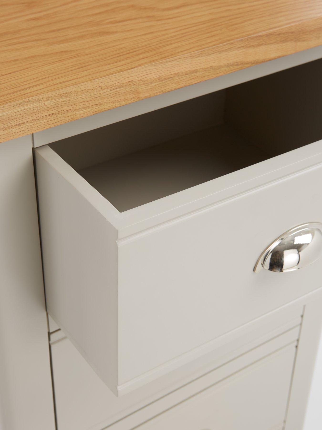 Very Home Malone Ready Assembled 5 Drawer Tall Boy in Grey - contains Solid WoodCrafted from a combination of solid pine, solid acacia wood and sturdy MDF, this tallboy comes from Very Home's Malone collection of bedroom furniture. It will be delivered ready assembled for the ultimate convenience, allowing you to see how good it looks right away.Flaunting a fab country cottage aesthetic, it's designed with chunky proportions and a painted grey shade that will sit smoothly with all sorts of decors. The contrasting top has an oak-effect finish to give the furniture a two-tone appearance. 5 storage drawers feature decorative grooves and metal cup handles, providing plenty of room for all your folded fashion. Get the Malone look with matching furniture in this collection which is all available separately. Please remember to measure your available space before ordering. Dimensions: Height 115, Width 55, Depth 35 cm