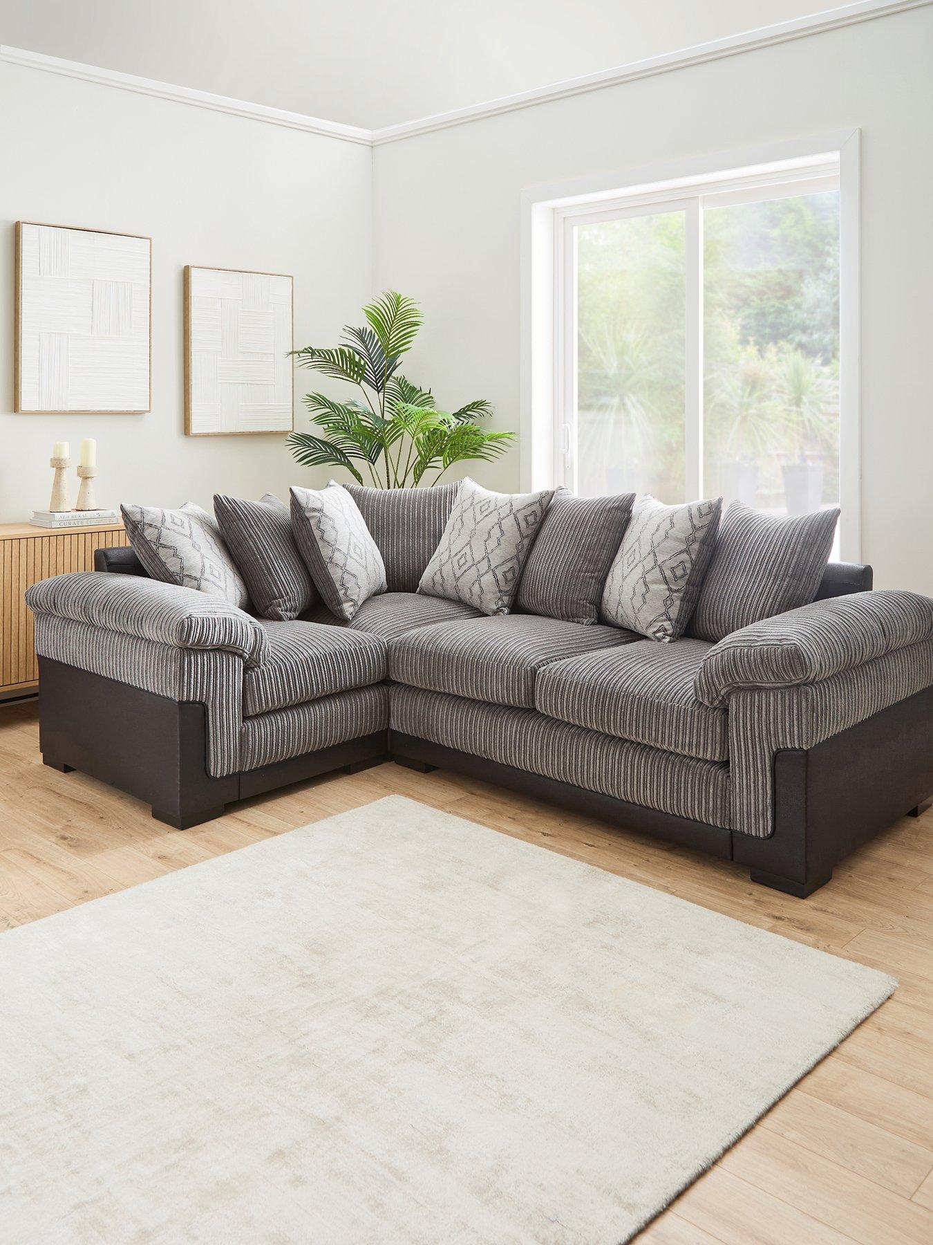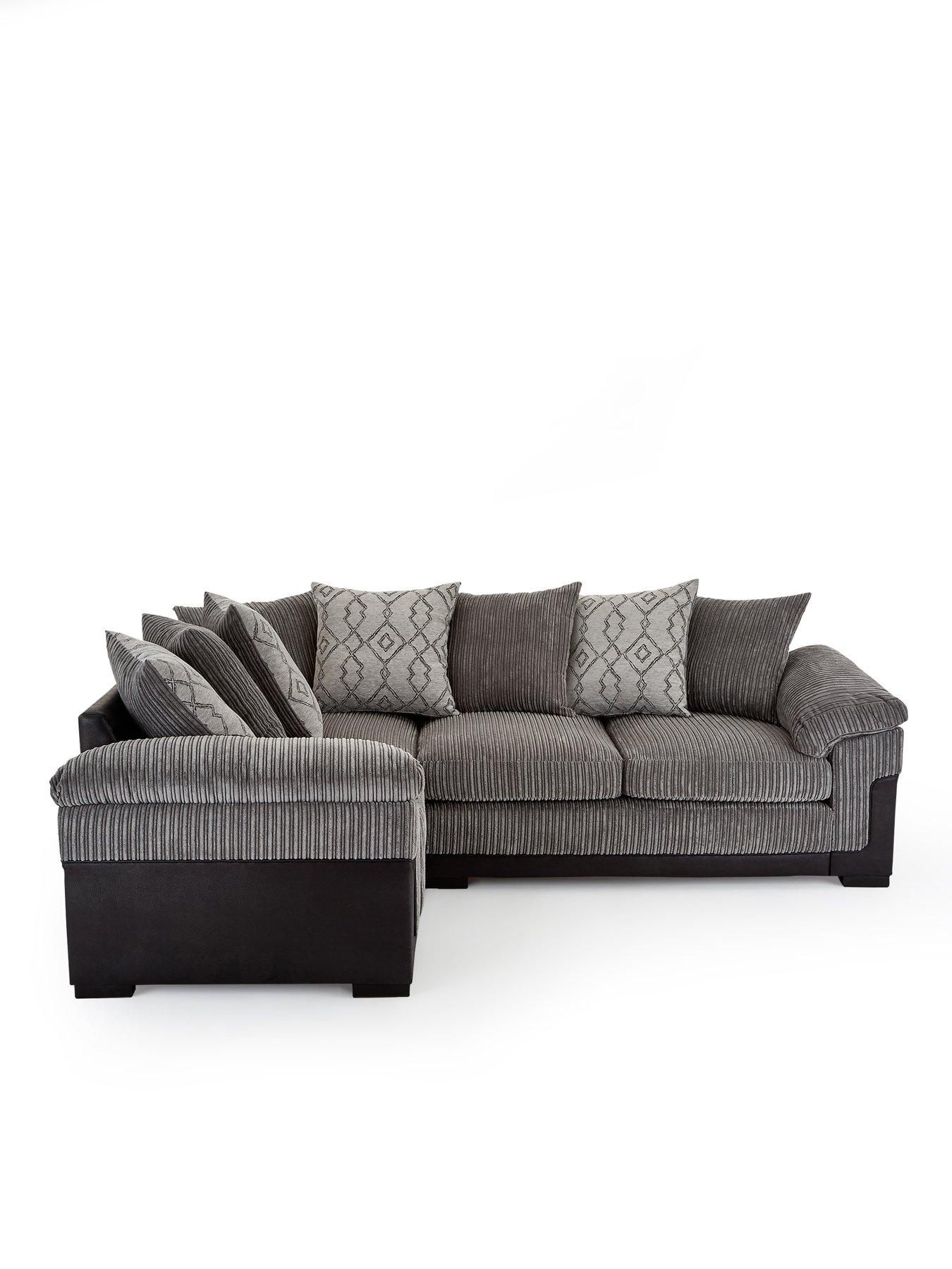 The Very Collection Marissa Jumbo Cord Left Hand Corner Group Sofa in Grey/BlackH 94 x W 244 x D 174 cmSumptuous Jumbo Cord This sofa from the Marissa collection is upholstered in a chunky jumbo cord fabric which flaunts those thick lines of texture you won't be able to resist running your hands across. The outer contrasts with black faux leather for a contemporary accent. Sitting on block feet that raise it up slightly off the floor, it has a stylish scatterback design and four of the cushions feature a pattern to one side and a jumbo cord to match the sofa on the reverse - this means you can give the furniture a fashion flip whenever you feel like changing up the view! Free Swatch Service Get a feel for this fabric before you buy with our FREE swatch service. Simply email SwatchOrder@ClickSpares.co.uk with your name and address, along with the sofa range name, item number, colour choice and the name of the retailer’s website you’re ordering from. Your swatches will be delivered within 5 working days (subject to availability). Please remember to measure your available space before ordering. Dimensions: Height 93, Width 244, Depth 174 cm