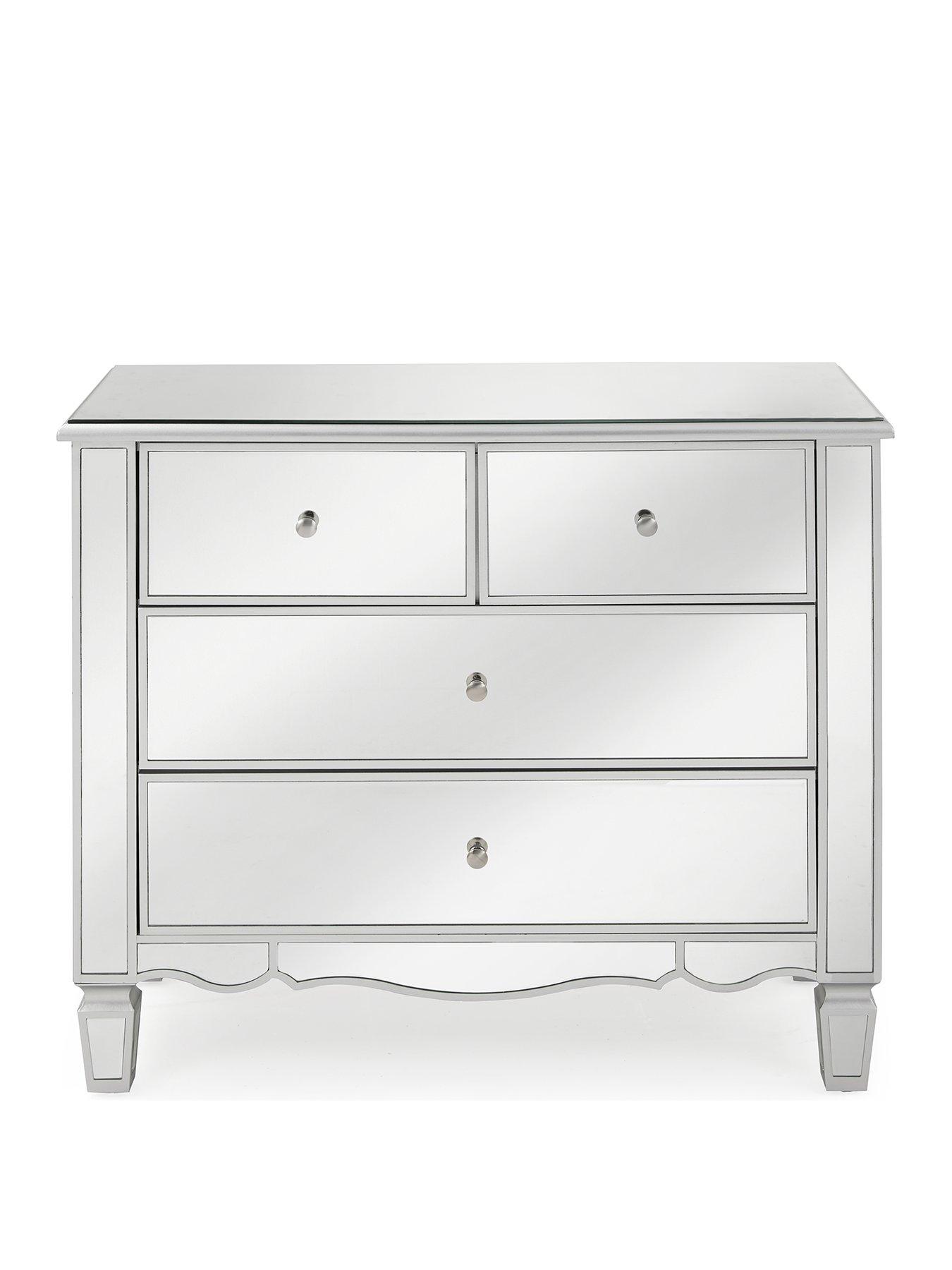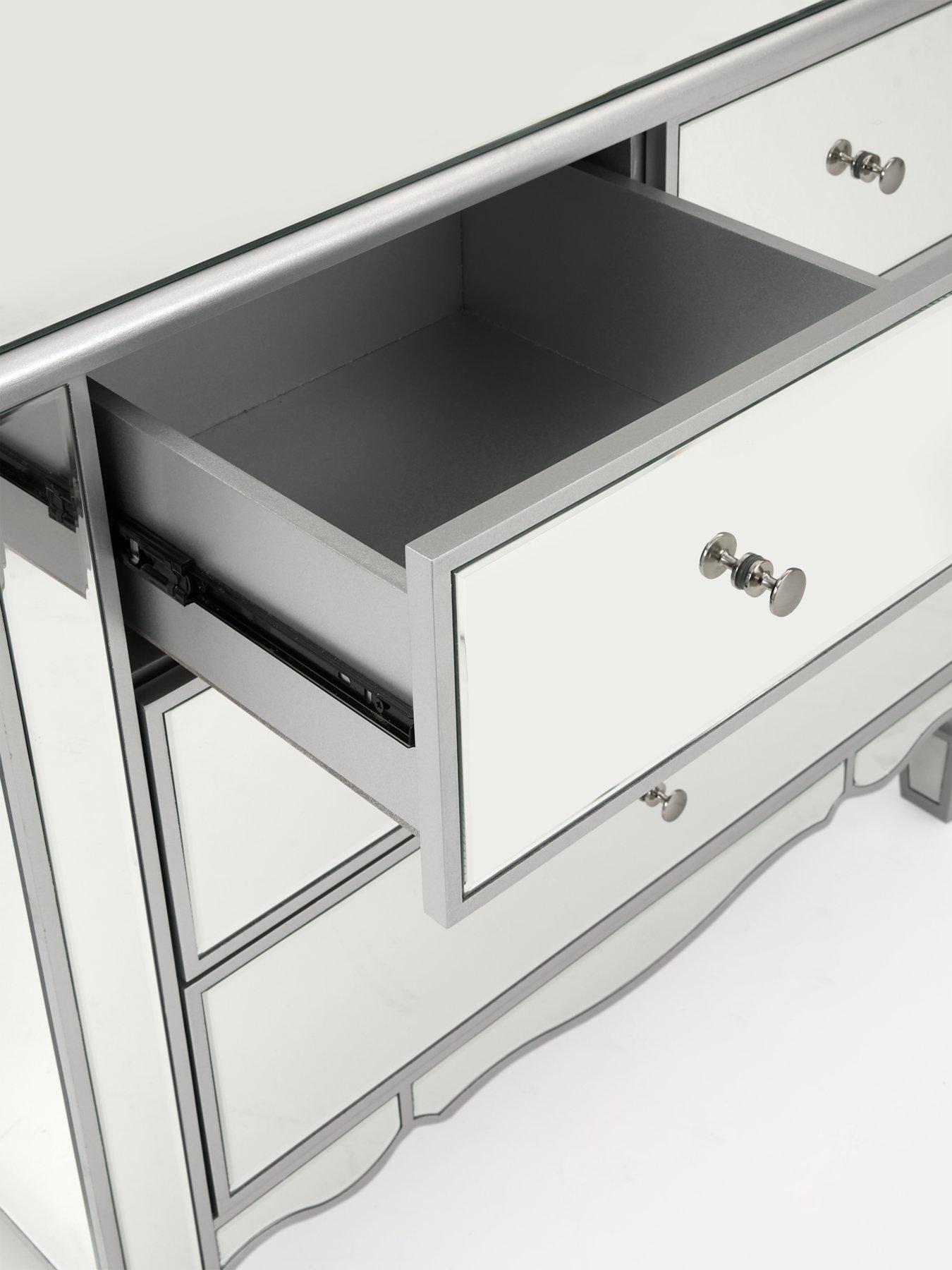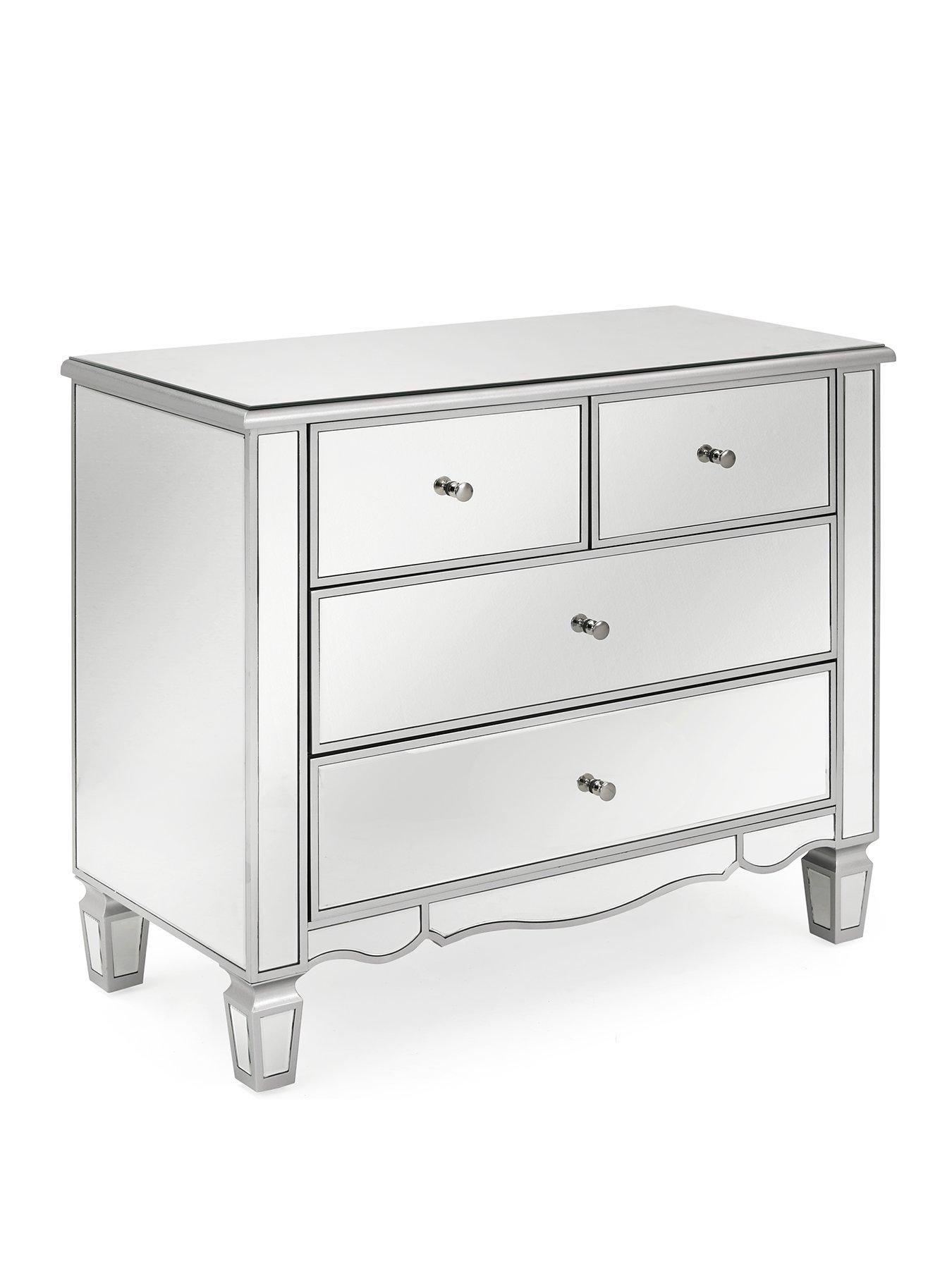 Styled with a curvy base panel and boldly shaped feet, the glamorous silver coloured frame supports smooth bevelled mirrored panels that lure in the light and splash it back around your room. A final touch of shine comes from the dainty metal knob handles, and the four drawers provide a handy hideaway for all your fashion favourites.