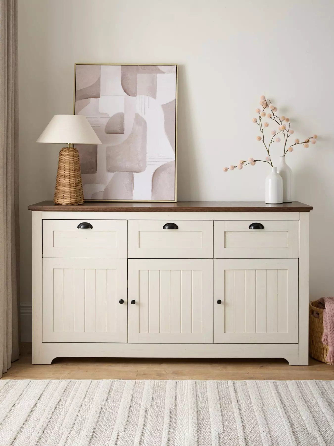 Re-invent your living space's storage with this quaintly styled sideboard from Very Home's Devon collection. Its country cottage elegance comes from a rich combination of ivory and rustic walnut-effect, plus panelled detail to the doors and drawers.Each cupboard contains a shelf to help maximise your storage (these can be removed if you need to stow away taller items), while three drawers enhance your organisation options. Styled with metal cup and knob handles, it also benefits from smooth easy-glide metal drawer runners and adjustable hinges.
