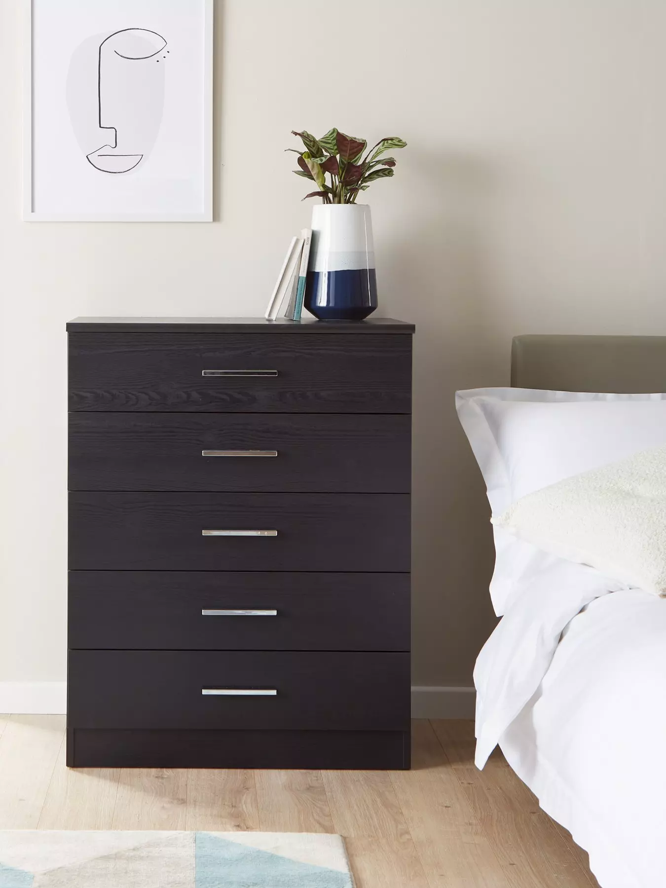 From the great value Panama collection of bedroom furniture by Very Home, this chest of drawers comes in modern black grained wood-effect finish to update your sleep space.Five drawers provide plenty of space to keep your PJs, socks, tees and more organised. They're fitted with metal handles and easy-glide metal runners for a smooth, friction-free opening.