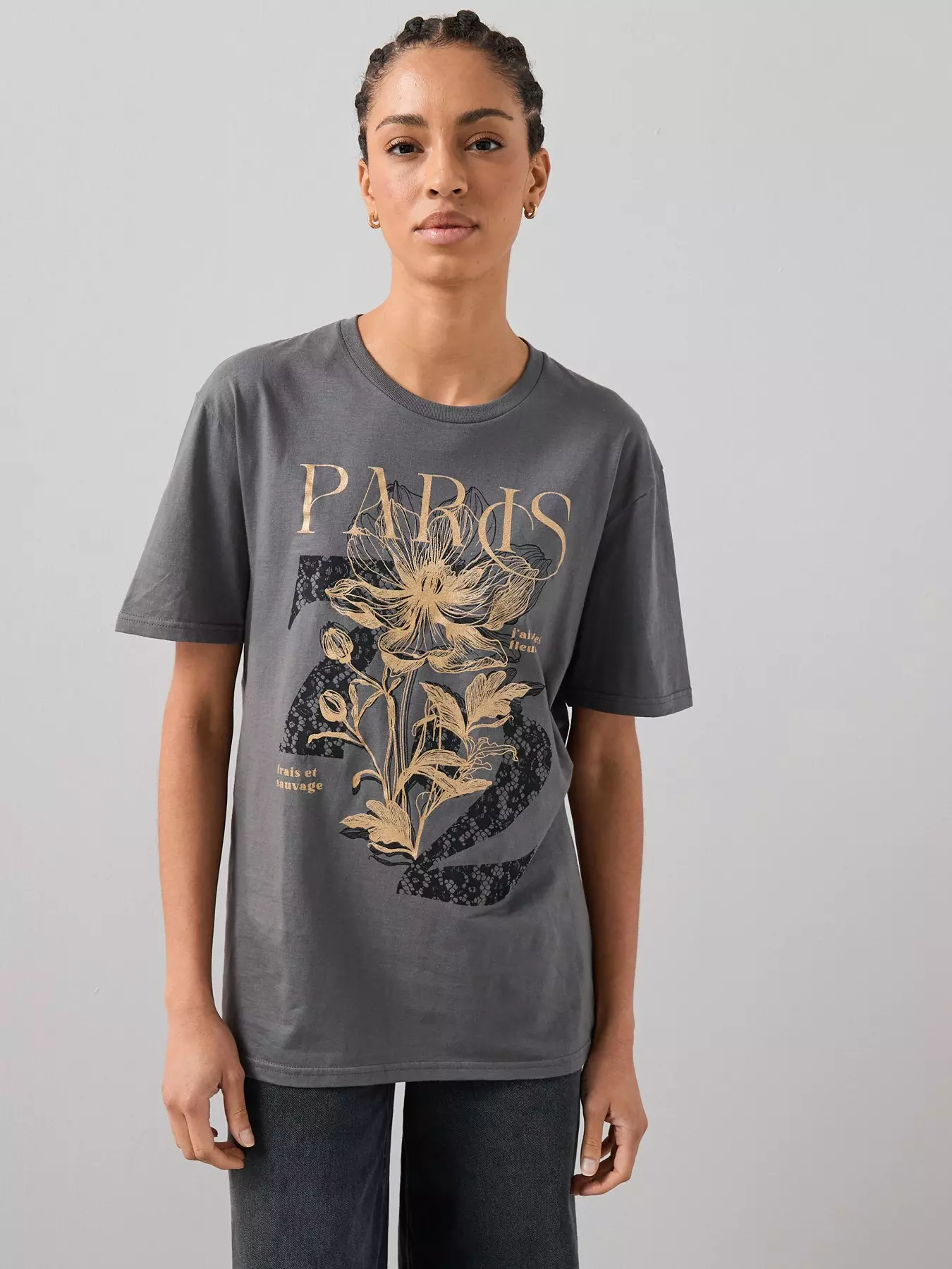 - Paris Lace Print Oversized Graphic T-shirt - Grey by The Very Collection
