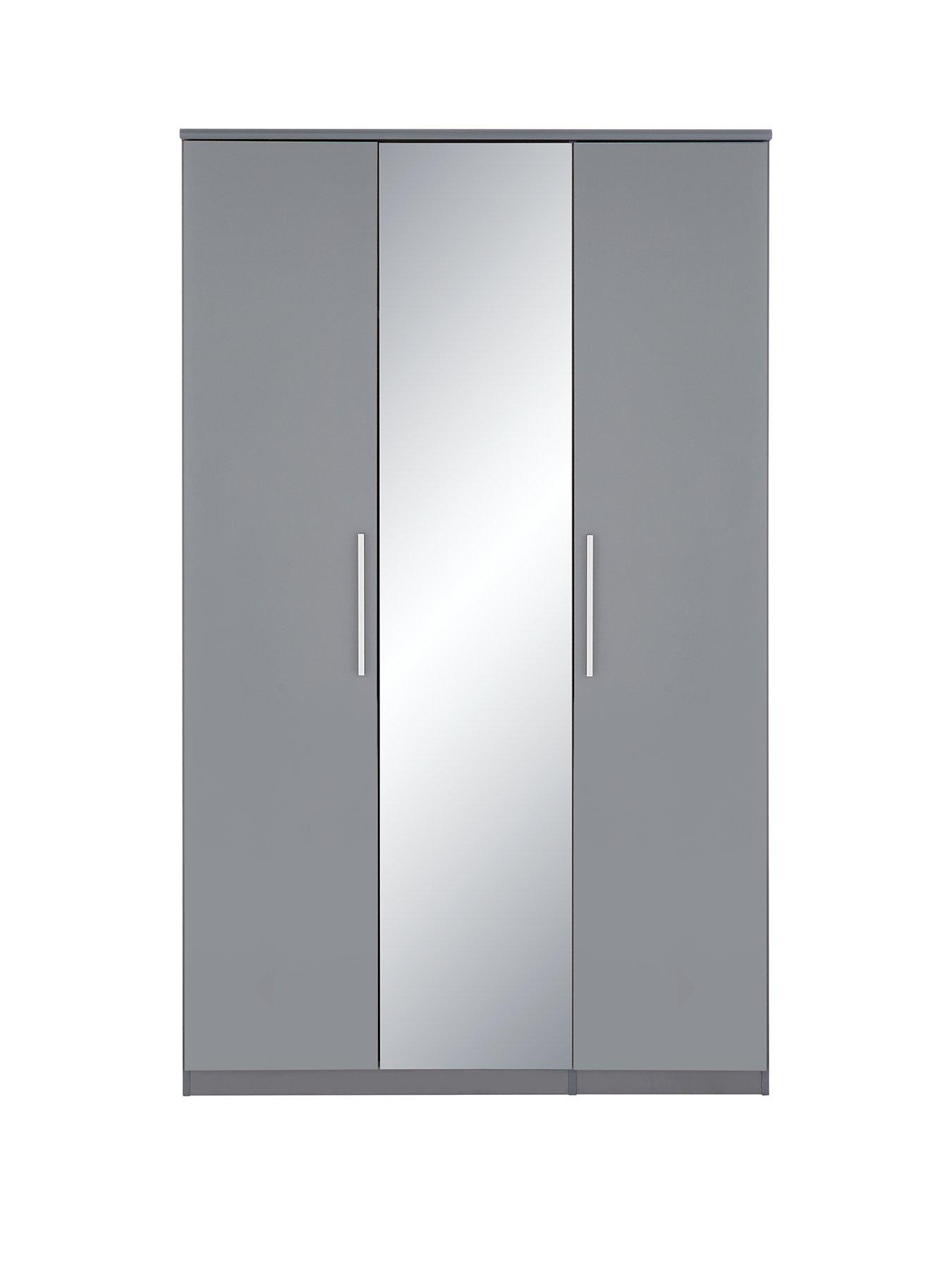 Prague Gloss 3 Door Mirrored Wardrobe with Gloss Door and Matt Frame in Grey or White - FSC® CertifiedPlease note: gloss finish is applied to the doors only - the frame has a matt finish.Bedroom furniture with a reflective side, this wardrobe has a high gloss finish to the outer doors only that catches the light and adds a stunning shine to your bedroom. The frame and internal area have a smart matt finish, and it's detailed with designer metal handles. Divided into 2 sections, one side has a hanging rail and upper shelf, while the single door hides 2 further shelves and a second hanging rail. You can match this wardrobe with other furniture from the Prague gloss range, including 5-door mirrored wardrobe, chest of drawers, dressing table, stool and mirror set, and bedside chest. Please remember to measure your available space before ordering. Dimensions: Height 199, Width 121, Depth 53 cm