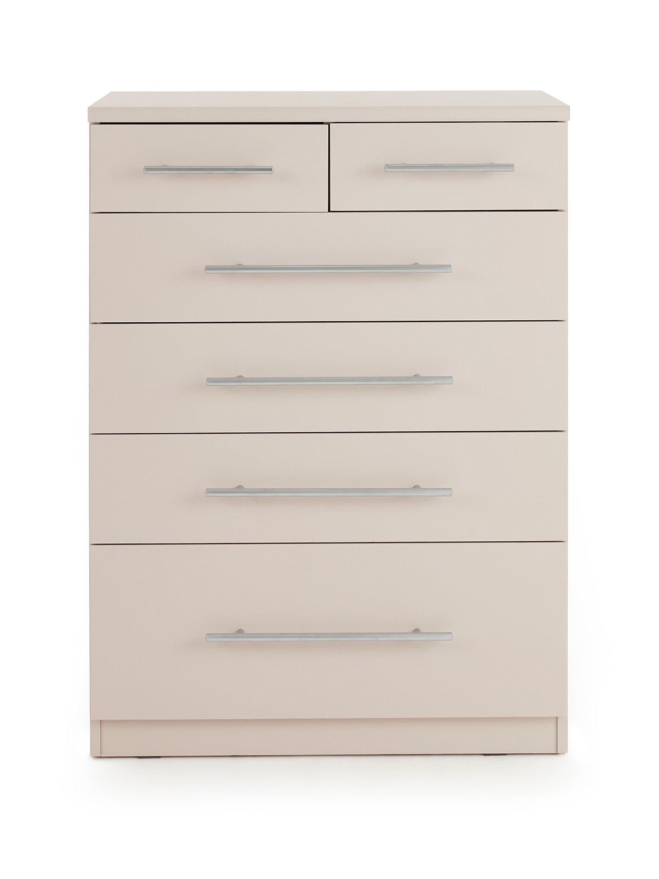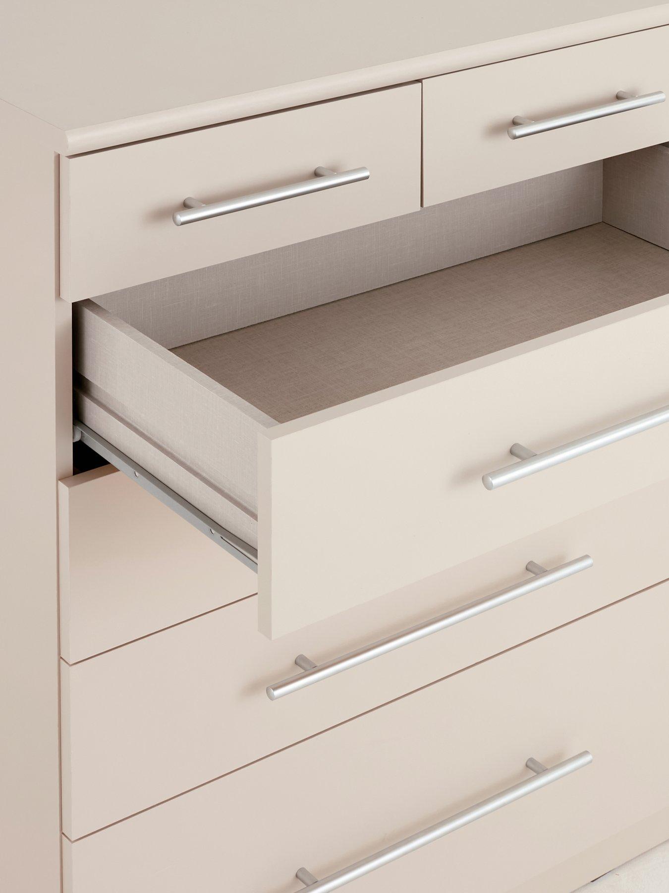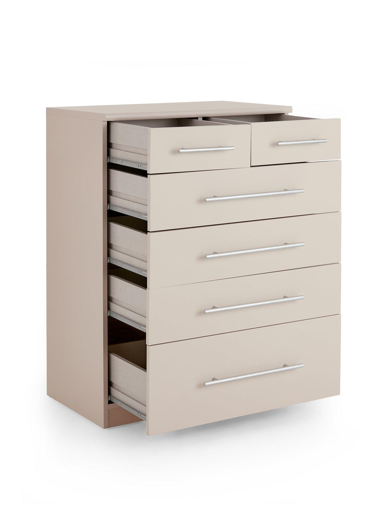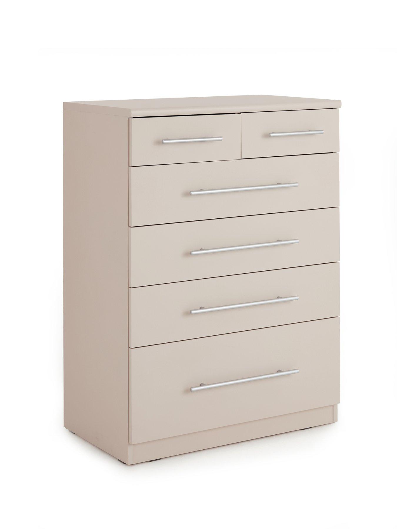 Very Home Prague Graduated 4 + 2 Chest of Drawers in OatmealThis chest of drawers from our best-selling Prague collection of bedroom furniture features a smooth oatmeal shade and designer metal bar handles. The drawers open smoothly on easy-glide metal runners, and the bottom drawer has a graduated design that makes it perfect for thicker items like jumpers.Get the look with matching bedroom furniture in the Prague range. Please remember to measure your available space before ordering. Dimensions: Height 95.1, Width 69.9, Depth 41.6 cm