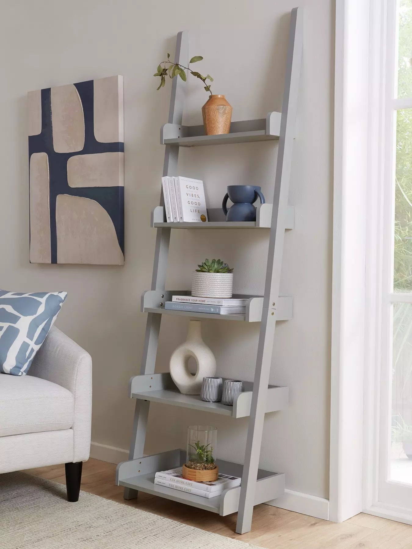 Ideal for the lounge, bedroom or home office, this 5 tier shelf has a modern ladder design and comes in a smooth grey shade.Designed to lean against a wall, its 5 shelves have a raised lip to the sides and back to help your fave things stay stable and in place, while the tiered sizes get bigger as they move towards the floor, so you can show off a range of different ornaments, pictures, books and more.