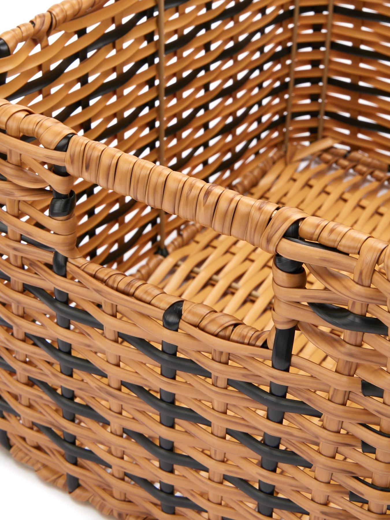 Basket in rectangle shape provides a stylish way to store and display your favorite home décor. It is handcrafted of poly rattan over a sturdy iron frame and sufficiently light for easy carrying. In combination of natural and black tones, this basket blends well with any décor.