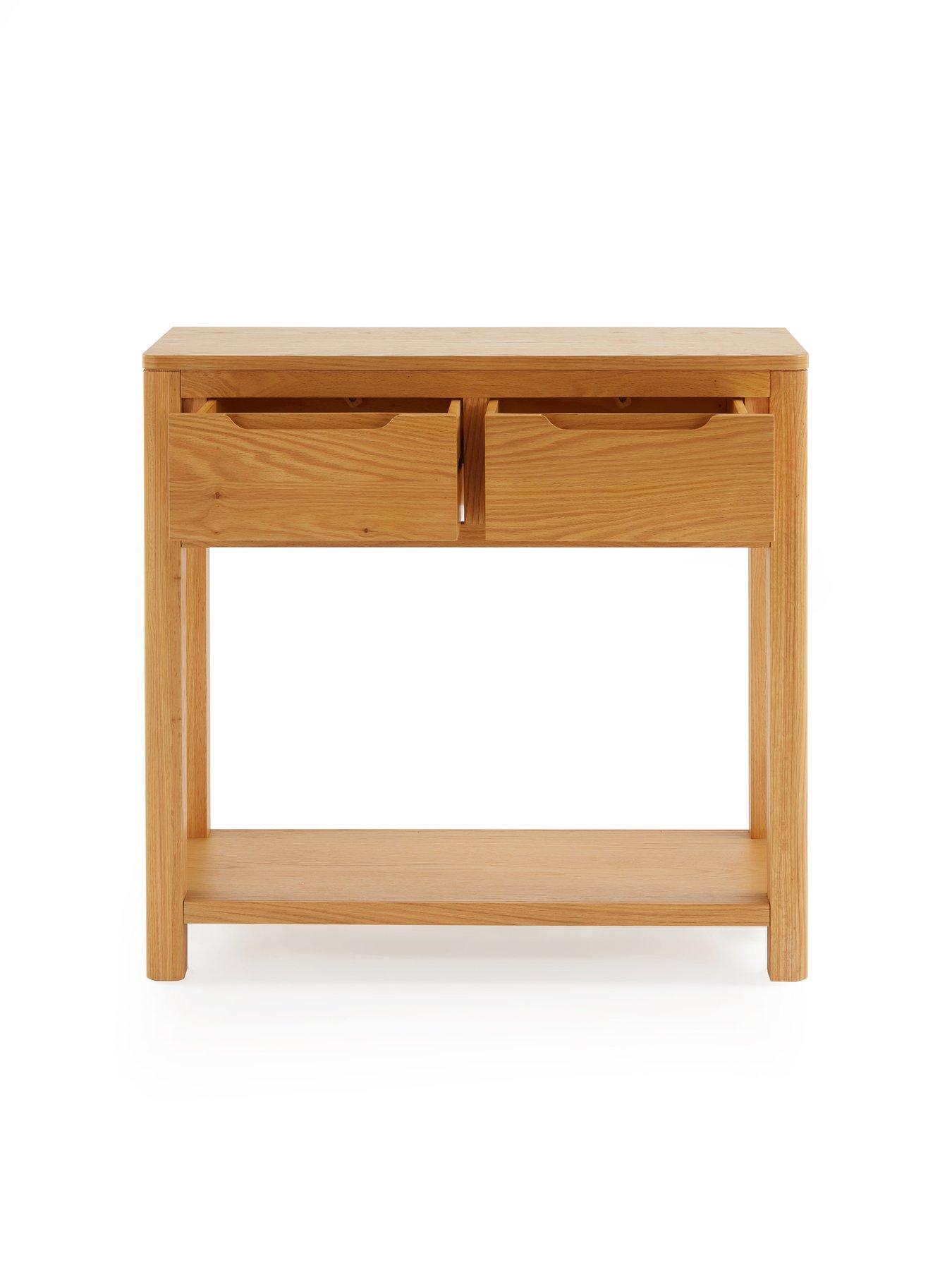 The Very Collection Saxon 2 Drawer Console Table with Shelf in Oak EffectCountry cottage oak-effect with two storage drawers that feature modern cut-out handles. Great for placing in a hallway, it's thoughtfully finished with smooth curved corners and a shelf for extra display options.Please remember to measure your available space before ordering. Dimensions: Height 40, Width 39.5, Depth 25 cm