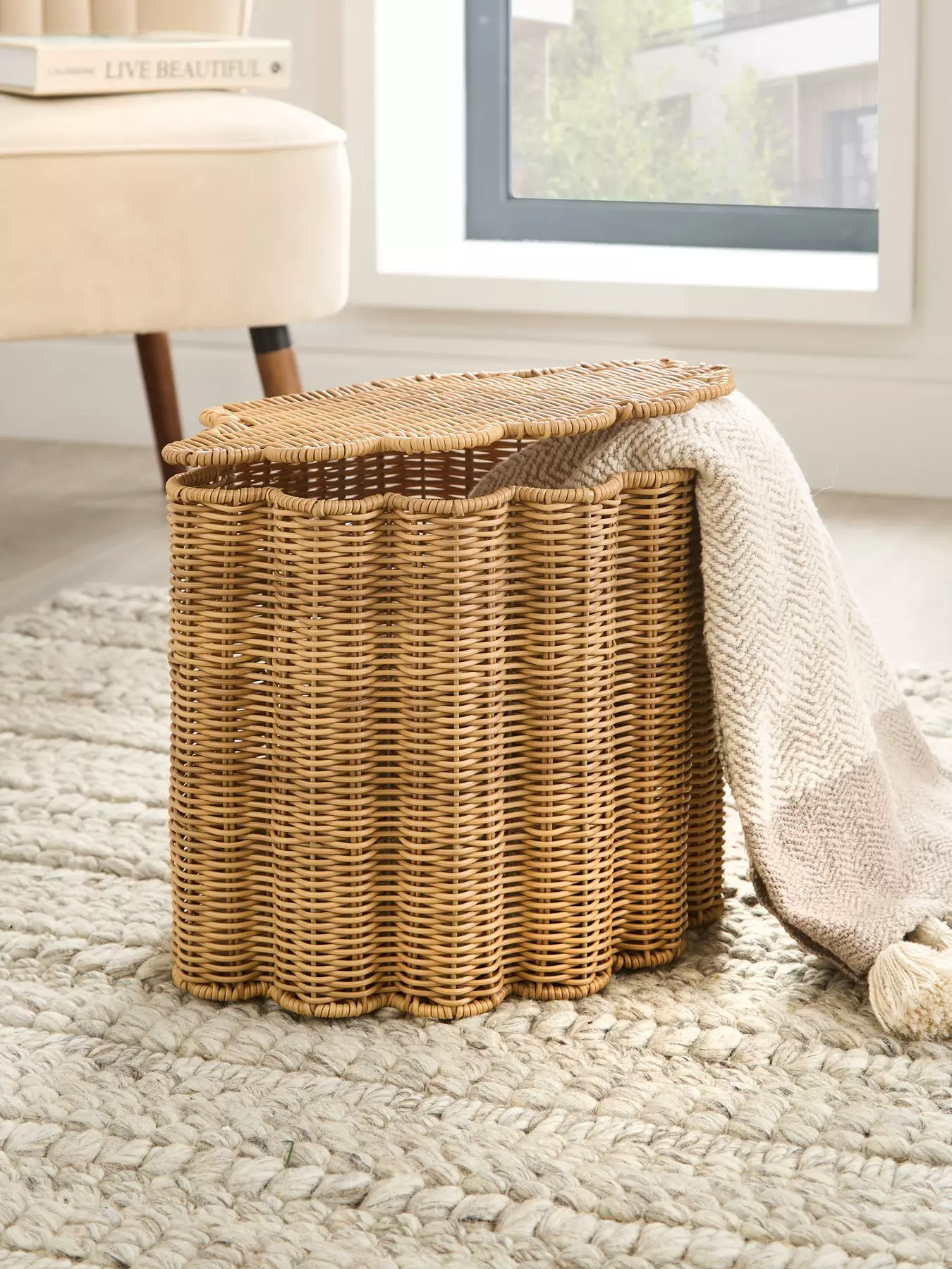 Scalloped basket with lid, in natural tubular polyrattan, no inner fabric- Depth: 30 CM