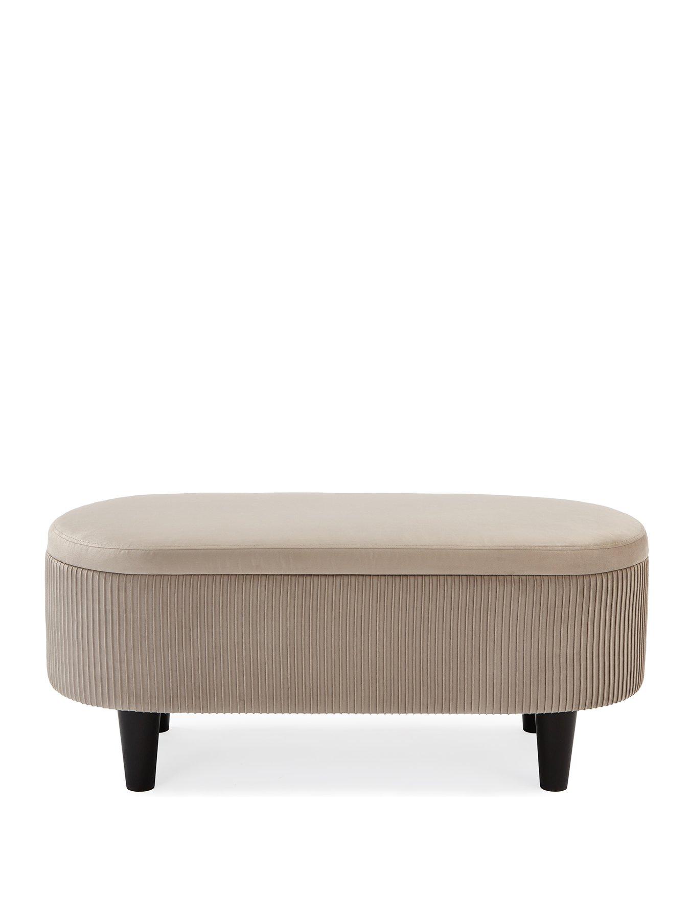 Very Home Serenity Pleated Fabric Ottoman in NaturalInstead of keeping spare bedding in cupboards and drawers, taking up valuable storage space, organise them in this ottoman by Very Home.Ideal for sitting at the end of your bed, it has a curved shape and is upholstered in a soft natural coloured fabric. The fabric covering the base is stunningly pleated for a decorative finish, while the plain lid contrasts eye-catchingly. The blanket box sits on chunky tapered wooden feet in a dark colour. The anti-slam lid is held open by a small piston arm until you're ready to close it again, and the ottoman also makes a comfy seat - perfect when you're getting dressed in the morning. Matching bed also available separately - see VRG0Y for the double or VRG0Z for the king size. Please remember to measure your available space before ordering.
