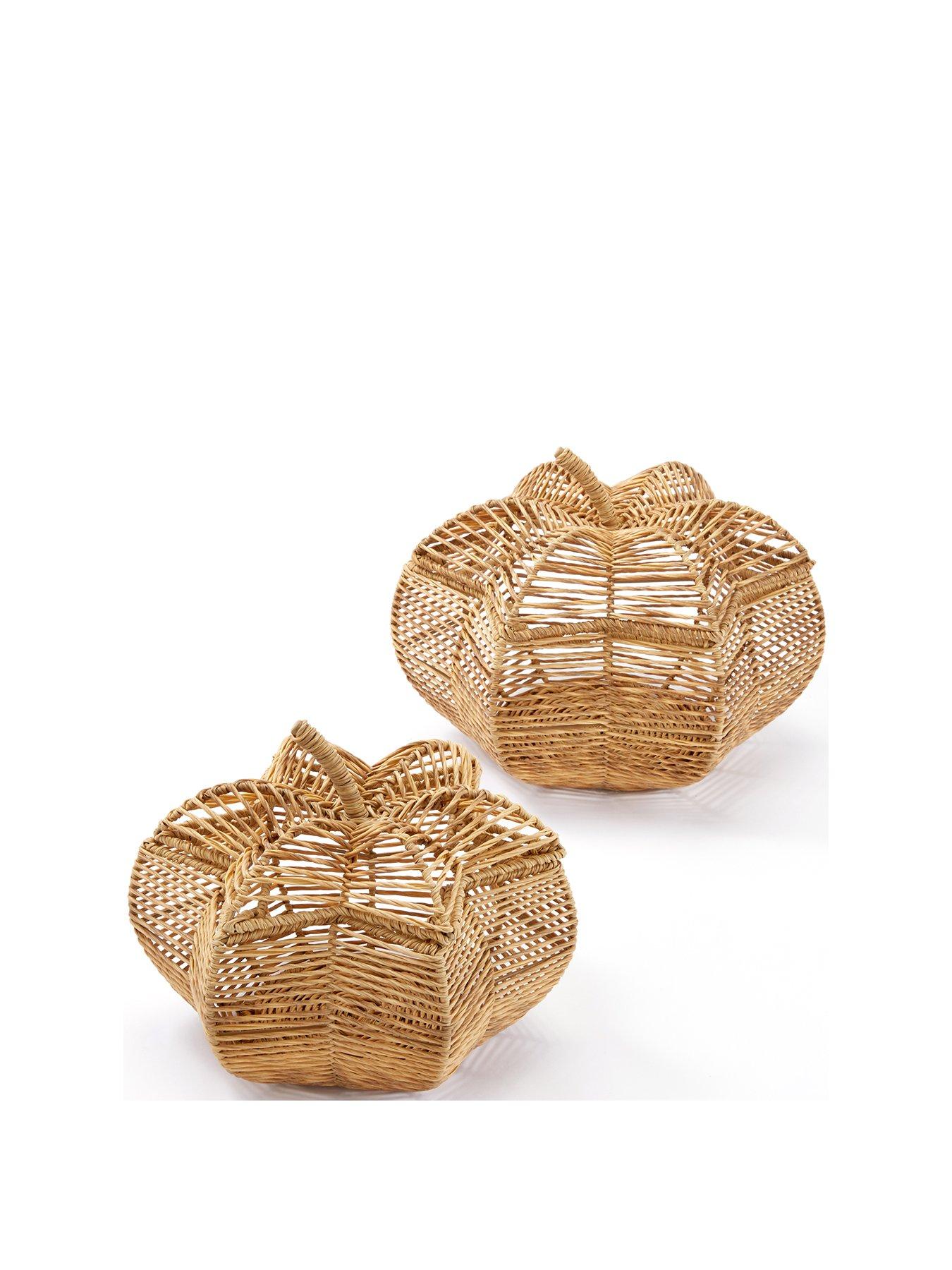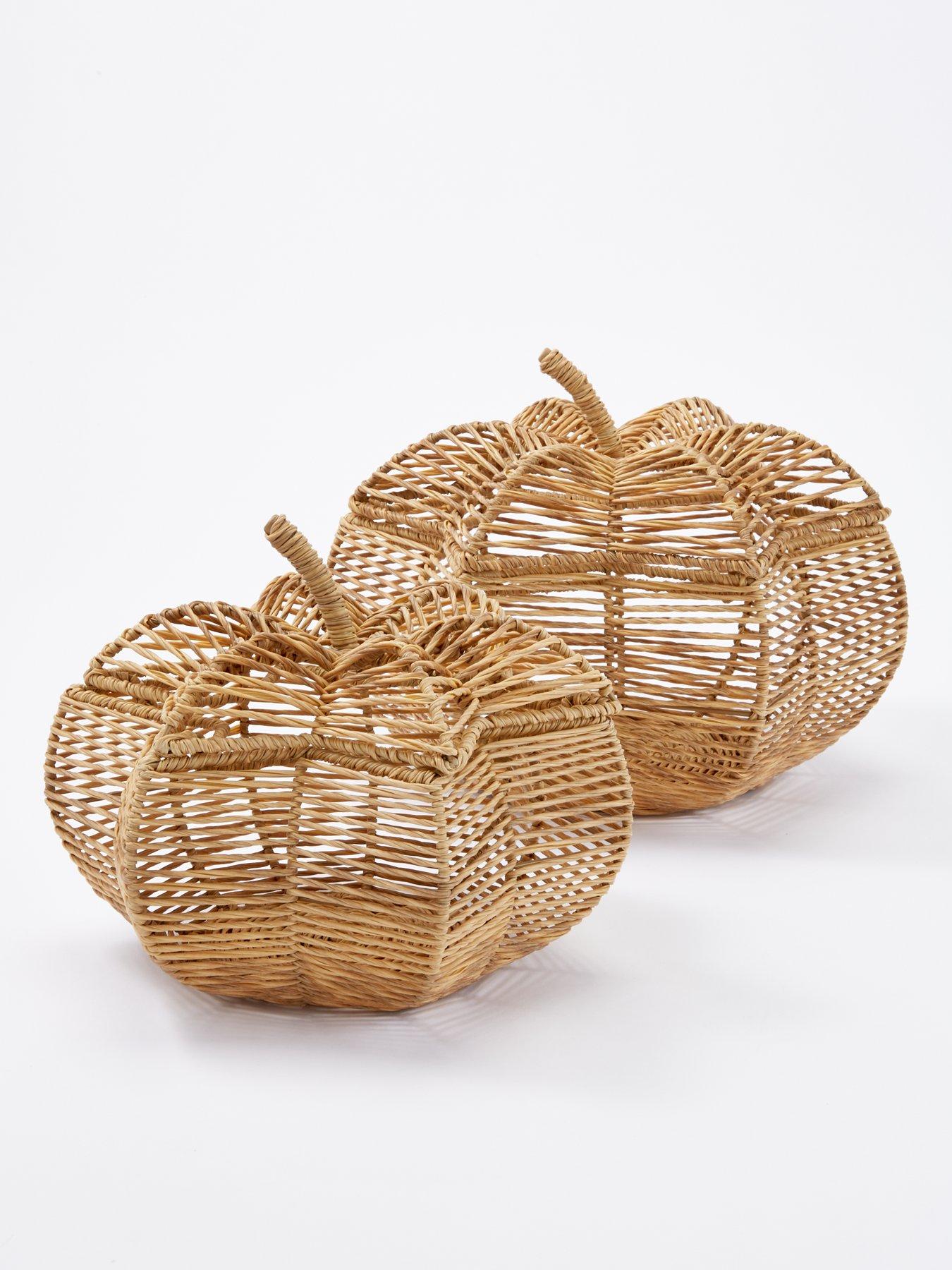 Very Home Set Of 2 Pumpkin StorageArtistically crafted hand-woven poly rattan pumpkin baskets with lids come as a lovely set of two. It will be perfect for storage in a bathroom, bedroom, living room, or office.
