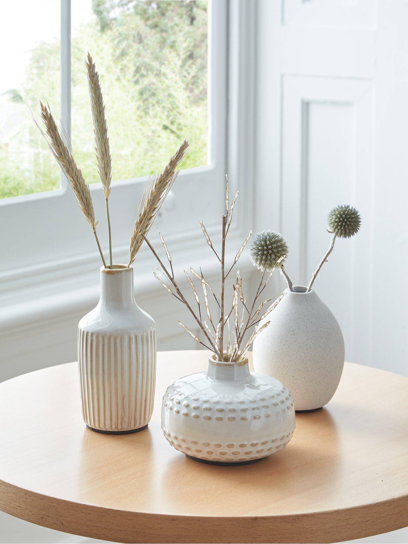 Very Home Set of 3 Mini Bud VasesA fab miniaturised take on traditional designs, this trio of vases from Very Home offer a unique way to add depth and texture to your space.All three come in a natural colourway that looks just as good with faux flowers inside as they do when used as purely decorative pieces. Spread them equally around a room to build a consistent look in your space, or place together on a sideboard or shelf to add subtle artisan beauty to a key spot. Dimensions: Small: H7 x D9.5 cm Medium: H9.5 x D7 cm Large: H12 x D6 cm