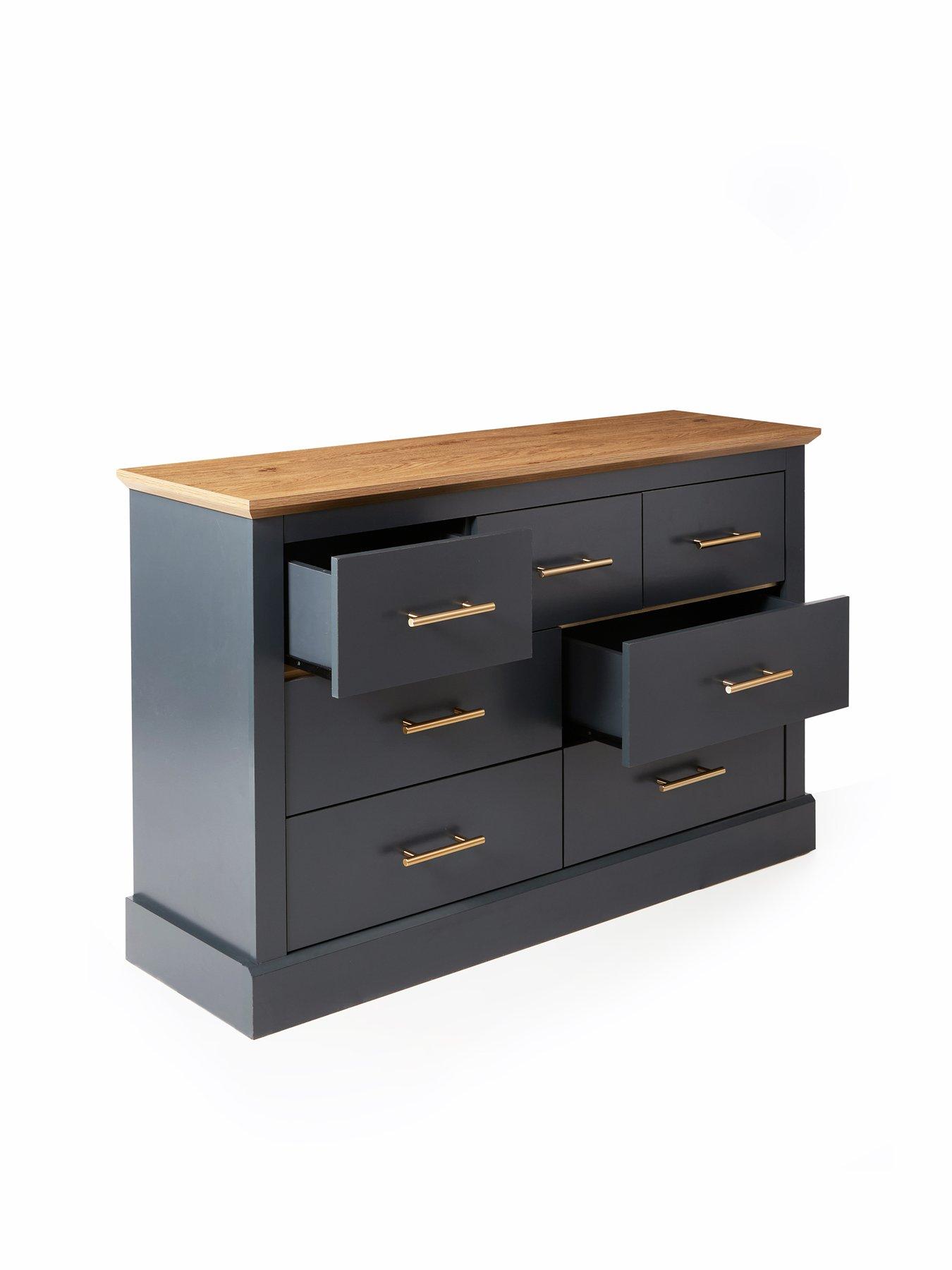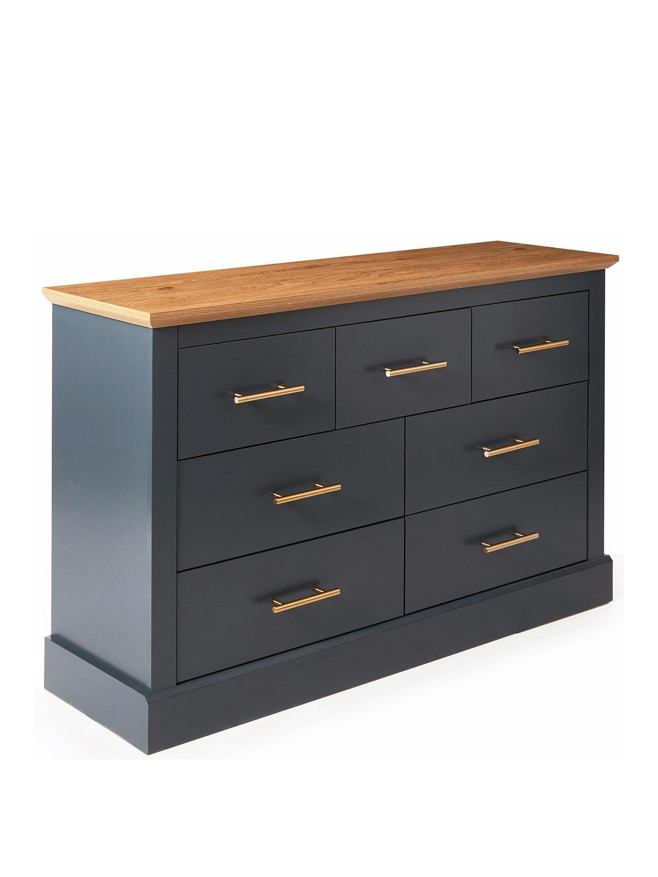 Very Home Shenfield 3 + 4 Chest of Drawers in Graphite/Wood Effect - FSC® CertifiedThis stunning chest of drawers comes from Very Home's Shenfield collection of furniture. Standing on a chunky plinth, it's finished in a graphite colourway and boasts a contrasting wood-effect top. A total of 7 drawers are accented with metal bar handles and glide open on metal runners.Please remember to measure your available space before ordering. Dimensions: Height 73.6, Width 119, Depth 35.3 cm