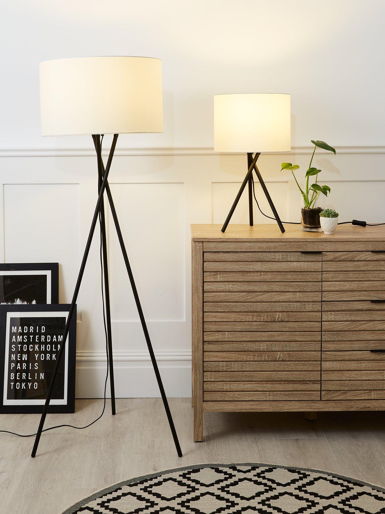 Sherlock Floor Lamp in Cream and Black - 153 cmA contemporary take on classic designs, style is elementary for the Sherlock floor lamp. Its good looks are thanks to the metal tripod base, which has a matt black painted finish. This leads up towards a cream shade - perfect for adding a splash of elegance to an unused corner of the room.A matching table lamp, as well as a range of alternative colour options, is available to add separately. Requires 1x E27 bulb (not included).