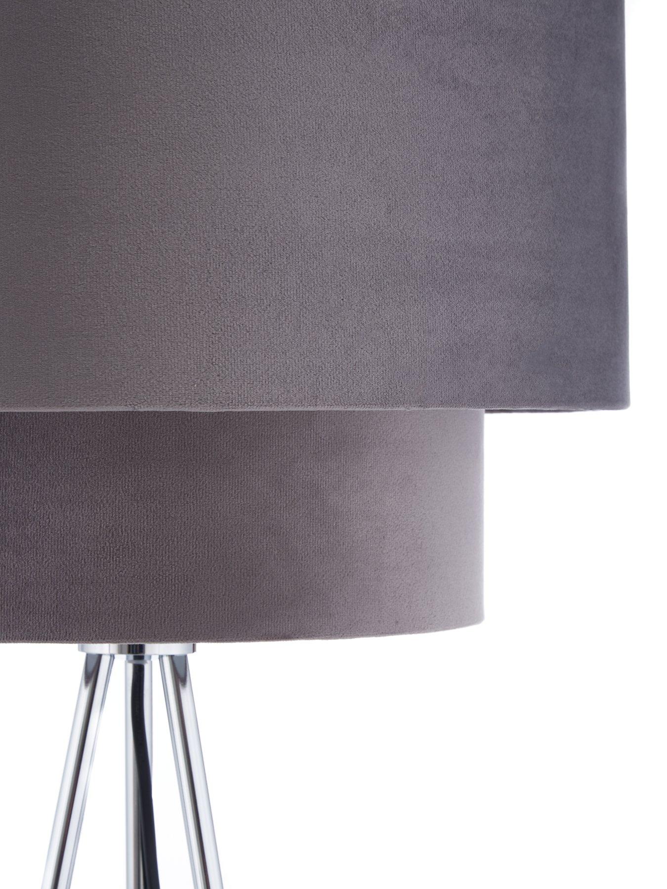 Tia Two Tiered Floor Lamp in Grey/Silver - 155 cmAn eye-catching take on the tripod style, this Tia floor lamp features metal legs in a shiny chrome plated finish that catches the light. A soft grey velvet shade flaunts two tiers to make it even more eye-catching. Place it in a living room, bedroom, reading area or any other space in your home that could benefit from a little extra style and shine.Also available in navy/brass (see item number TLM44). Dimensions: Height 155, Diameter 40 cm