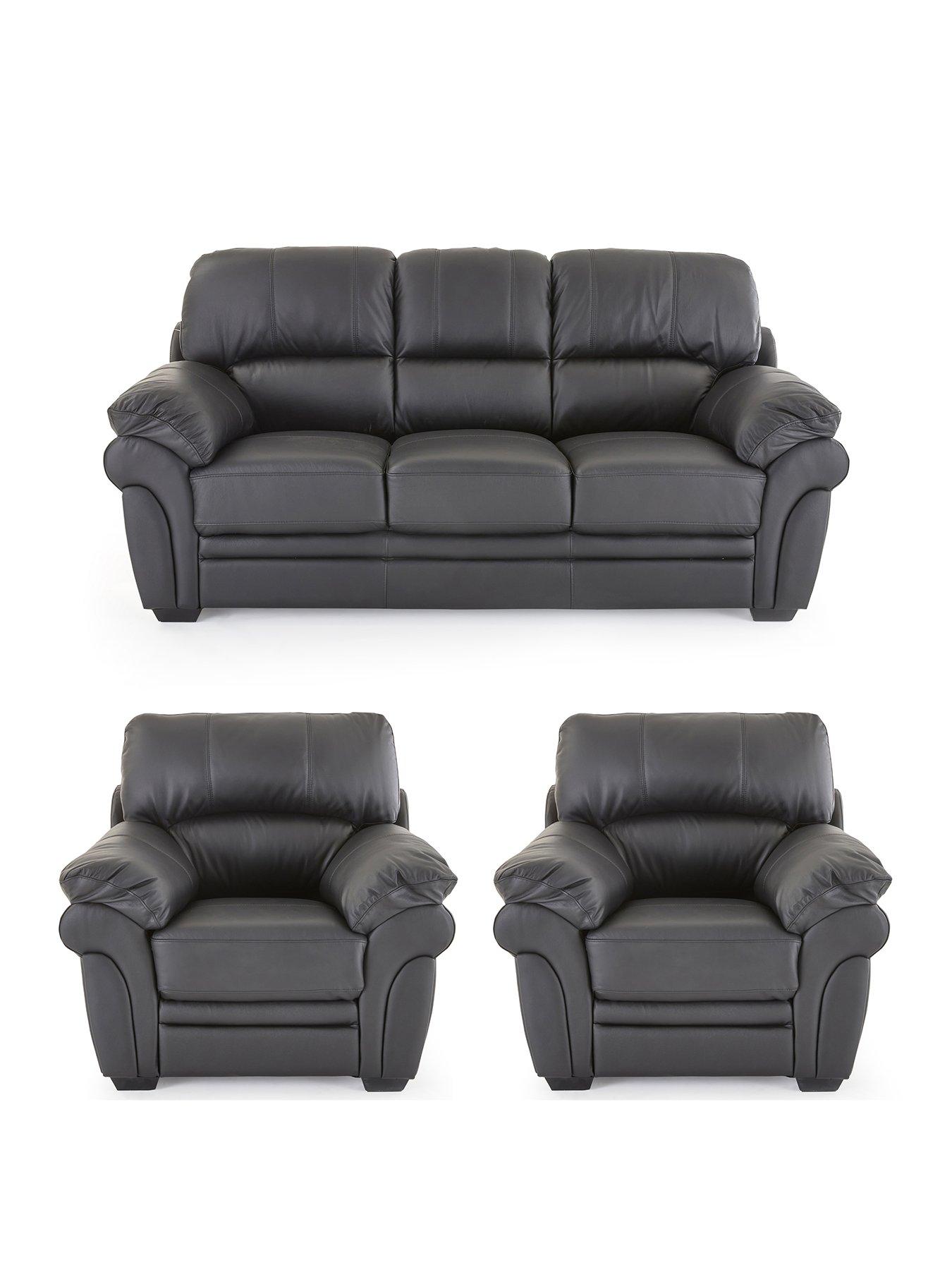 SAVE with this package deal that gives you the Very Home Wilmslow 3 Leather Sofa and 2 Armchairs for a far lower price than if you purchased them separatelyThis is a very large item. For delivery, customers must ensure there is adequate doorway space and access for this item to fit through, and that the route from the delivery vehicle to your home is free of obstacles or tripping hazards. The dimensions for this item when packaged are L 208, W 94, D 76 cm.Luxury leather Displaying that unmistakable texture, look and scent you love, this high quality leather fabric will age beautifully and is offered in chic black or mouth-watering chocolate. Love to lounge Seats boast a supportive foam core and a soft fibre wrap, while pocket springs add comfy, shape-retaining bounce. The split design of the fibre-filled back cushions add extra comfort to your lumbar region. Free Swatch Service Get a feel for this fabric before you buy with our FREE swatch service. Simply email SwatchOrder@ClickSpares.co.uk with your name and address, along with the sofa range name, item number, colour choice and the name of the retailer’s website you’re ordering from. Your swatches will be delivered within 5 working days (subject to availability). Please remember to measure your available space before ordering. Dimensions: Sofa - Height 90, Width 202, Depth 92 cm Armchairs - Height 90, Width 107, Depth 92 cm