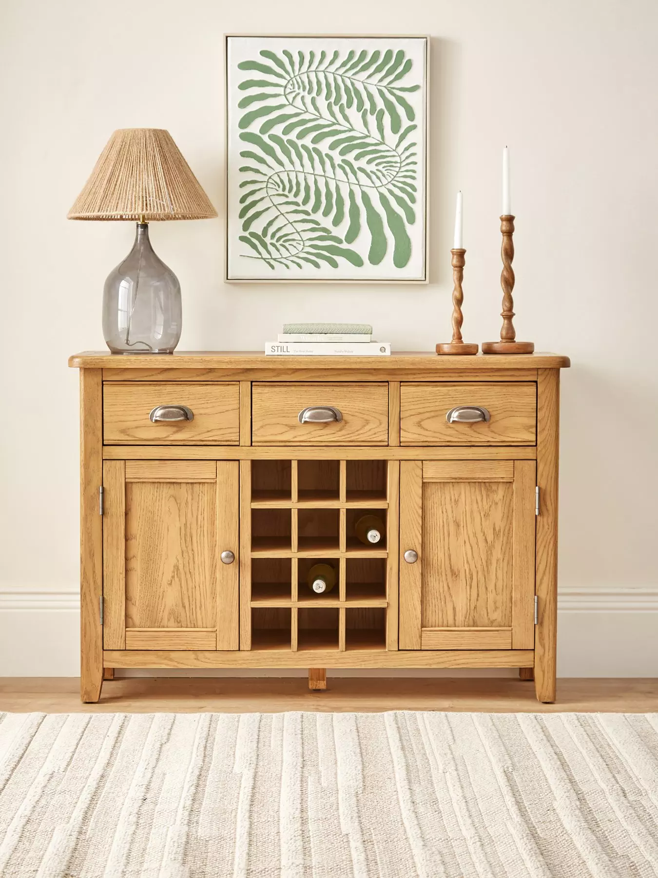 Made using oak and oak veneers, this large sideboard arrives ready assembled and includes a smart wine rack to the centre - suitable for up to 12 bottles of wine or any of your other favourite tipples!There's also two cupboards with traditionally panelled doors and internal shelving, plus three drawers for added storage. The doors are accented with metal knob handles while the drawers feature metal cup handles.