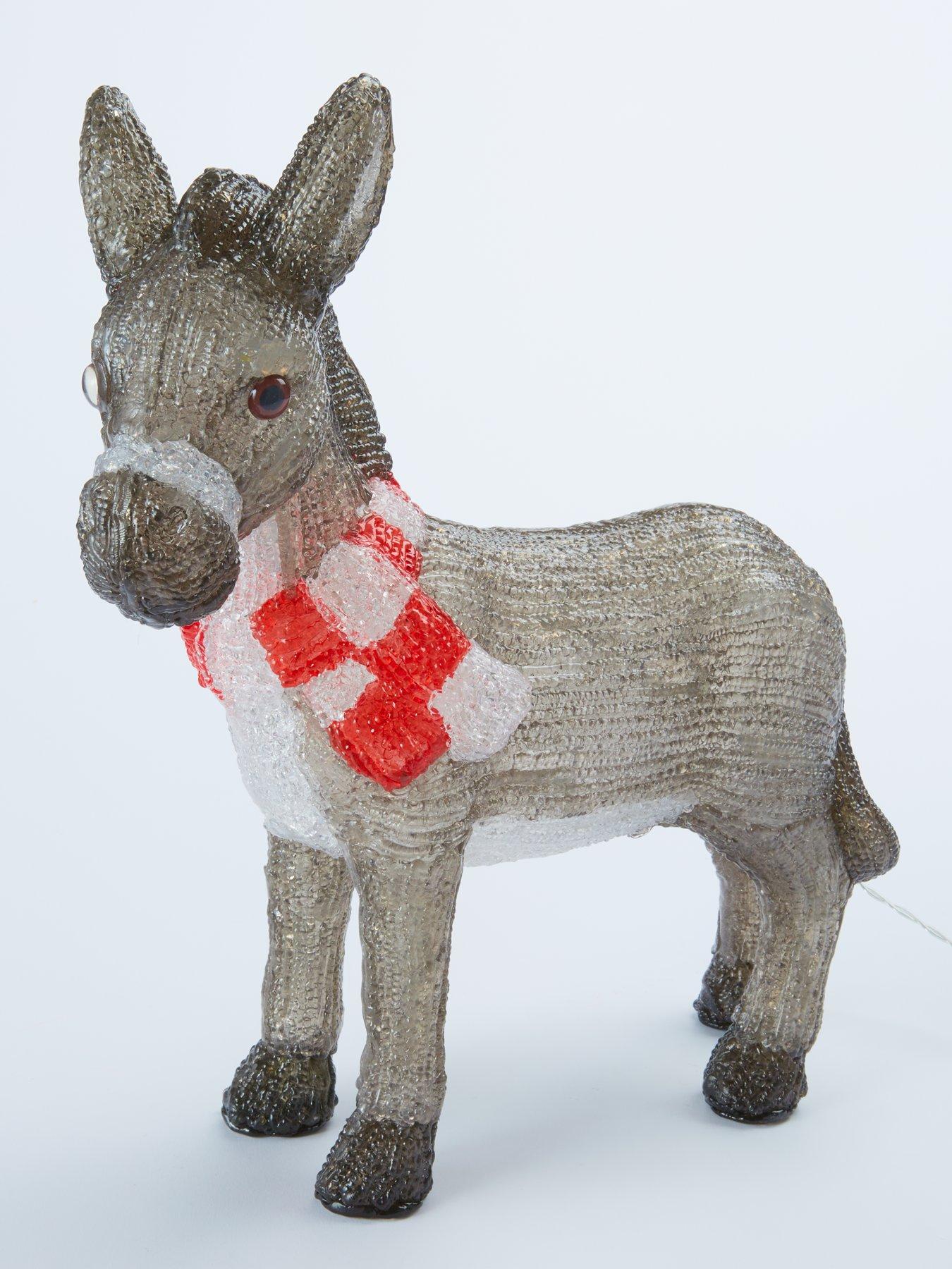 Three Kings Dominic The Donkey Outdoor Acrylic Light Battery OperatedThis cute decoration by Three Kings is inspired by the beloved Christmas song about a dainty donkey who helps Santa deliver presents to the children of Italy after his reindeer are unable to make it up the hills.This version of the character is far too tired to pull a sleigh, and is content instead to spend the festive season standing in your garden grotto. Wearing a stripy scarf to keep him snug, the acrylic ornament contains 30 cool white LEDs to illuminate him when darkness falls. Suitable for indoor or outdoor use, it's battery powered for added ease, so you don't need to worry about finding a socket. And to help save battery power the auto timer will turn the lights off at night!