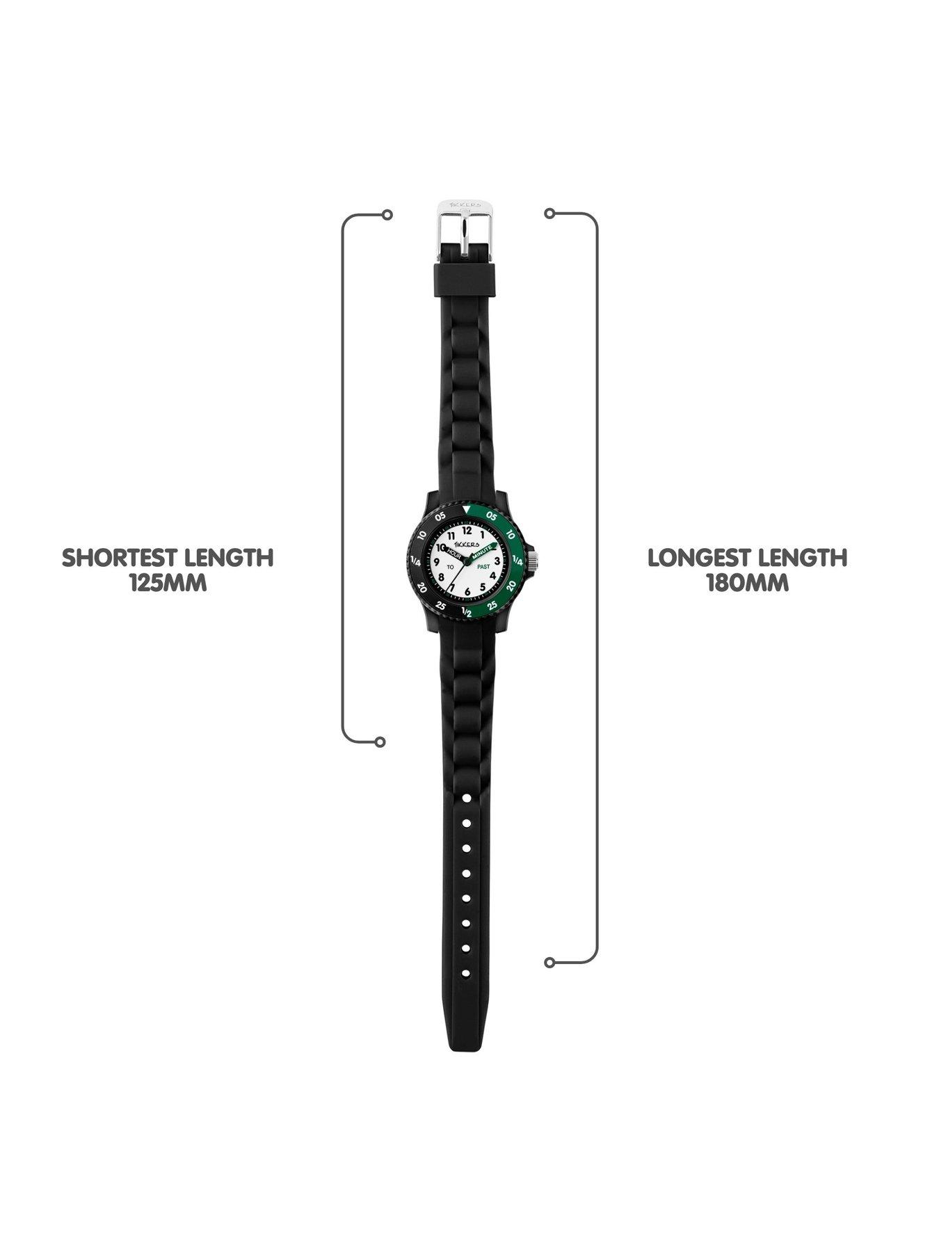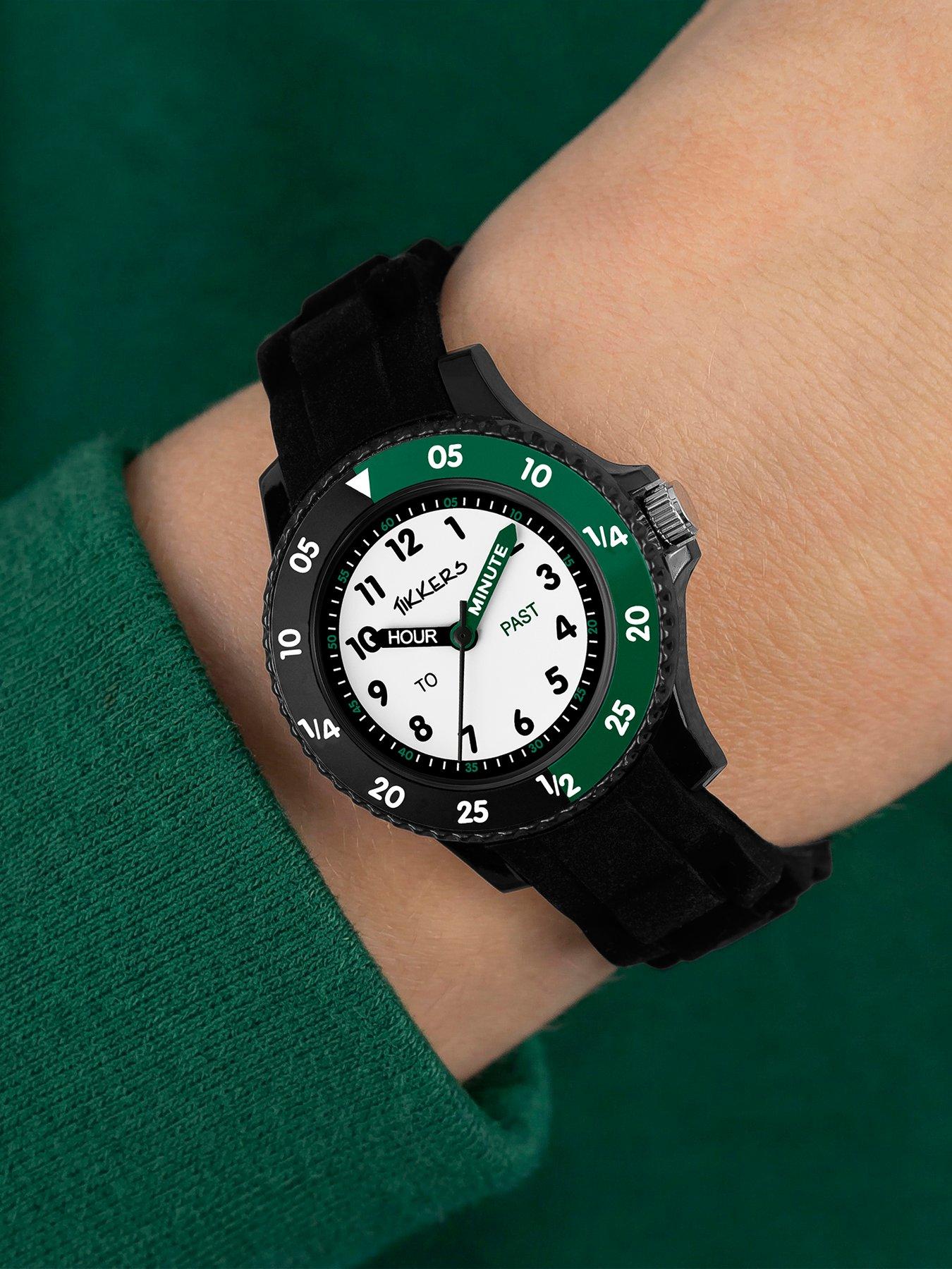 Tikkers Tikkers Black Silicone strap Timer Teacher WatchTikkers Black time teacher silicone strap watch. Features a black coloured silicone strap with a matching coloured case, a black and green bezel design and easy to read time teacher dial. Presented in a super cool giftbox. All Tikkers watches have a one year guarantee.