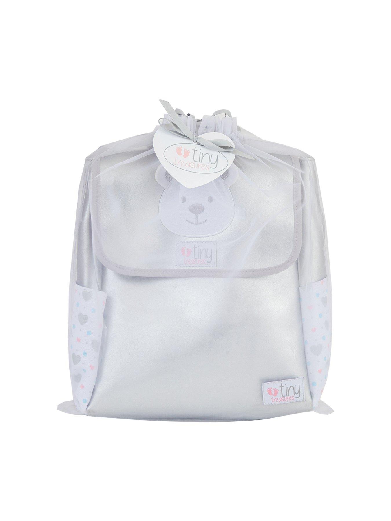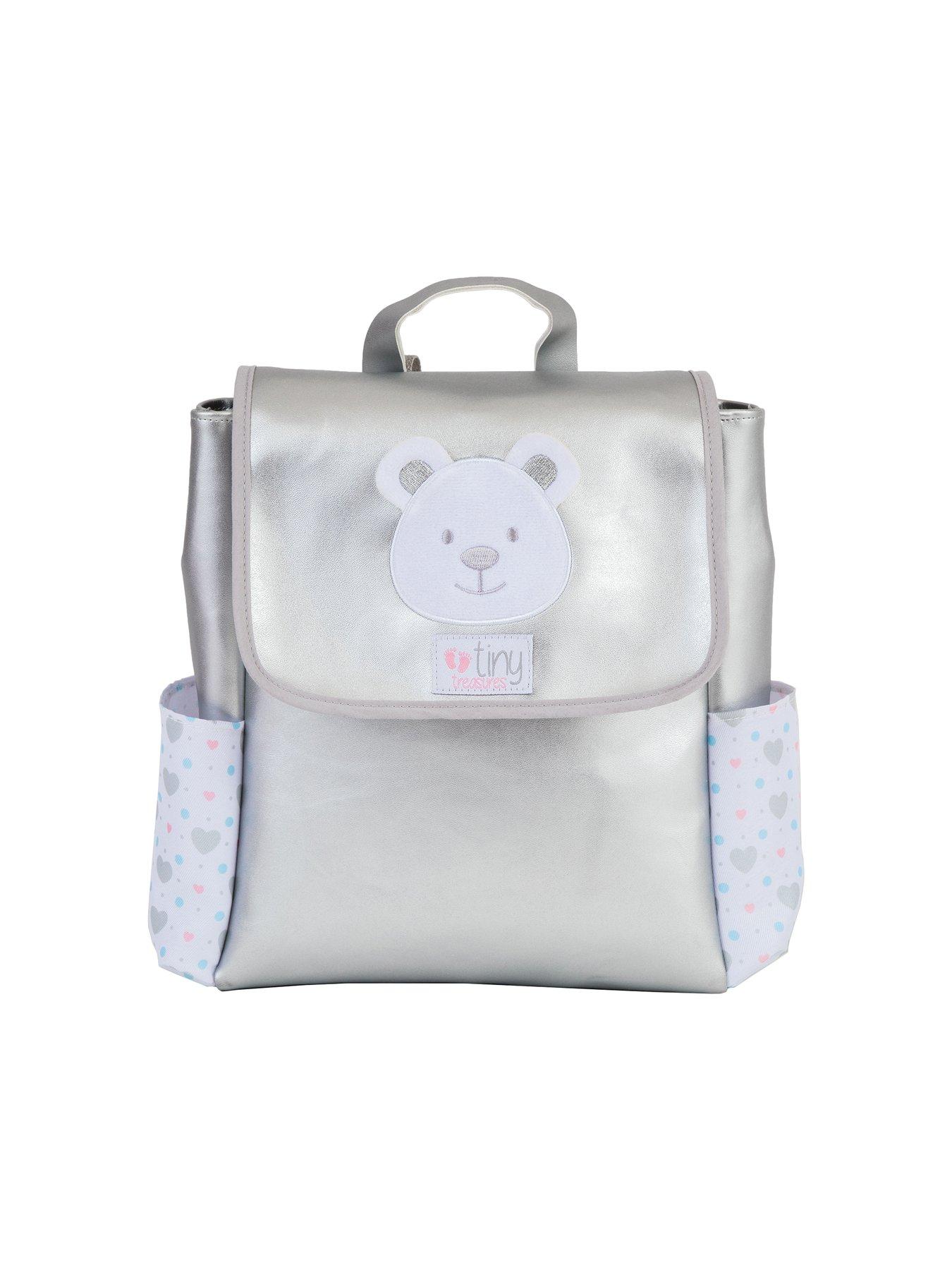 Tiny Treasures Tiny Treasures Baby Doll Changing BagAlways be ready for baby doll care adventures with this super stylish changing bag rucksack! Made from shiny silver leatherette fabric, it features a totally adorable teddy bear face on the front that's sure to make you smile. With handy side pockets for extra storage, you can keep all your doll's essentials neat, tidy, and ready for action!Inside, little ones will find everything they need to take care of their Tiny Treasures baby doll - a feeding bottle, changing mat, bandana teddy bib, baby hairbrush, dummy, and nappy. It's all packed and ready for them to step into their role as the best 'pretend parent' ever - whether it's feeding, changing, or brushing their baby doll's hair. With the Tiny Treasures Baby Changing Bag, little ones will have everything they need at their fingertips for endless fun and imaginative play!