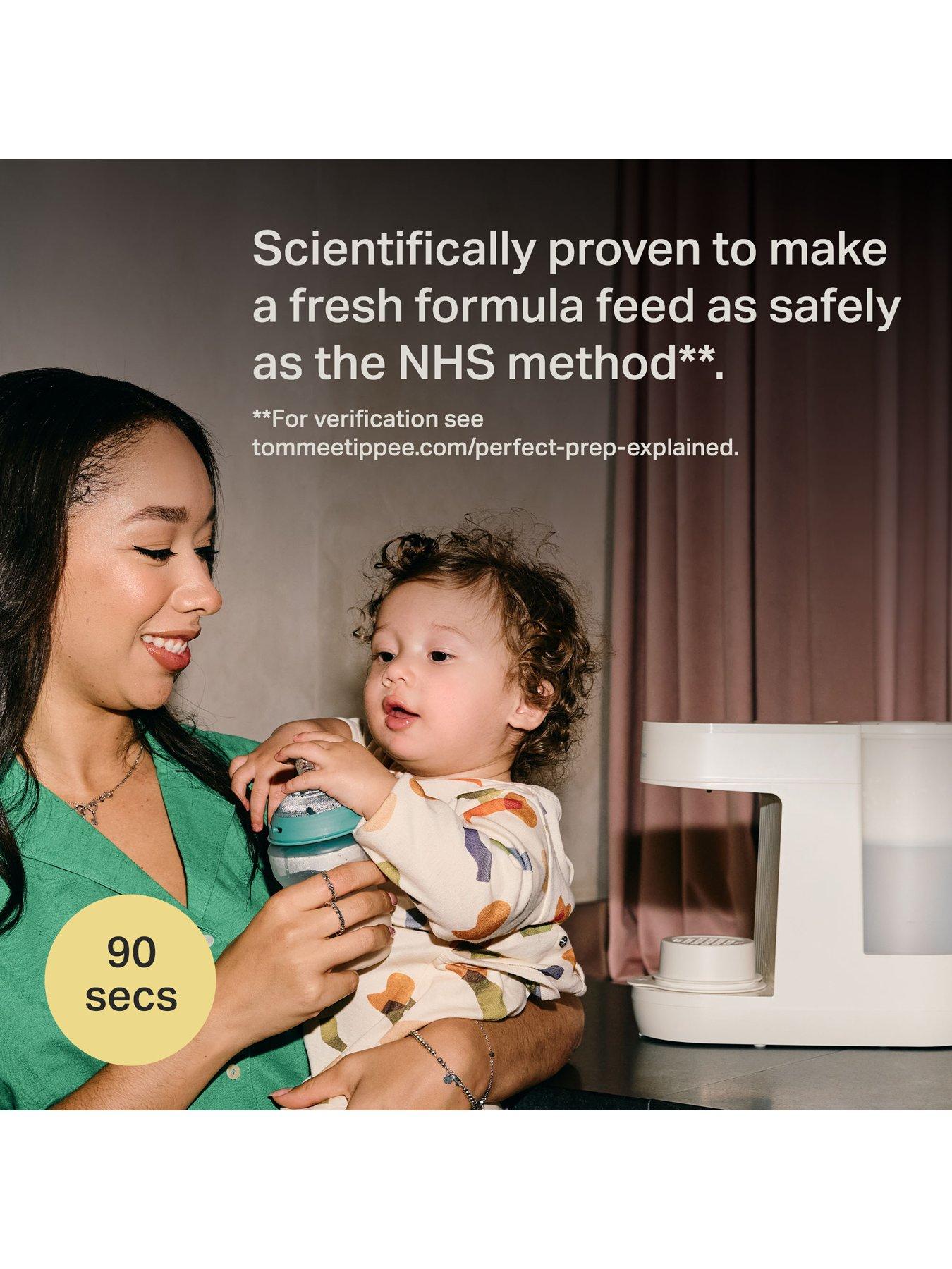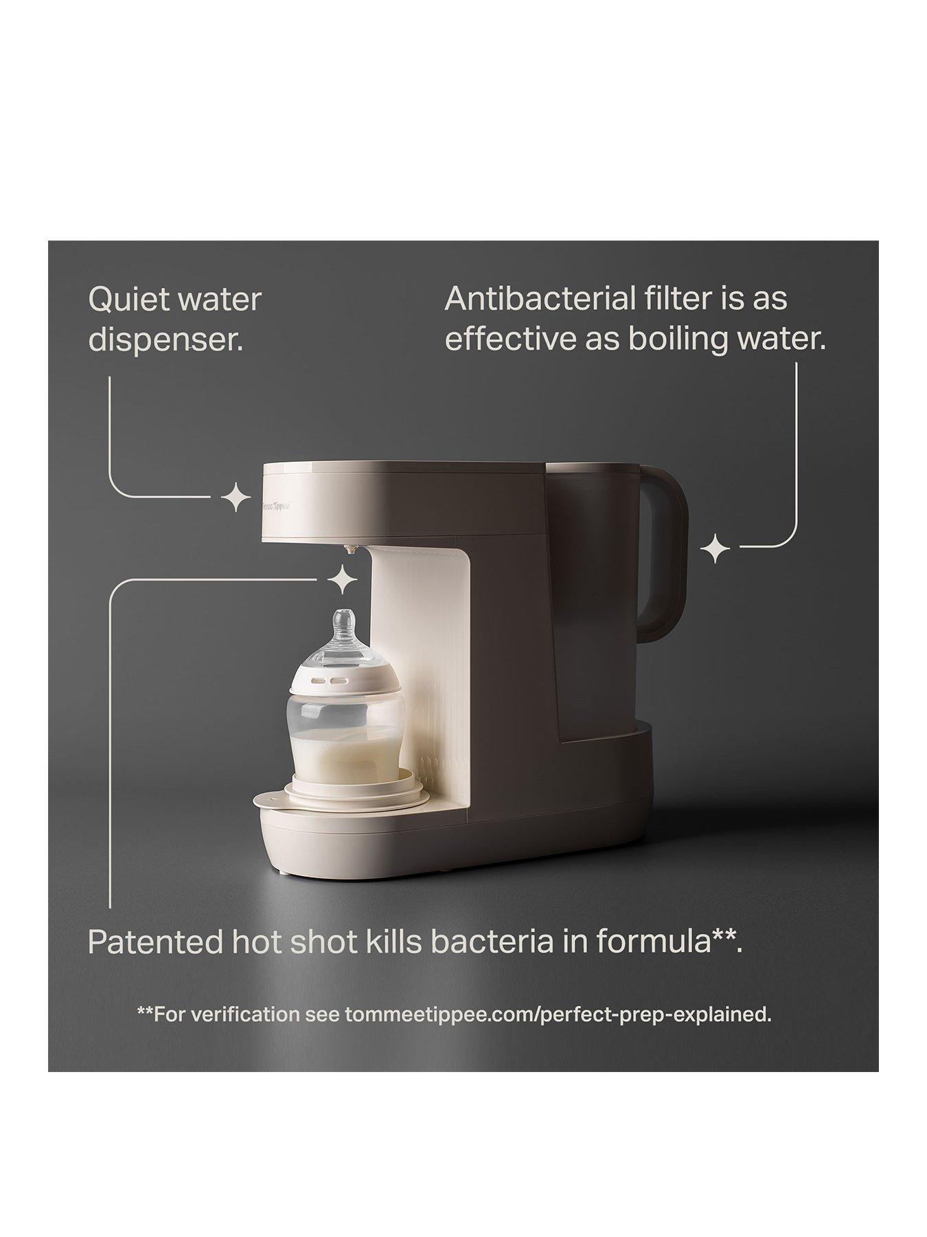 Tommee Tippee TT NEW PERFECT PREP SLATE UKMakes a body temperature bottle in just 90 seconds (that's up to 10x faster than a kettle). It's quick, quiet, and scientifically proven to make a fresh formula feed as safely as the NHS method. Baby bottle preparation made even more perfect. 1. Scoop formula powder into a sterile bottle 2. Select feed size on the one-touch dial 3. Press the power button to add the hot shot 4. Twist on a milk lid, and swirl to mix 5. Press the power button to add the remaining cool filtered water - The antibacterial filter is as effective as boiling water, and our patented hot shot kills bacteria in formula - Smooth water dispenser and soft lights for less disruptive night feeds - 4-11oz feeds, one-touch selection - Fresh bottles for baby, fresh water for you (and the whole family). Use the removable jug to store and serve filtered water - Intuitive iOS and Android app with set up guides, product support and filter reordering Comes with a milk storage lid, a 150ml Natural Start baby bottle and an antibacterial filter that lasts up to 3 months, your machine will let you know when it's time to fit a new filter. *Based on a 5oz feed, room temperature water tank, refers to time from start of hot shot to completion of cool shot. For verification see tommeetippee.com/perfect-prep-explained. If you use your water jug for daily water consumption in your household (outside of the machine) you should change your Tommee Tippee water filter every 4 weeks to ensure optimum performance. Based on preparing 6x 9oz bottles per day. | |