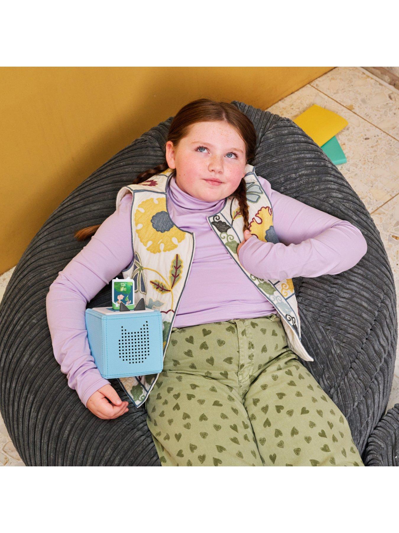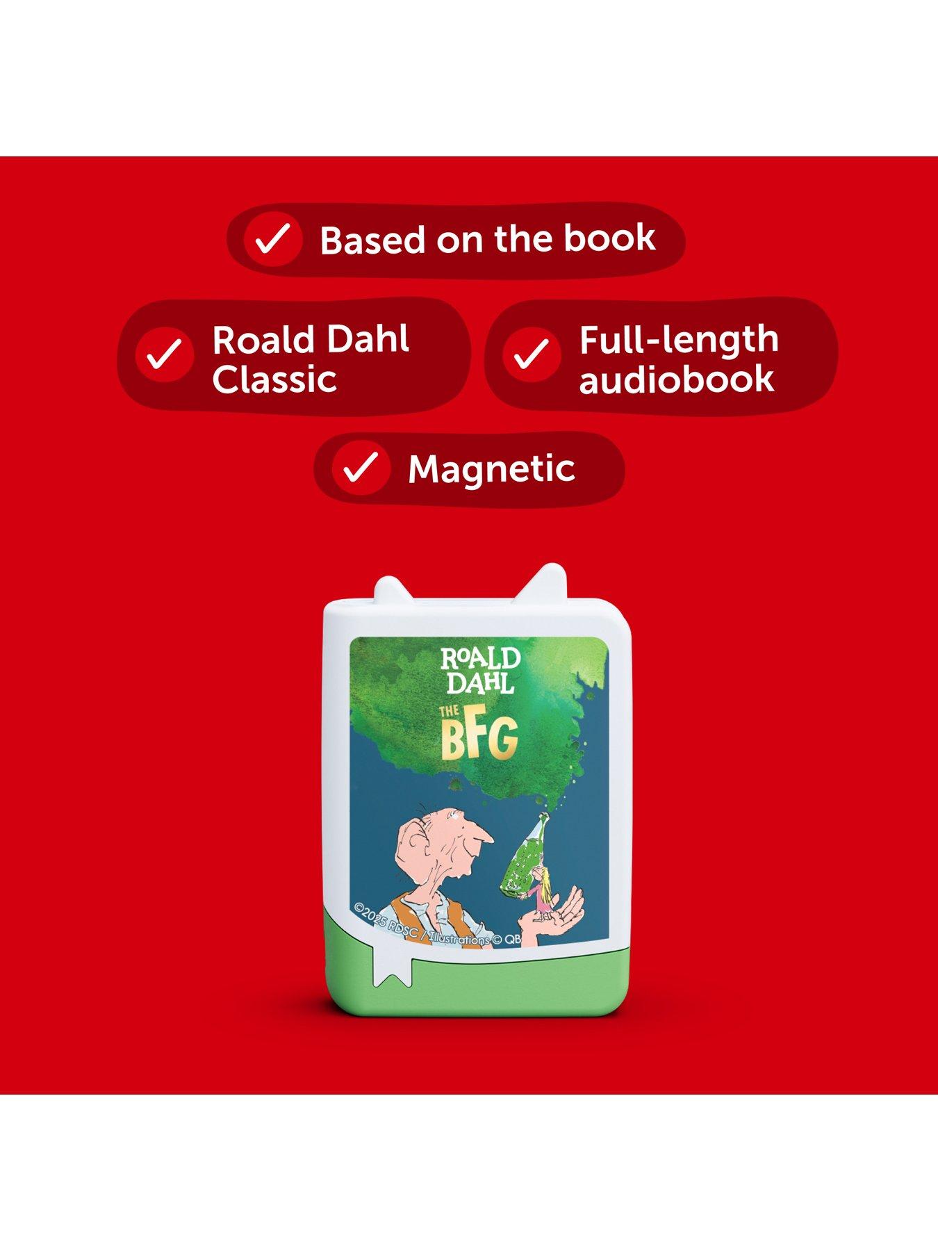 Bring a Roald Dahl classic to life with Tonies The BFG.One moonlit night, Sophie is snatched by a giant! Luckily, he’s friendly, preferring snozzcumbers to children. But the other child-guzzling giants aren’t so friendly. Your little human beans need only pop this Tonie on their Toniebox to be transported to Dream Country and the gloriumptious Roald Dahl story.Please note: Toniebox not included (available separately) Approx run time: 240 mins