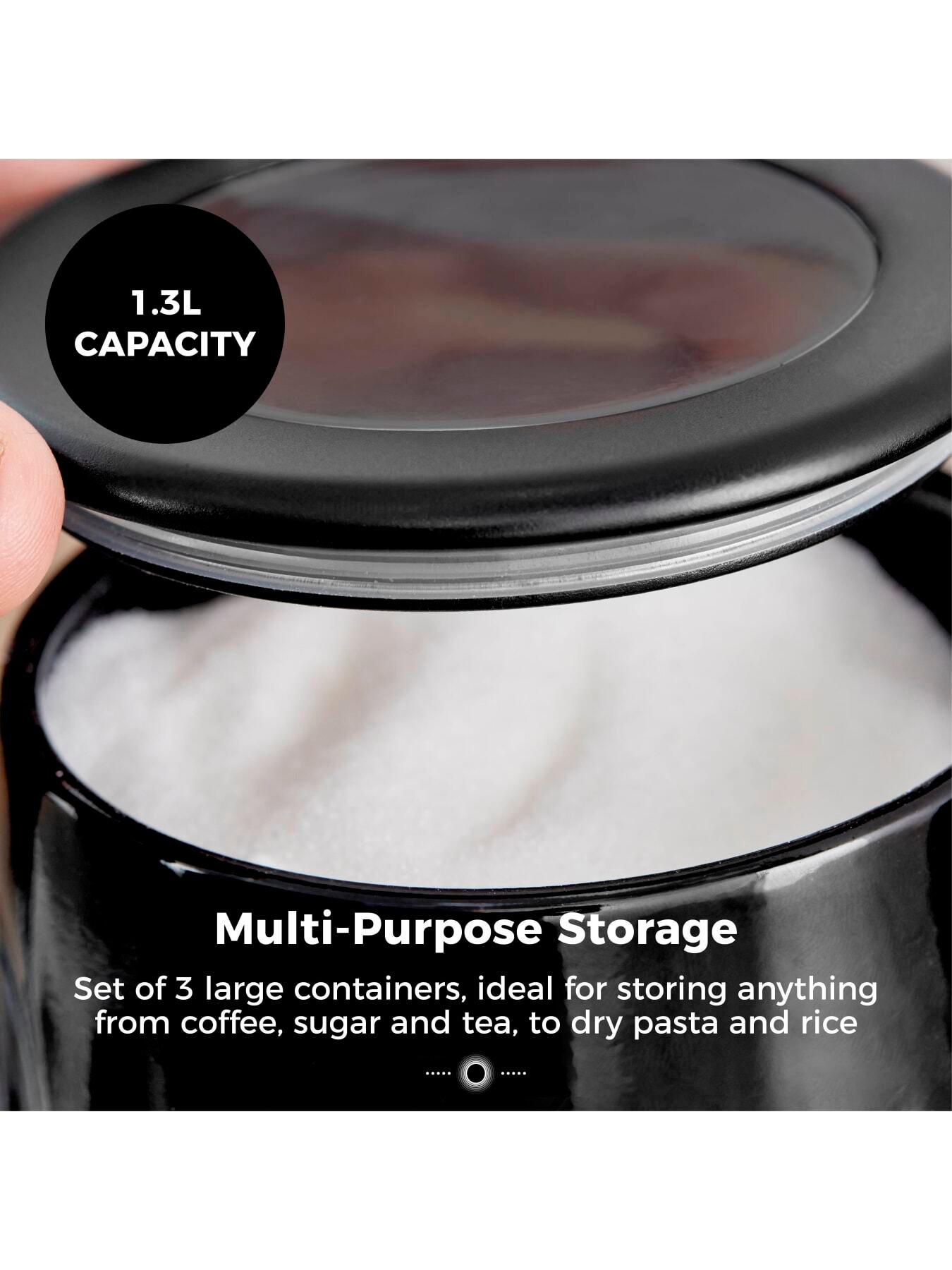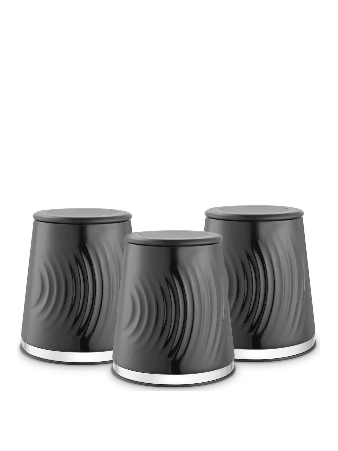 Tower Sonar Set Of 3 CanistersLet your tea, coffee, sugar and other ingredients take centre stage in your kitchen with this stylish Set of 3 Canisters from Tower's Sonar collection. The sleek black exterior combines with the steel ring base to create a beautiful aesthetic that complements any kitchen. Providing a spacious 1.3L capacity, you can load them up to the brim of your favourite ingredients, so there's no need to constantly refill them. The plastic lid is airtight to keep the contents fresher for longer, whilst the clear viewing window will let you monitor the contents, so you know when it is time to refill. The canisters are built to last and are easy to clean, requiring a swift wipe to maintain the quality finish. The non-slip feet prevent any damage or scratching to your work surfaces.SET OF 3 CANISTERS This stylish set of 3 canisters will elevate your kitchen's aesthetic, while making for perfect storage solutions for your tea, coffee, sugar and other ingredients 1.3L CAPACITY Providing a spacious 1.3L capacity, you can load them up to the brim of your favourite ingredients, so you don't have to constantly refill them MIRROR FINISHED STEEL RING BASE The sleek black patterned gloss finish is perfectly complemented by the mirror finished base ring to add a touch of luxury & elegance to any kitchen. It is also durable to lock in freshness and ensure long lasting quality PLASTIC LID WITH VIEWING WINDOW The plastic lid is airtight to lock in freshness and has a clear viewing window so you can easily see the contents without removing the lid NON-SLIP FEET The non-slip feet ensures the canisters do not scratch or cause damage to your worktops, keeping your kitchen looking neat 3 YEAR GUARANTEE Trusted Tower quality with a 1 year guarantee & optional 2 year extension, subject to product registration online