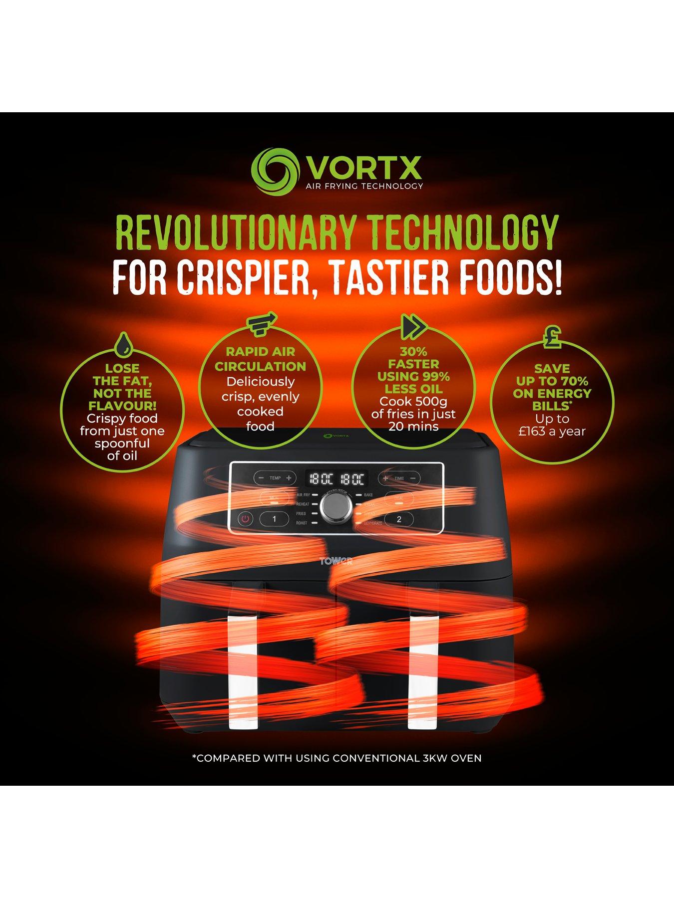 Tower T17181AFR Dual basket Digital Air fryer - Black with Chrome TrimCook your air fryer family favourites together. Two 4L baskets will cook food independently with individual timers and temperature settings for larger portions or cooking multiple food types at once Vortx Air Frying TechnologyExclusive to Tower Air Fryers, Vortx technology rapidly circulates hot air around food, cooking up to 30% faster than a conventional oven. Vortx also cooks food with a delicious crispy texture and because little or no oil is required, it's much healthier too. Vortx rapid air circulation technology Exclusive to Tower, Vortx cooks food up to 30% faster with little to no oil, delivering crispy, golden results that are healthier and guilt-free. Dual 4L Cooking Drawers Cook two different foods at once with independent controls. Sync Function Dual Function to match settings across both baskets for perfectly synchronised cooking. 8 One touch presets Choose from Air Fry, Reheat, Fries, Roast, Bake and more for quick, versatile meal preparation at the touch of a button. Healthier Cooking Achieve the same delicious flavour and crisp texture of fried food with up to 99% less fat. 3 Year Guarantee Trusted Tower quality with a standard 1 year manufacturer’s guarantee and a 2 year extension, subject to product registration online. Special Features Automatic Shut-Off, Programmable, Temperature Control, Timer.
