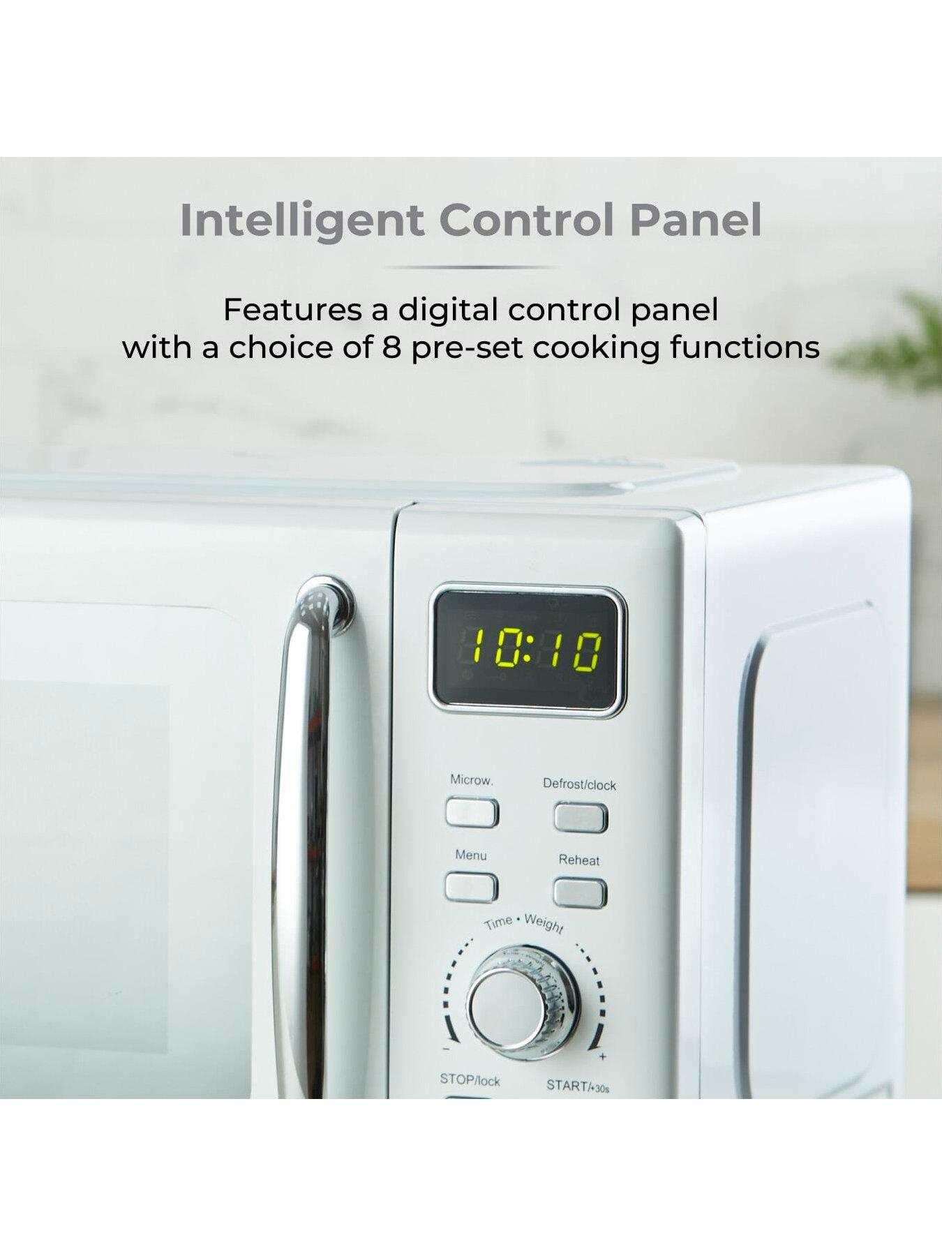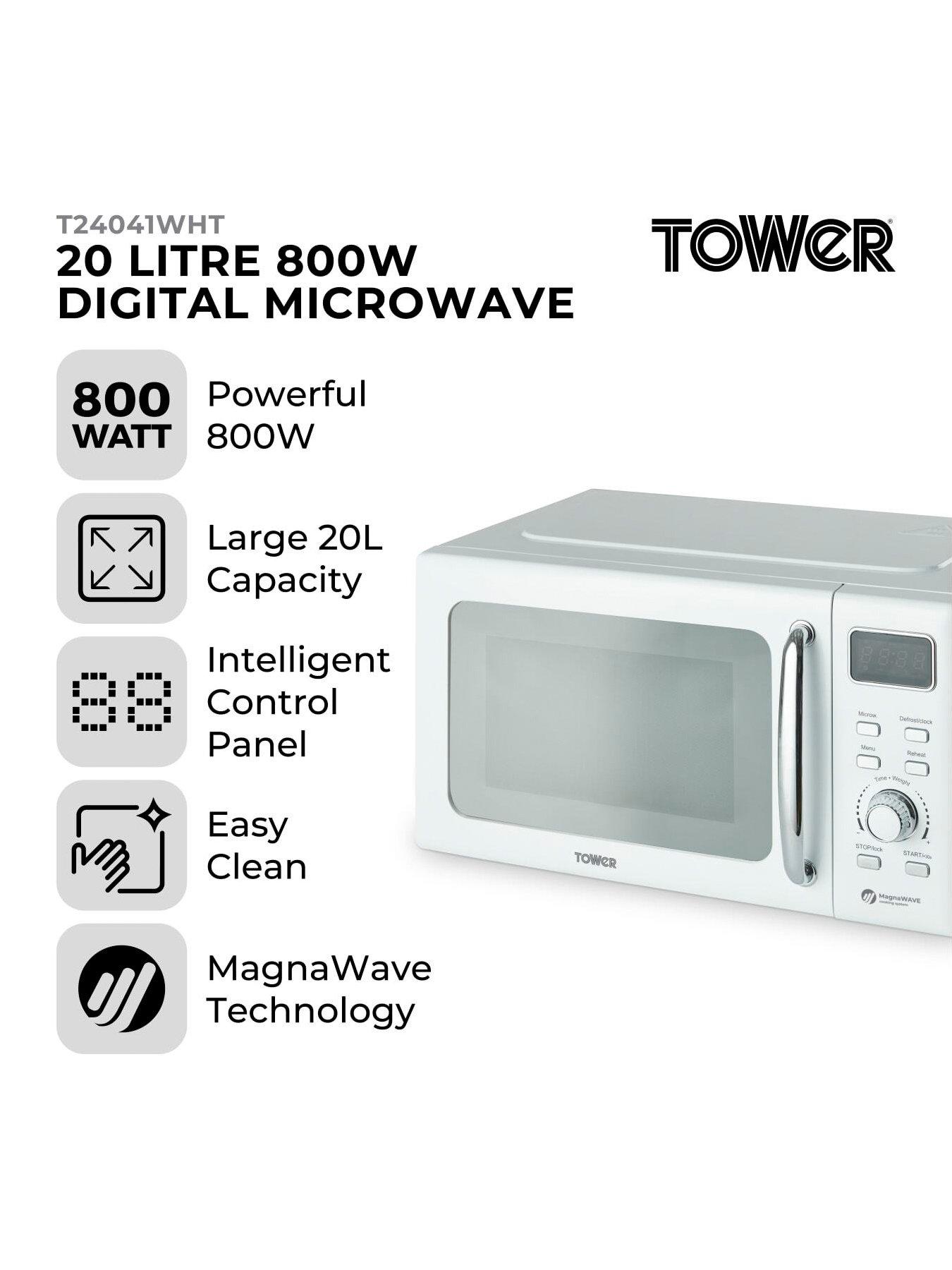 Tower T24041WHT Digital 800W Microwave - White & ChromeCook up fuss-free everyday meals for the whole family with the 20L Digital Microwave from Tower. POWERFUL 800W & 5 HEAT SETTINGS Features a powerful 800W output for faster cooking and heating, with 5 heat settings that can be adjusted to suit your needs - ideal for everyday convenient cooking 60 MINUTE TIMER & DEFROST Provides enough time to cook your meals with complete precision so they're ready to serve, whilst the defrost function cooks meals from frozen in minutes - ideal for leftovers or a speedy emergency snack MAGNAWAVE TECHNOLOGY Powered by MagnaWave technology, concentrated waves circulate to ensure heat is distributed evenly for a well-cooked meal - keeping intense flavours for amazing results with every use INTELLIGENT CONTROL PANEL & HANDLE Featuring large buttons and dial control to use the pre-set functions, defrost settings and manual selections, with a stay cool ergonomic handle for easy open and closing COOKING MADE SIMPLE The hi-tech digital display is perfect for simple and seamless cooking. The temperature & time will appear on the display and just use the dials to cycle through the cooking options for a more accurate & thorough cook. Choose from 8 cooking pre-sets for simpler cooking. Options including potato, pasta, pizza, popcorn, vegetable, beverage, meat & fish let you add some variety to mealtimes EASY CLEAN Easy to clean interior requires a simple wipe clean after use to keep your cooking space hygienic and free of any leftover food, complete with a sleek mirror door to match any modern kitchen A BRAND YOU CAN TRUST Tower is an iconic British brand boasting over 100 years of quality in manufacturing and design excellence. Tower is the UK's fastest growing SDA & Housewares brand loved by millions of households