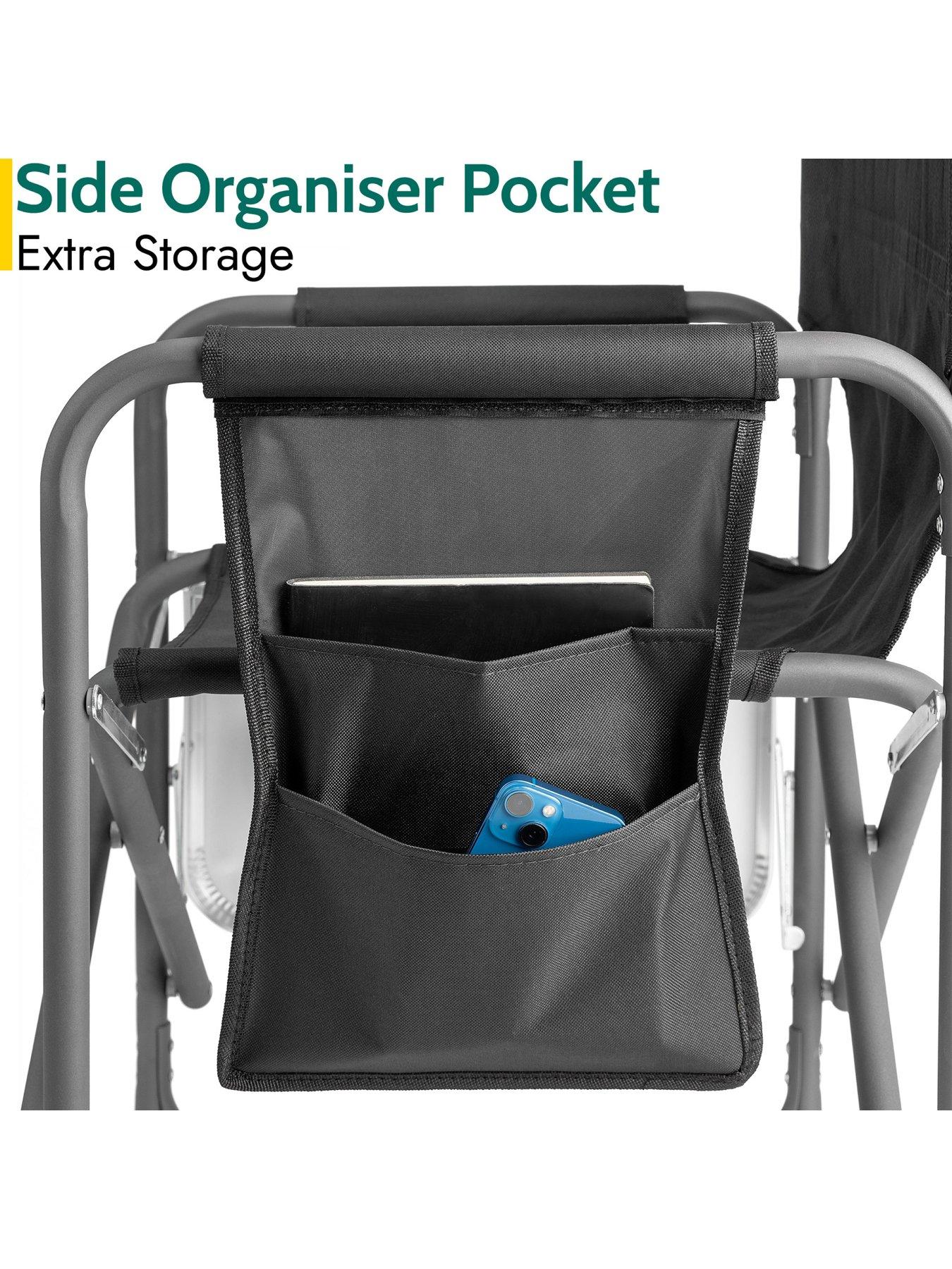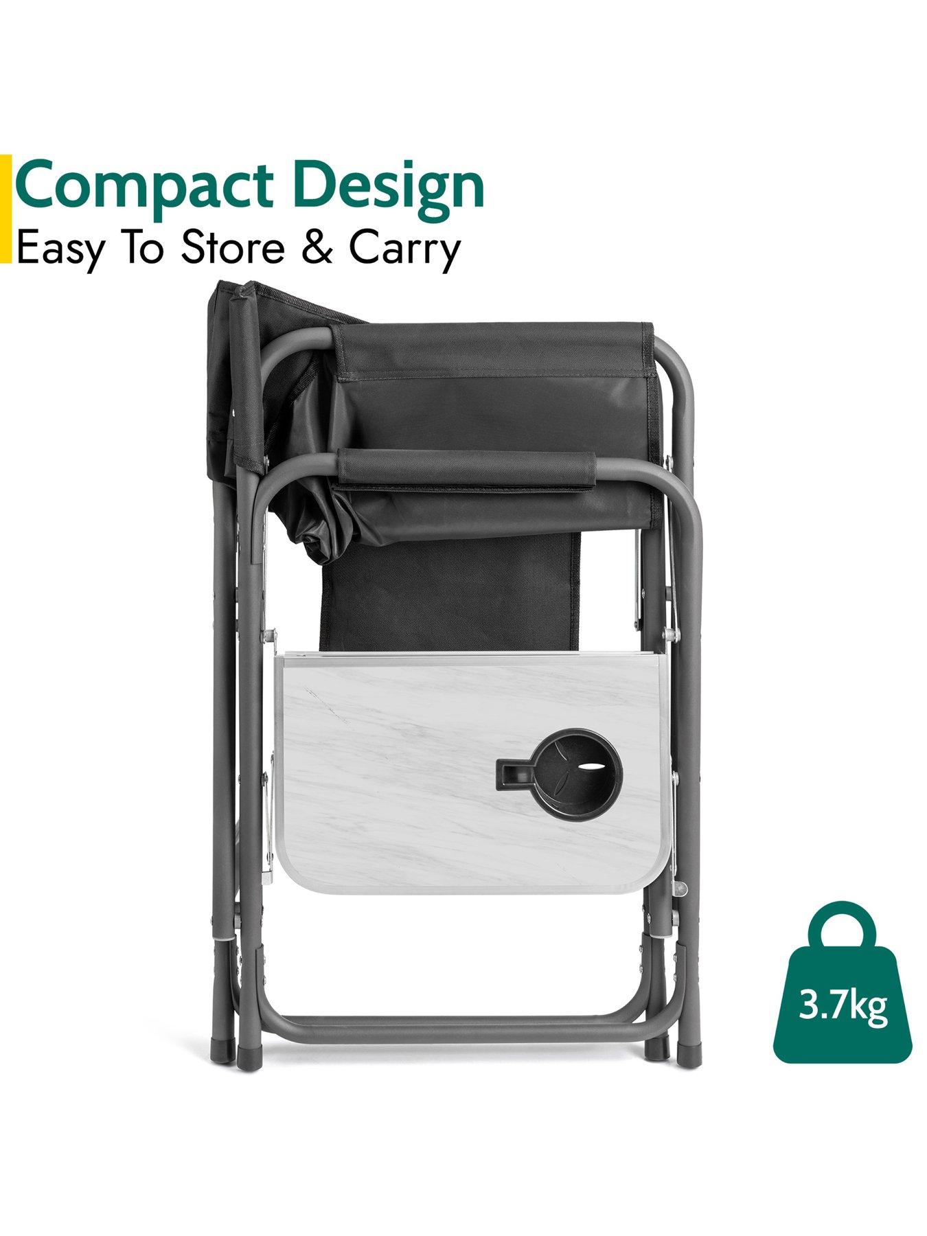Trail Folding Directors Chair with Side TableSit back and relax like a Hollywood star with this Folding Directors Chair from Trail. With a table, pocket, and holder for a drink, it has all the creature comforts you need when relaxing in the sunshine. Plus, it's fast and easy to set up and fold away, making it perfect for camping trips, outdoor events, garden use, and more.Strong Steel Frame Designed with all-in-one folding frame for a fast, easy set up. Made from steel for superior strength and stability. Plus, it's powder-coated for enhanced rust-resistance and long-lasting outdoor use. Durable Seat & Back Features a durable 600D polyester all-in-one seat and back support with a water-resistant PVC coating. Plenty of flex for optimal comfort when seated, plus easy to wipe clean whenever it gets dirty. Padded Armrests Foam padded armrests lift comfort to a whole new level when you're relaxing on outdoor adventures. As an added extra, each armrest has a fabric cover to protect the foam padding from wear and tear. Fabric Side Pocket Forget about getting up to fetch your belongings because the chair features a handy pocket to keep them by your side. The pocket is a perfect size for storing a book, phone, tablet, and other smaller items. Locking Side Table Keep larger items on the chair's folding side table which has locking hinges for optimal support. Made from hardwearing MDF with aluminium edging for extra strength and a wipe-clean laminate surface. Inset Cup Holder As an added extra, the table features an inset cup holder to keep a hot or cold drink by your side. Keeps a drink securely in place to avoid unwanted spillages, even if you're using the chair on bump ground.