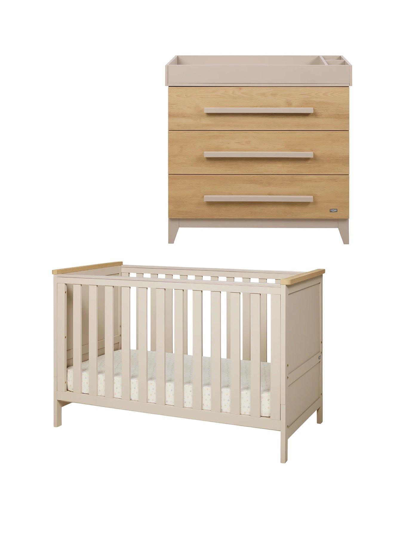 Tutti Bambini Misha 2pc Room Set - Golden Oak / MushroomA 2pc set - includes a cotbed and chest changer.The set includes the Misha Cot Bed - timeless elegance with thoughtful functionality to create the perfect centrepiece for your baby's nursery. Designed to grow with your little one, it transitions seamlessly from a cot to a toddler bed and then into a stylish sofa bed, offering years of versatile use. With three adjustable mattress positions, this cot bed adapts to suit your baby's changing needs, making it a practical choice for your family. The cot bed requires a mattress 140 x 70cm (sold separately) The Hallee chest changer is a generous set of 3 drawers with a removable changing top. Ideal for storing all of your baby's essentials for many years. The changing top will accommodate a changing mat up to 87 x 47cm