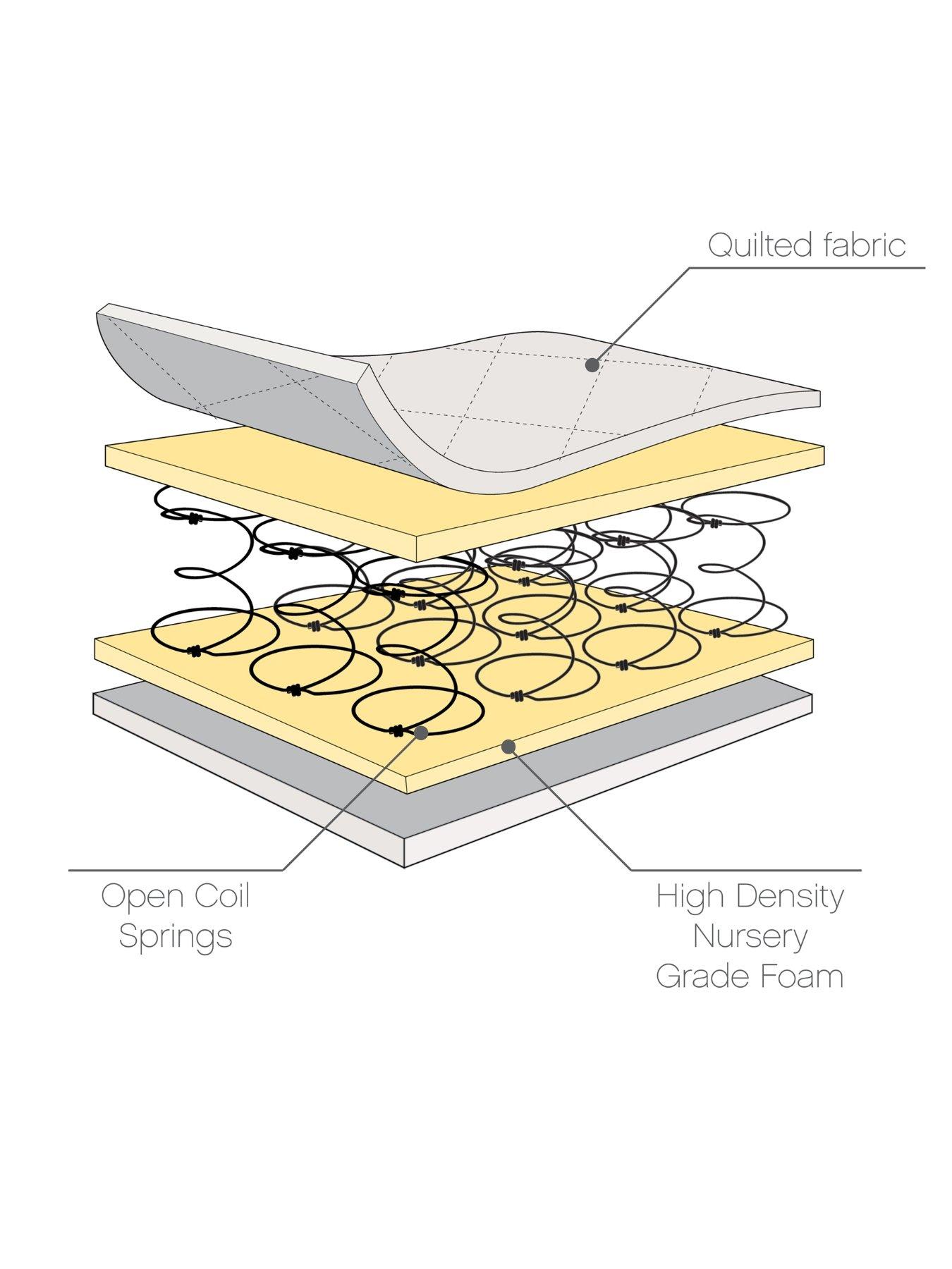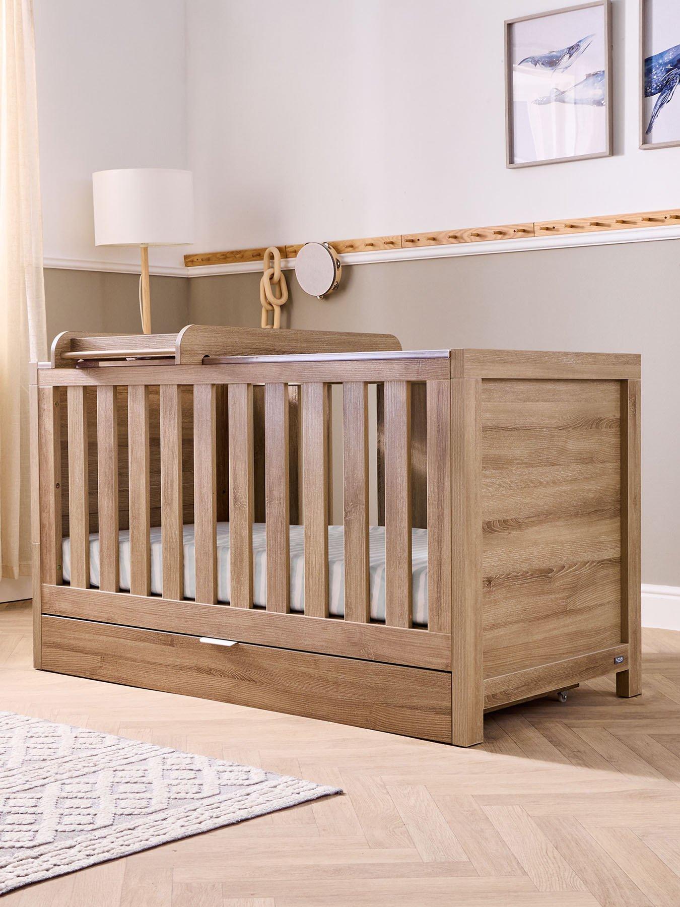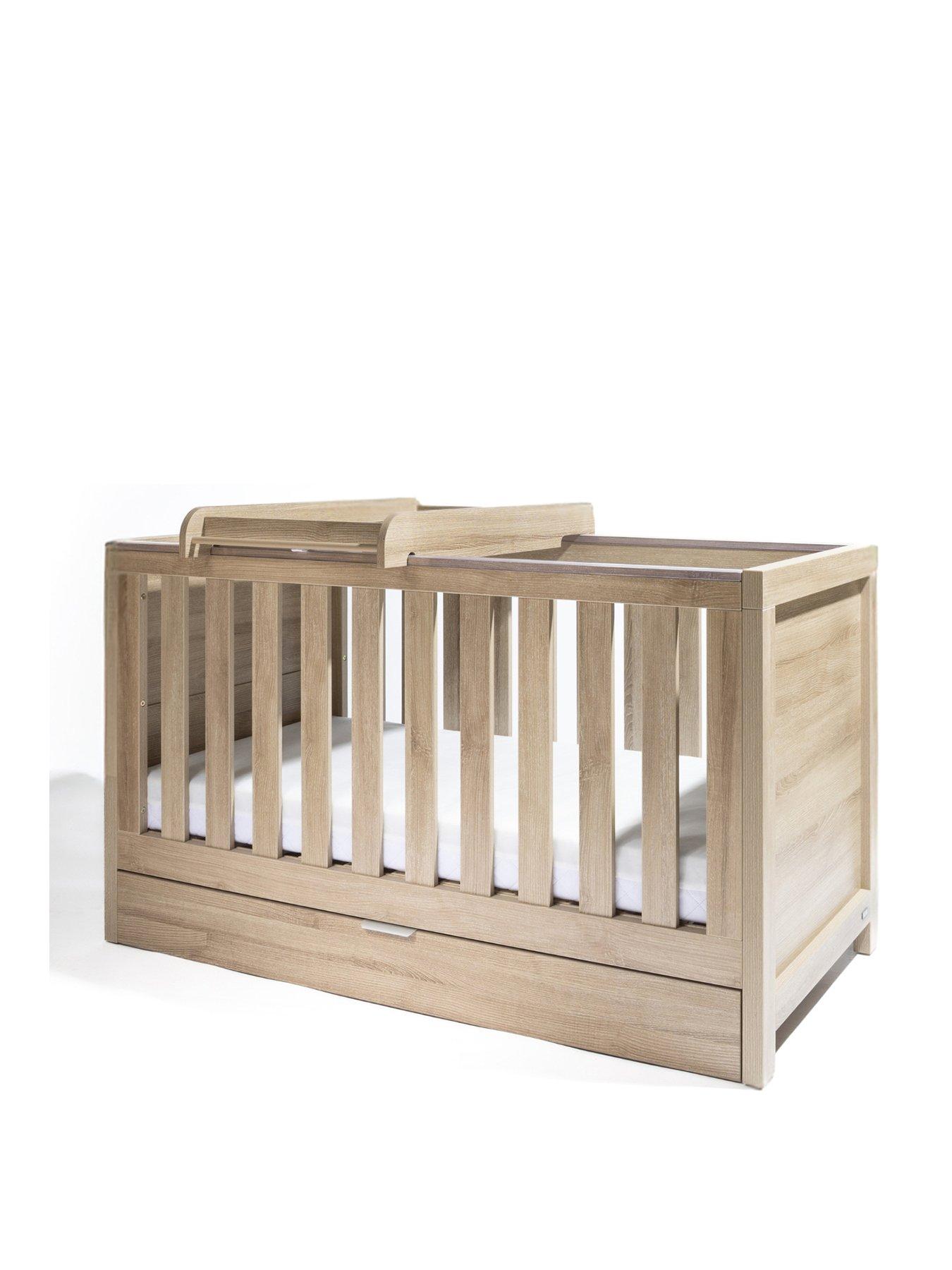 Tutti Bambini Modena Oak Cot Bed with Drawer, Cot Top Changer and MattressA full size cot bed with a handy cot top changer, underbed storage drawer and a sprung mattress included. An ideal space saving solution for your baby’s nursery.Featuring clean lines and a contemporary style, the Modena 3 in 1 cot bed is a versatile choice, designed to complement any nursery aesthetic. Designed for longevity, the Modena cot bed coverts to a toddler bed and a sofa, supporting your little one for many years to come. The addition of an underbed storage drawer provides useful extra storage for your baby's essentials. Included with the cot bed is the Tutti Bambini Sprung Mattress (140 x 70cm) designed to give your baby a cosy, safe, peaceful night’s sleep. The mattress supports a natural posture and is quilted with a polyester filling to avoid perspiration and leave your little one feeling cool and comfortable. The matching Oak cot top changer is easily attached to the top of your cot bed, the ideal height and facing position to make changing and dressing your baby comfortable every time.