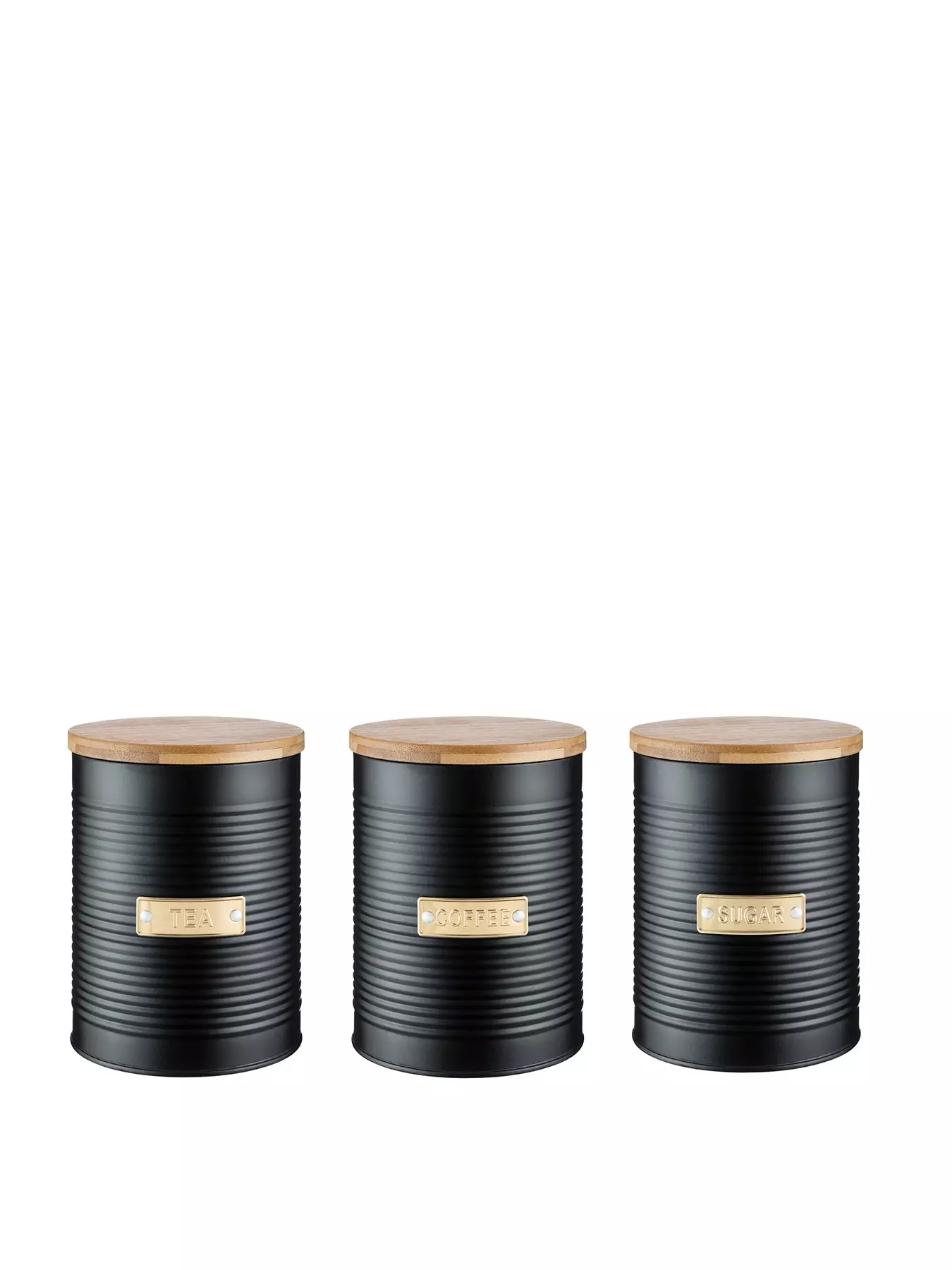 Inject some contemporary beauty into your kitchen with this set of three storage canisters from Typhoon.Made from hardwearing carbon steel, each one features a ribbed design and is finished in a striking ebony colour scheme. All three feature golden-toned plates reading tea, coffee or sugar across the side, and the bamboo lids have silicone seals to keep contents fresh.