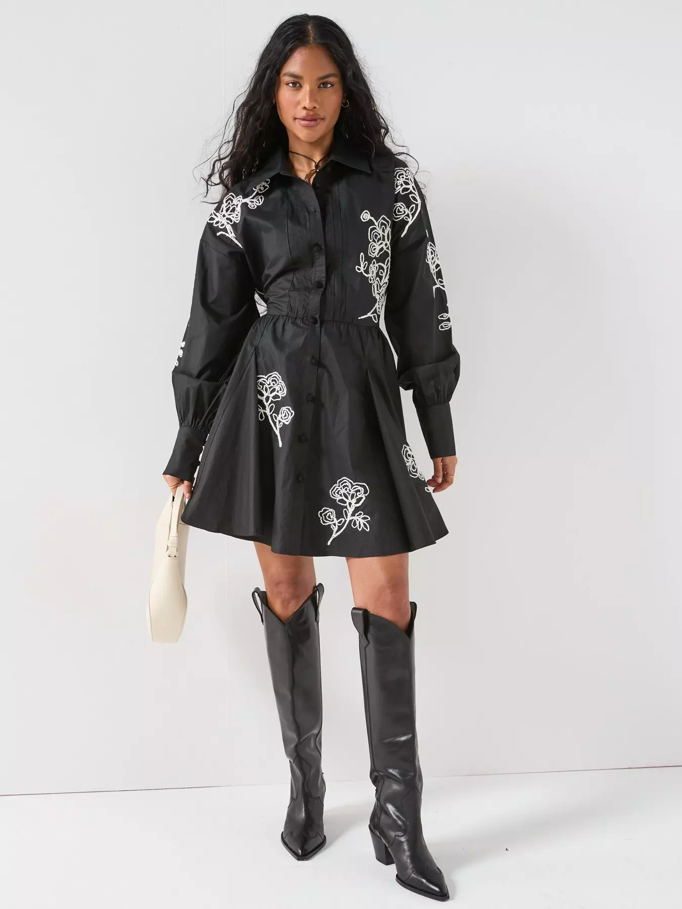 V by VeryContrast Embroidered Mini Shirt Dress - Black